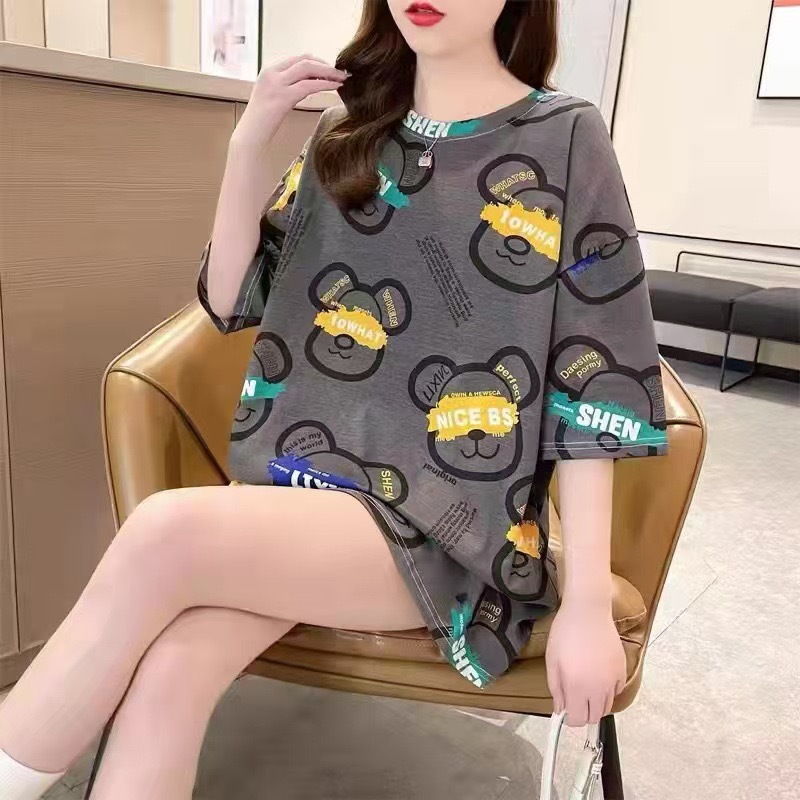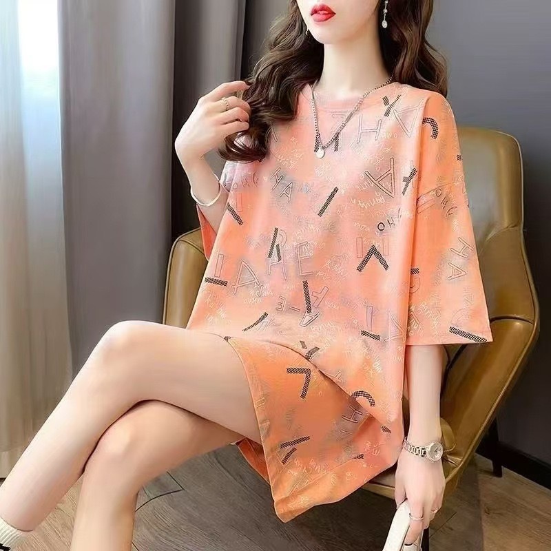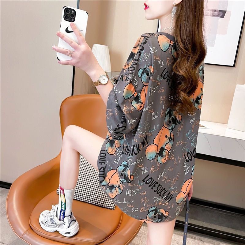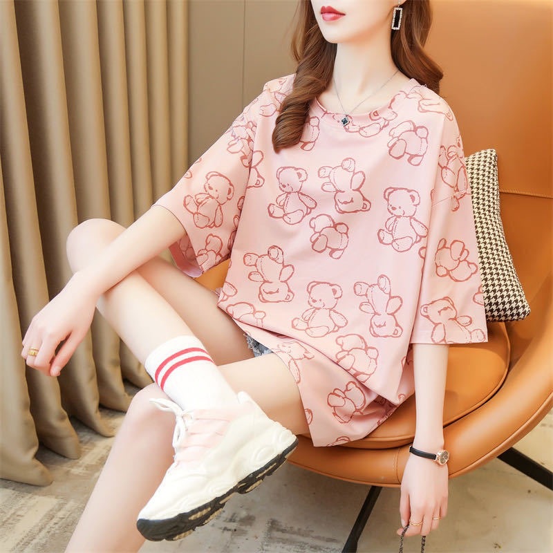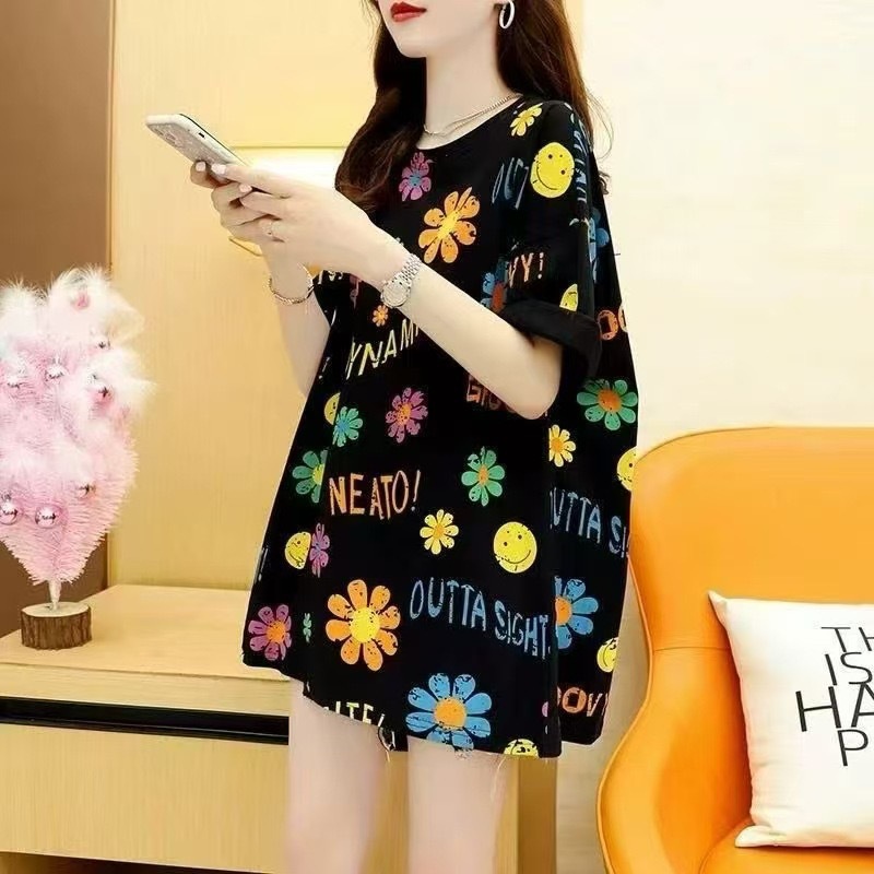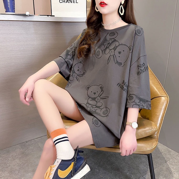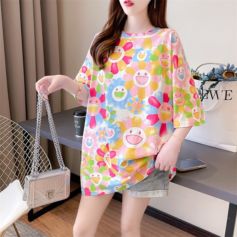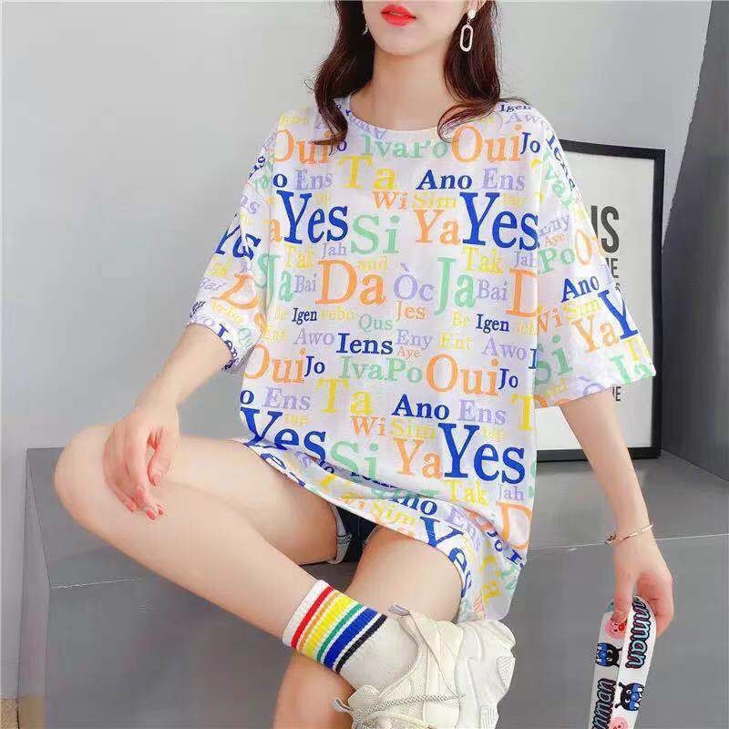 Главная страница > Новая стильная летняя футболка для девочек и студентов, женская женская тонкая свободная футболка средней длины с короткими рукавами больших размеров в корейском стиле с принтом