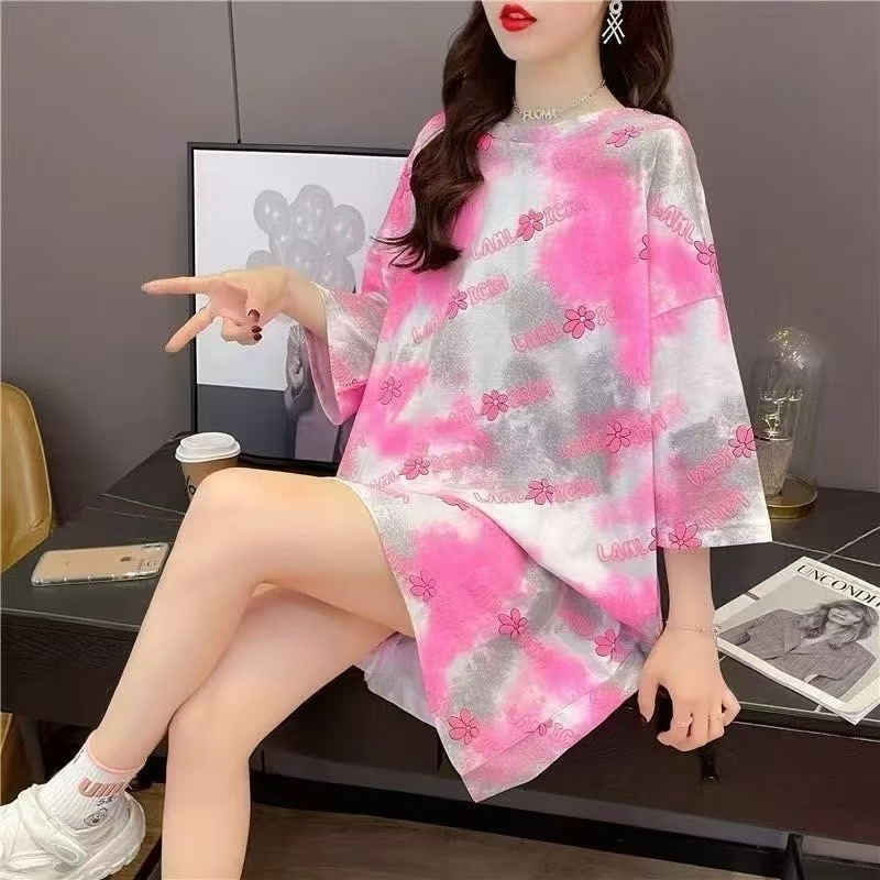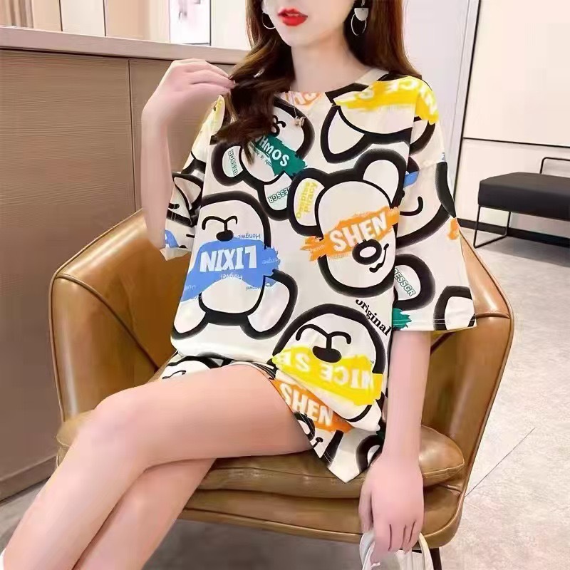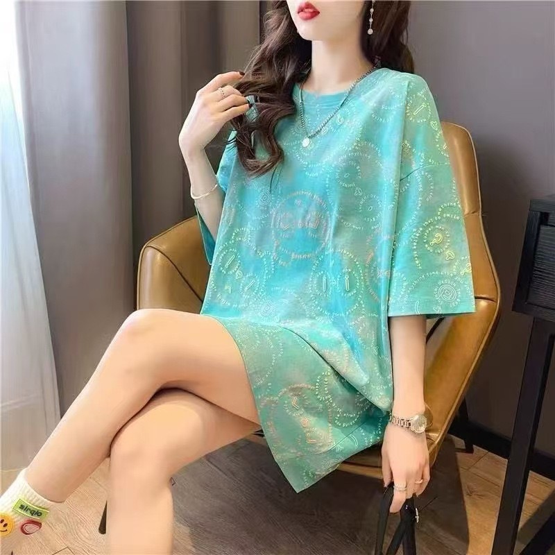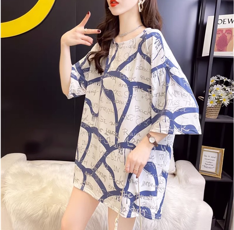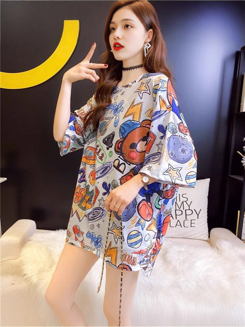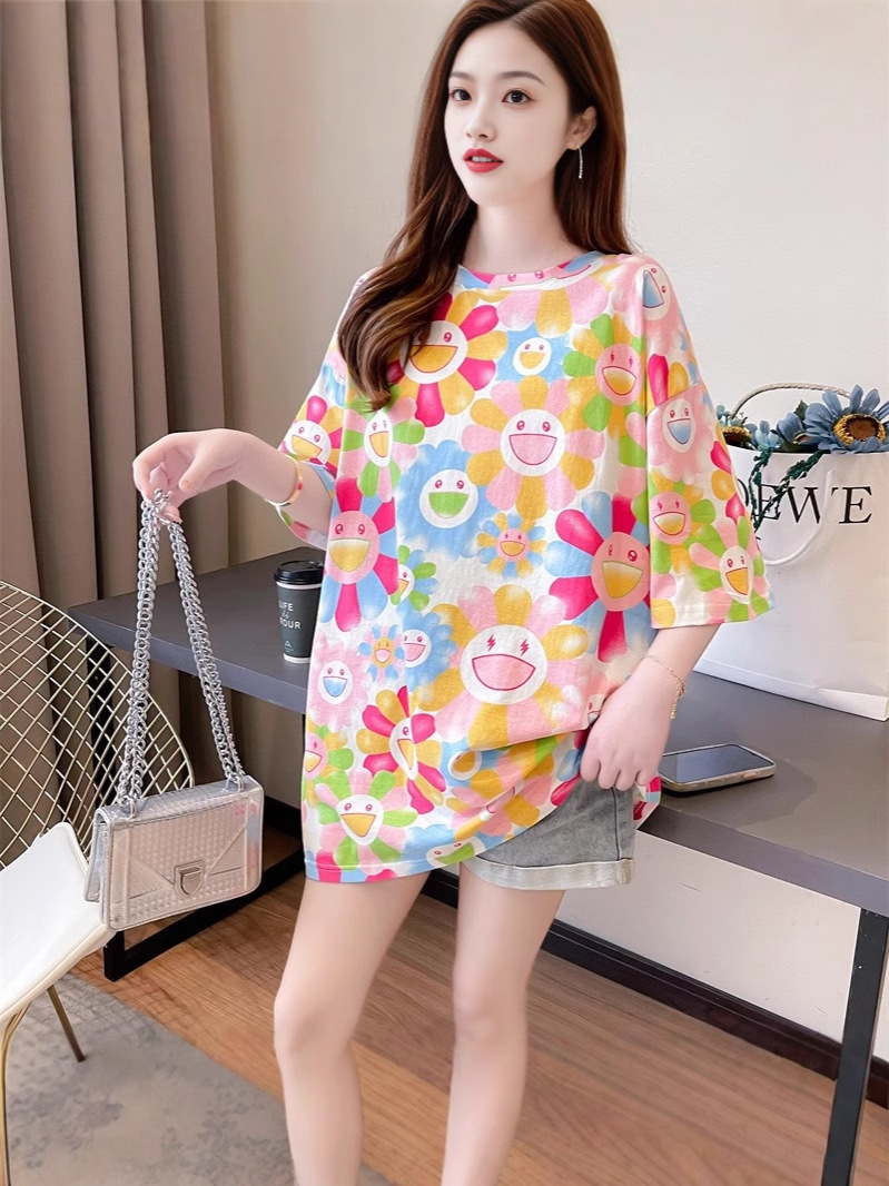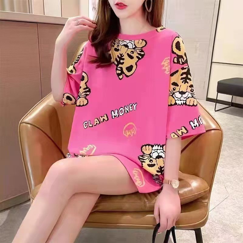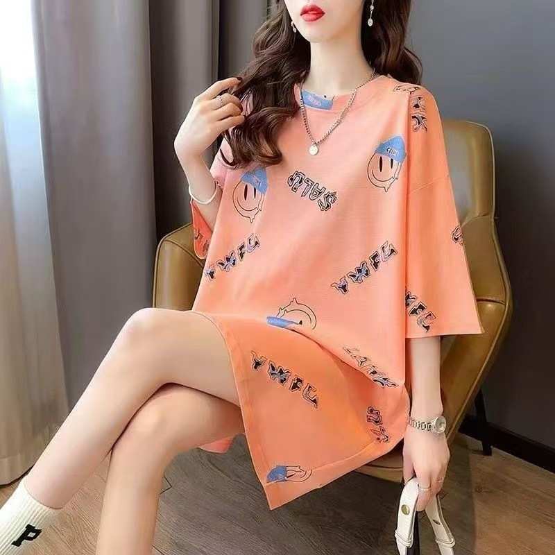 Главная страница > Новая стильная летняя футболка для девочек и студентов, женская женская тонкая свободная футболка средней длины с короткими рукавами больших размеров в корейском стиле с принтом