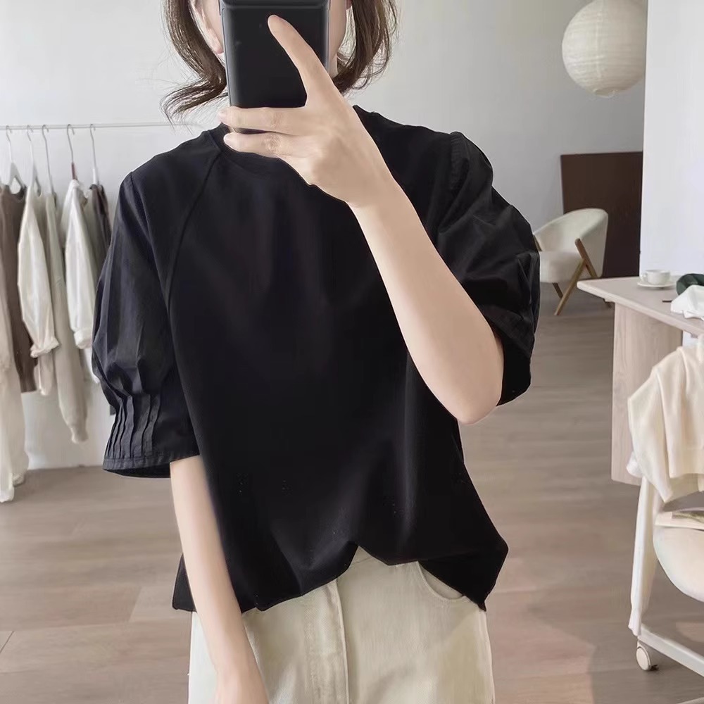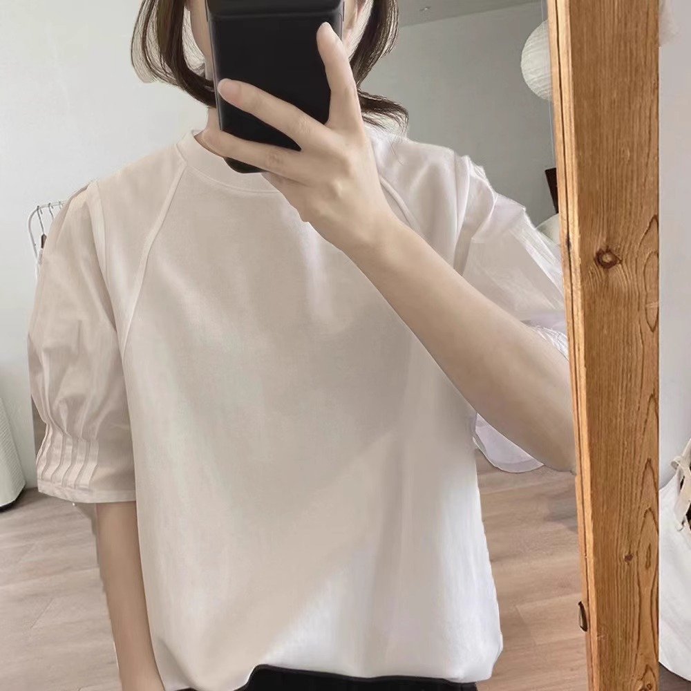 Главная страница > Белая женская футболка с рукавами-фонариками, летняя свободная футболка с короткими рукавами, закрывающая живот, утягивающий дизайн с круглым вырезом, топ с половиной рукавов