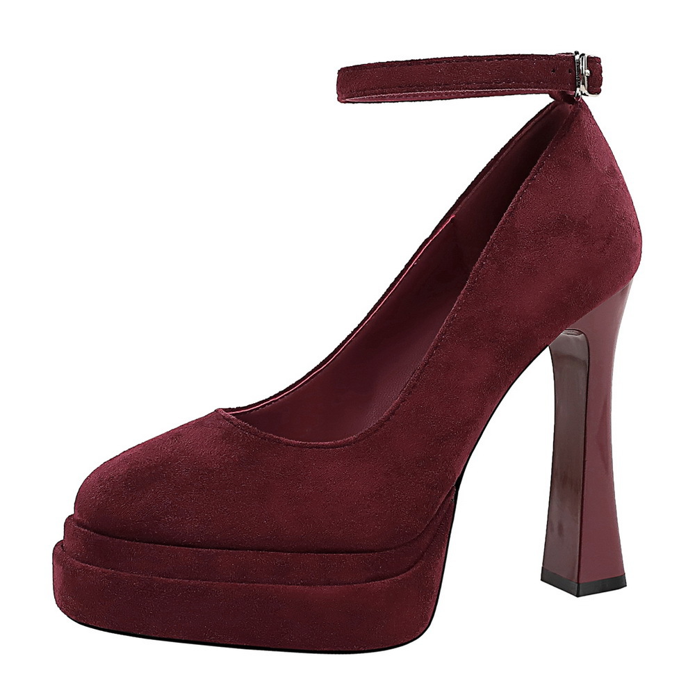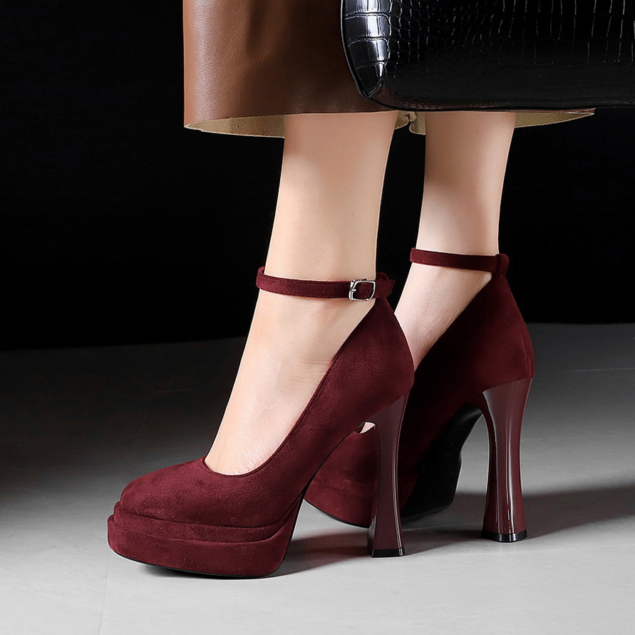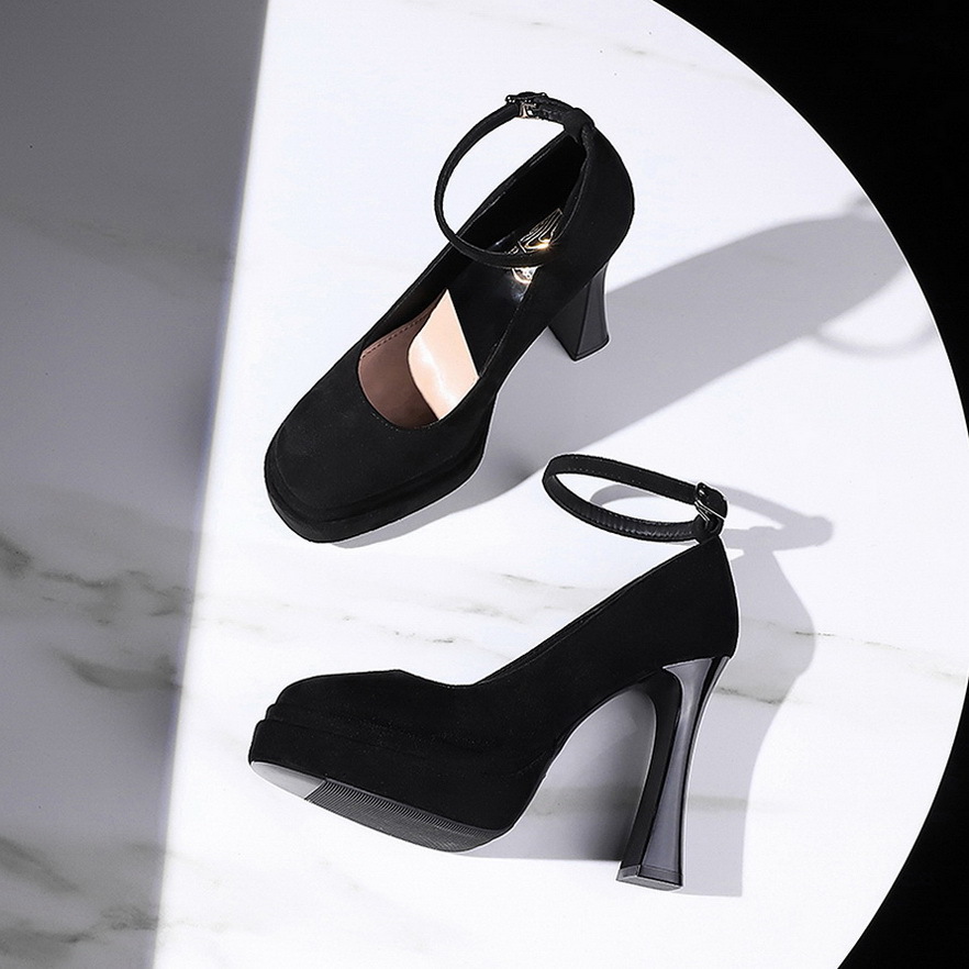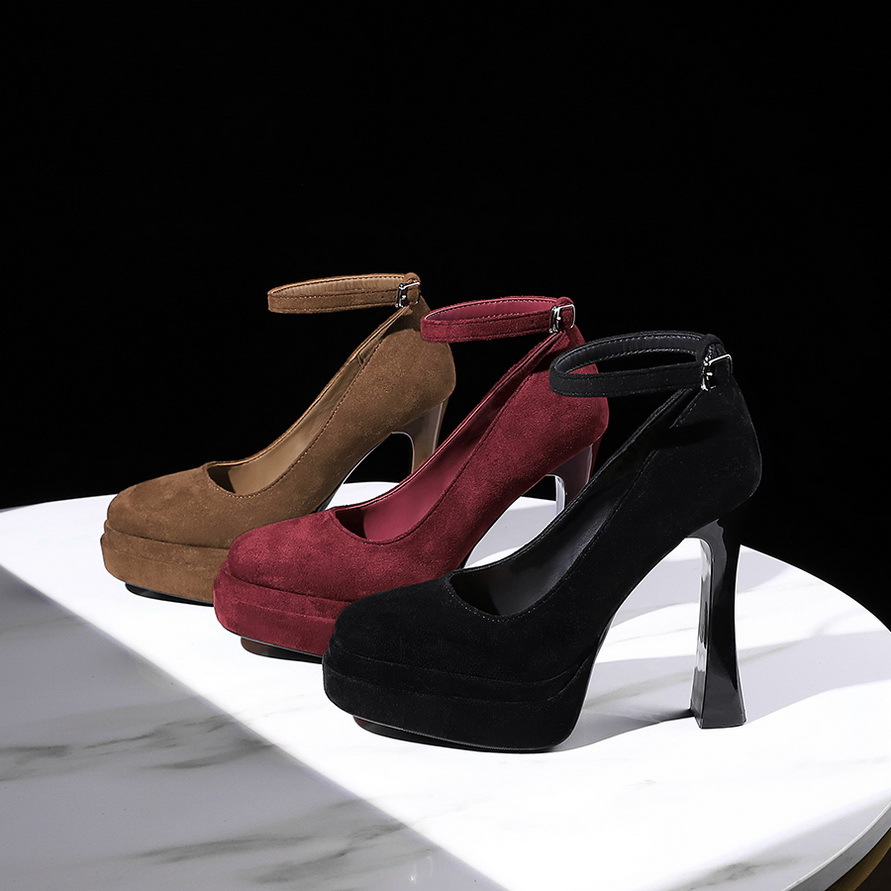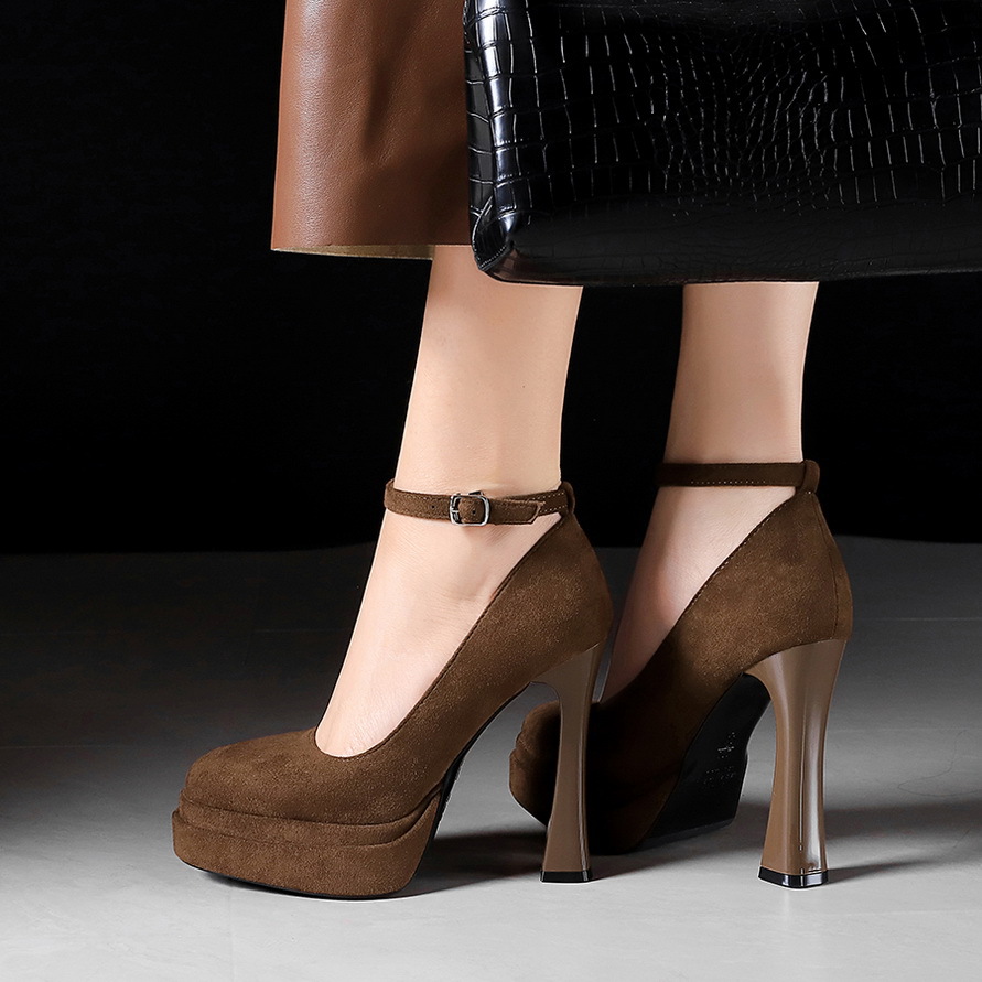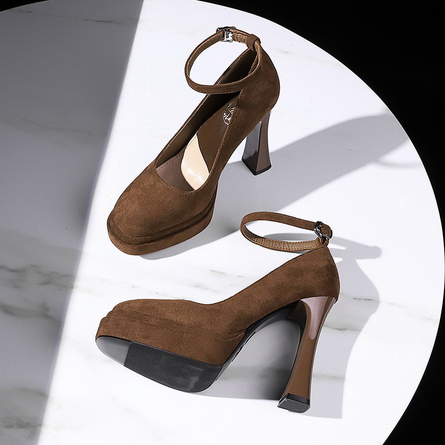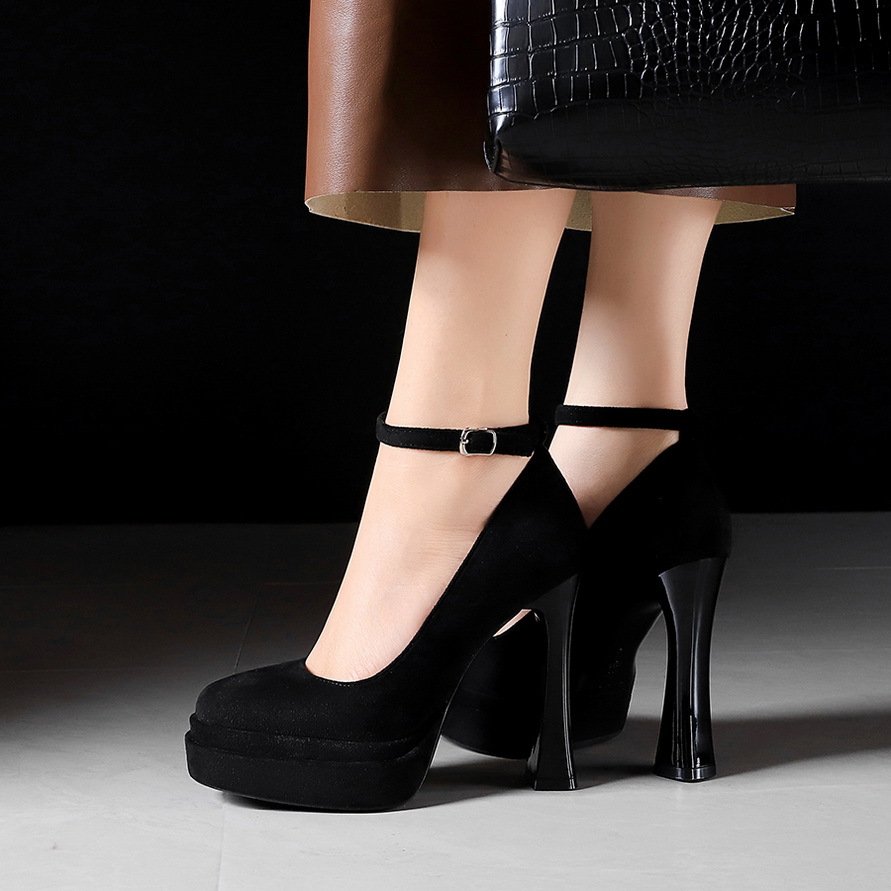 8382 сладкая пряжка водонепроницаемый стол высокие каблуки женские толстые каблуки светло-замшевые одиночные туфли с круглой головкой супер высокие каблуки женские туфли