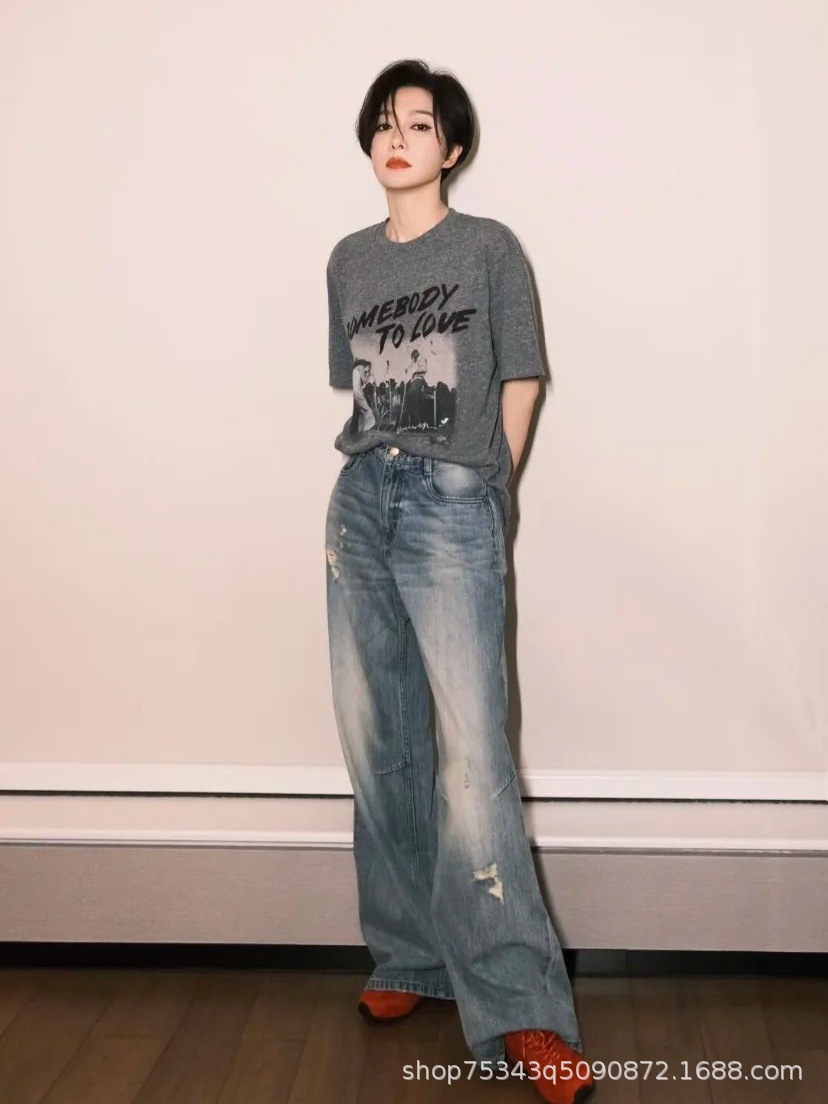 Главная страница > Чистая оригинальная футболка Qin Lan в том же стиле MC2025, новая весенняя рваная футболка из чистого хлопка с принтом в стиле ретро, с короткими рукавами, сделанная в Гуандуне