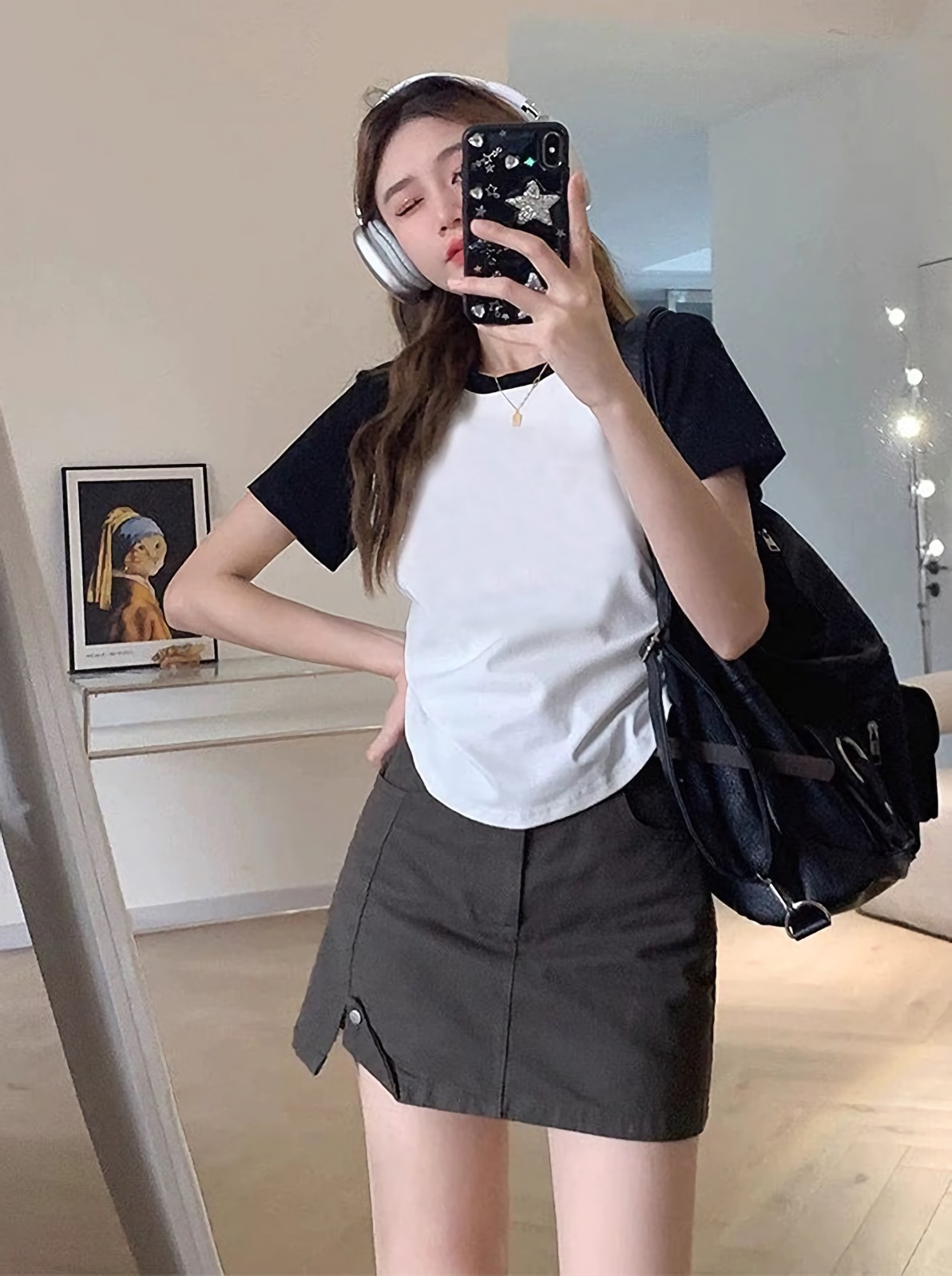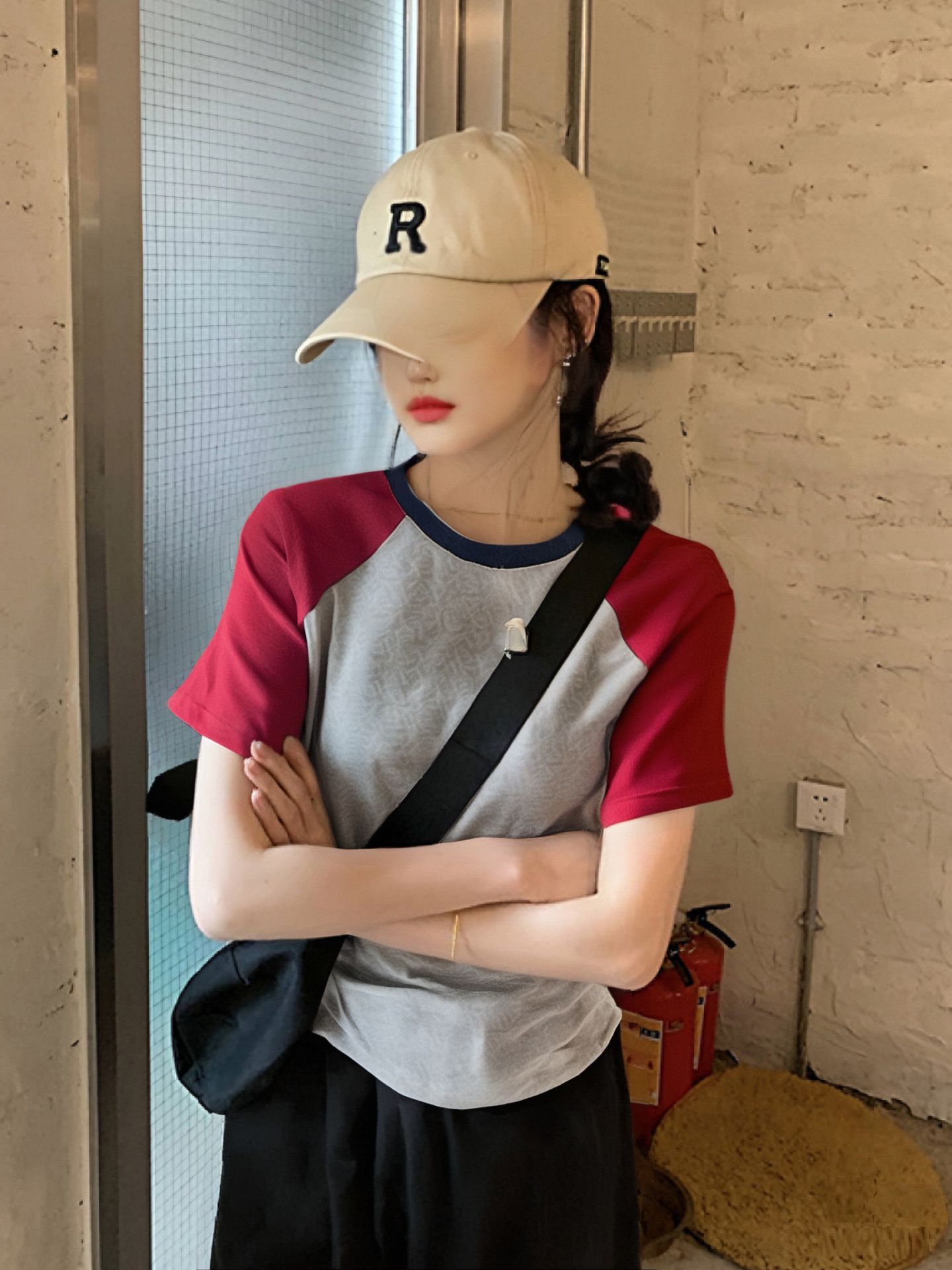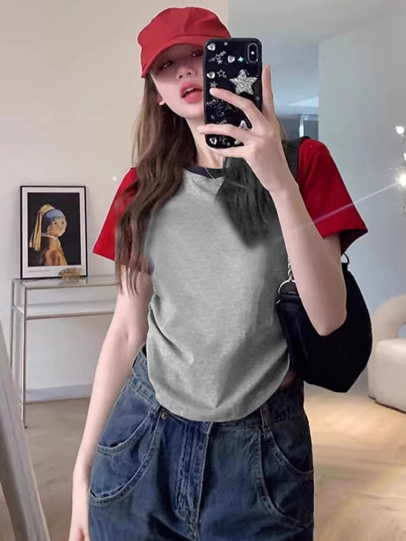 Главная страница > Женская футболка с круглым вырезом и контрастными рукавами реглан, летняя женская футболка с короткими рукавами в американском стиле, миниатюрная, с морщинистой талией, дизайн для горячих девушек, топ