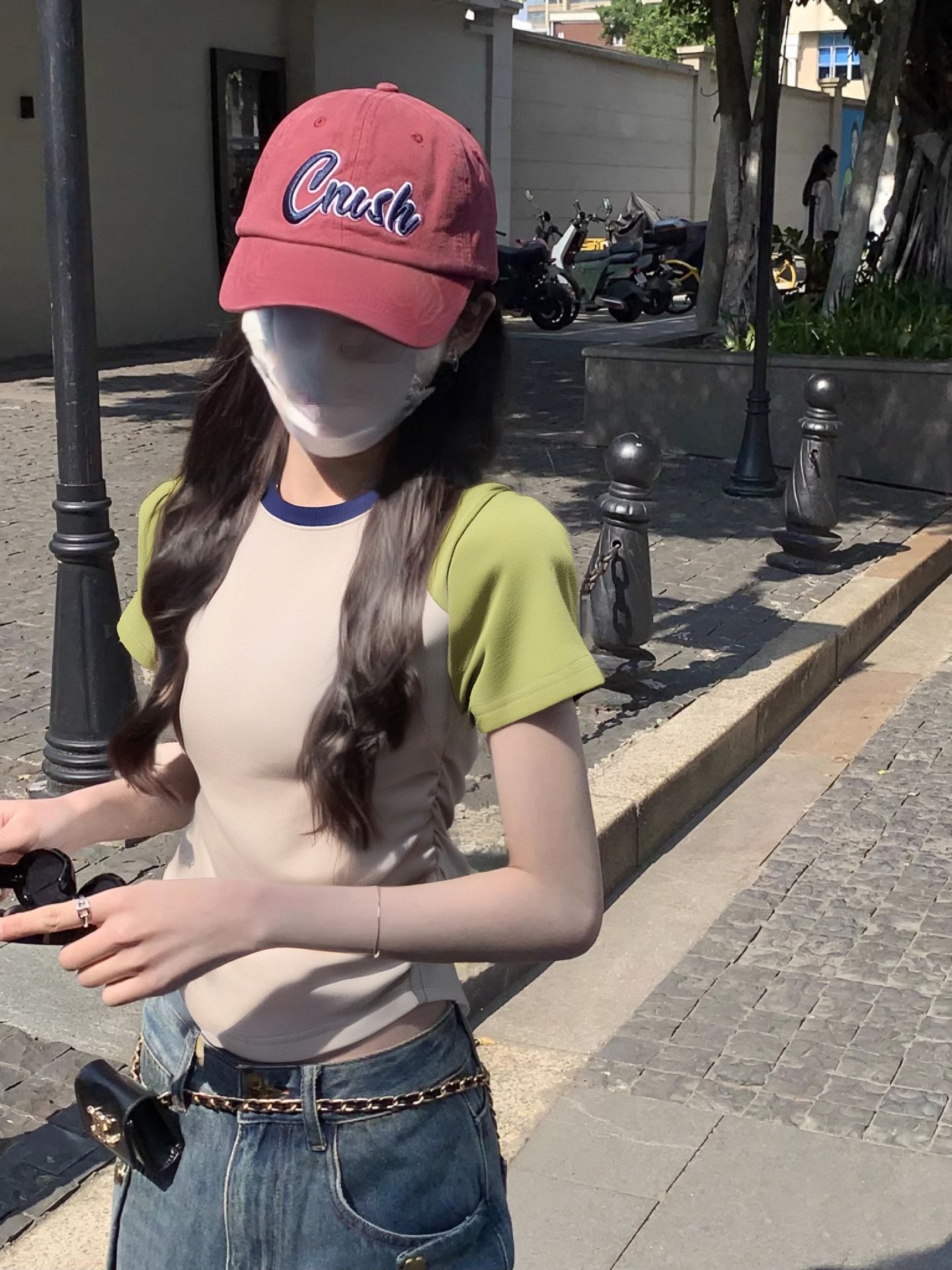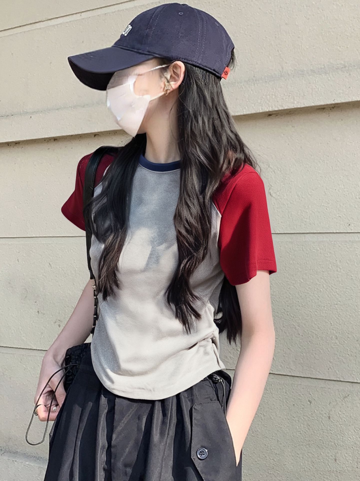 Женская футболка с круглым вырезом и контрастными рукавами реглан, летняя женская футболка с короткими рукавами в американском стиле, миниатюрная, с морщинистой талией, дизайн для горячих девушек, топ
