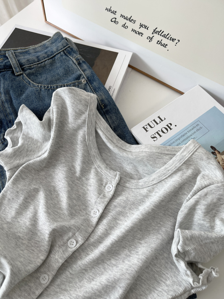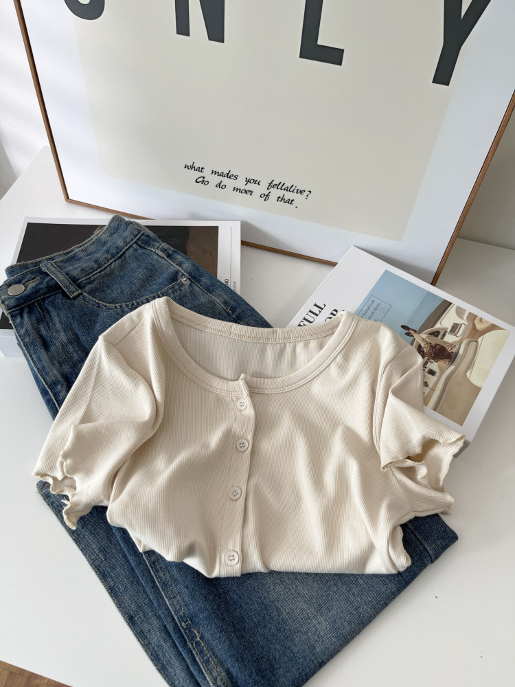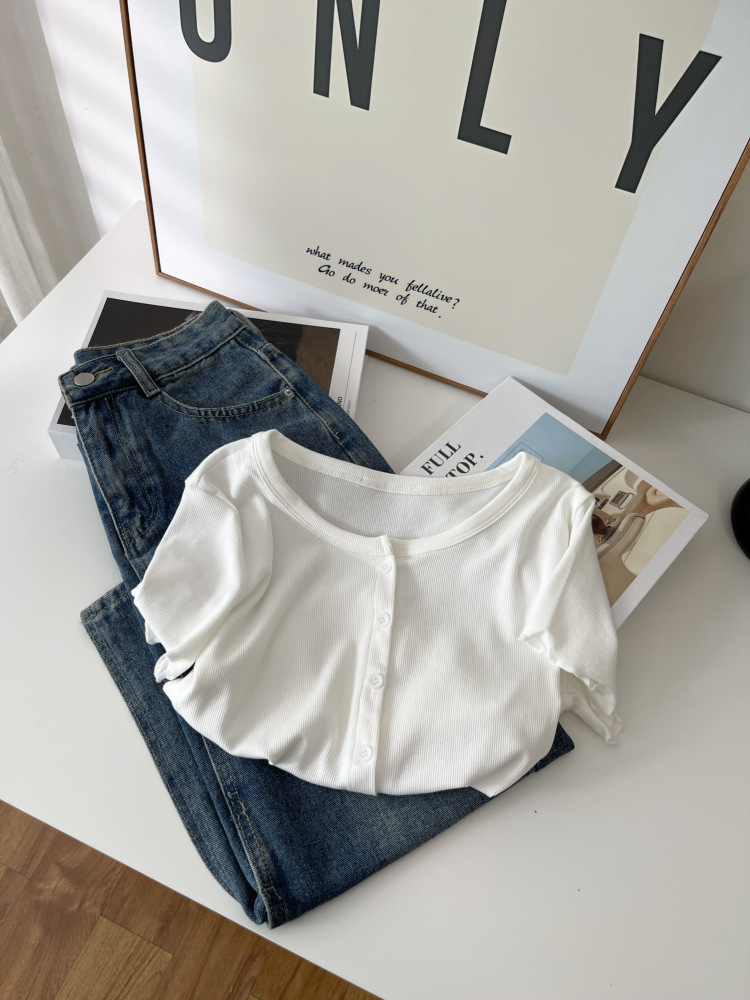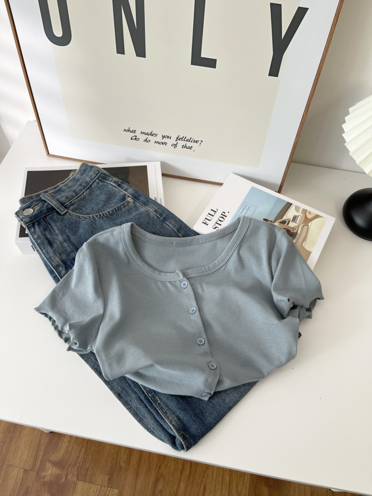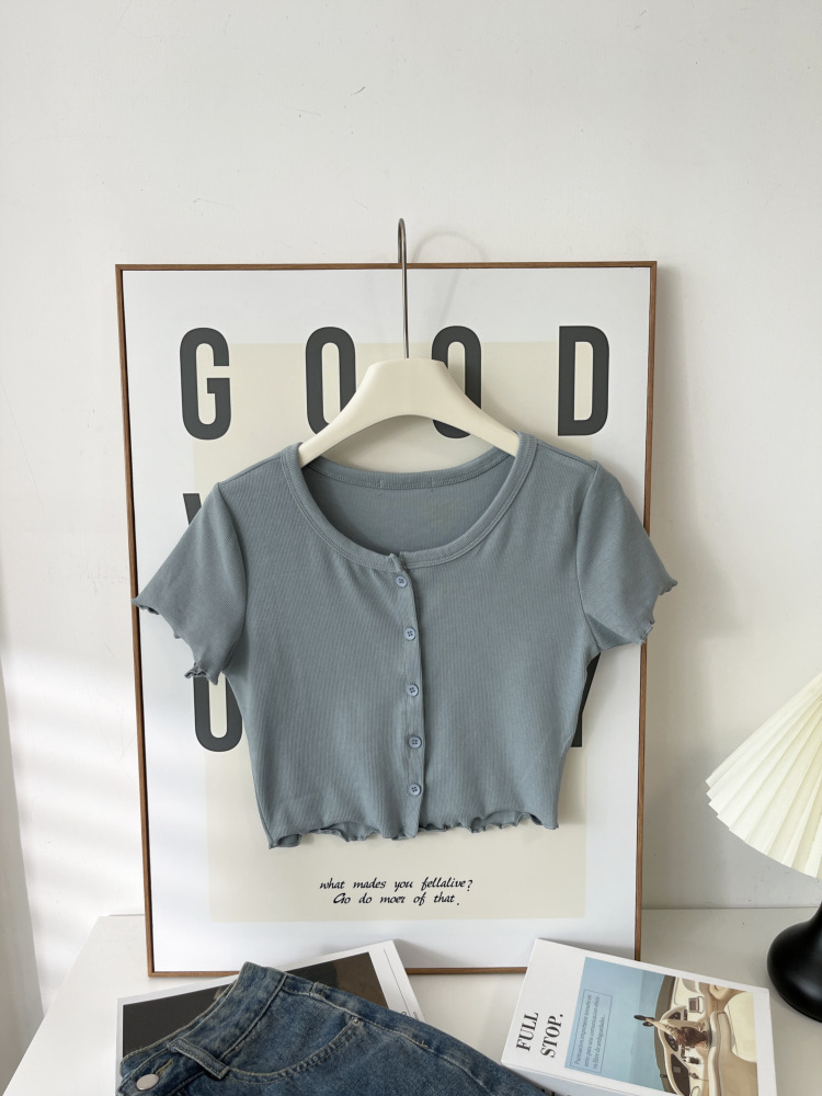 Главная страница > Правое плечо в корейском стиле, однотонная футболка с высокой талией и круглым вырезом, облегающая футболка из чистого хлопка, женский топ с короткими рукавами 5970