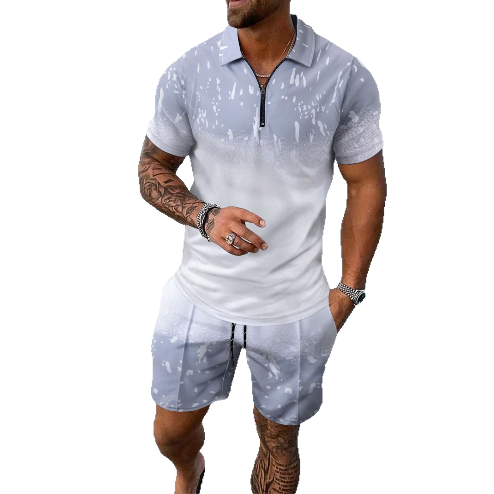 Летний мужской костюм 2025 Amazon: новый цифровой принт, шорты с коротким рукавом и молнией, двухкомпонентный комплект