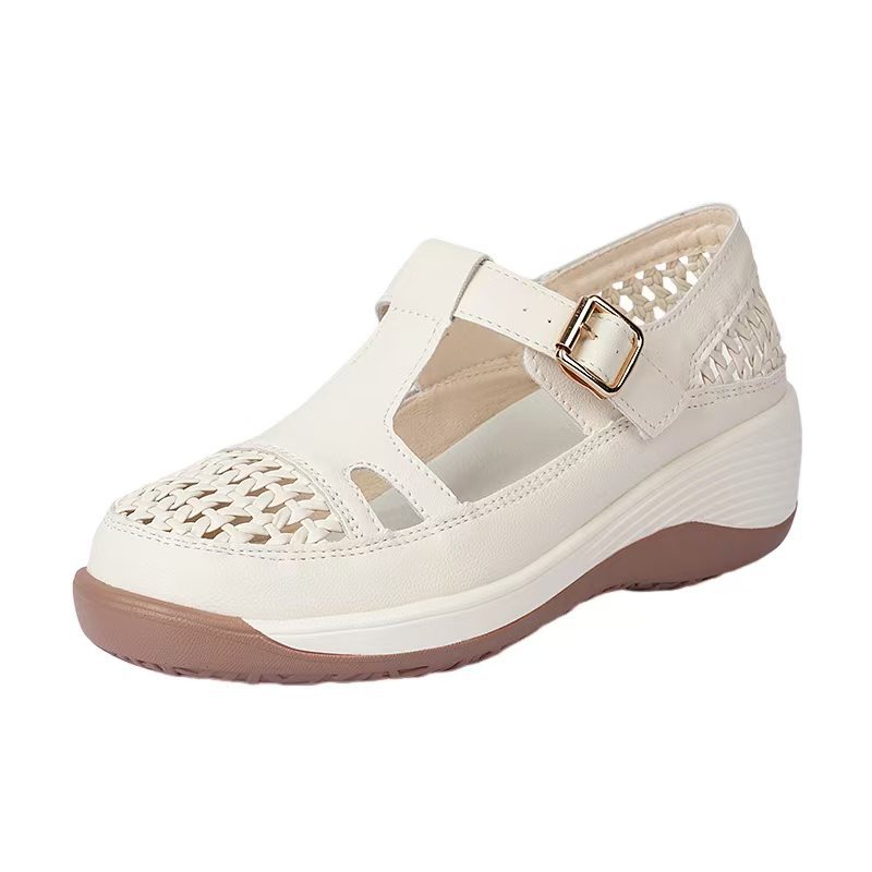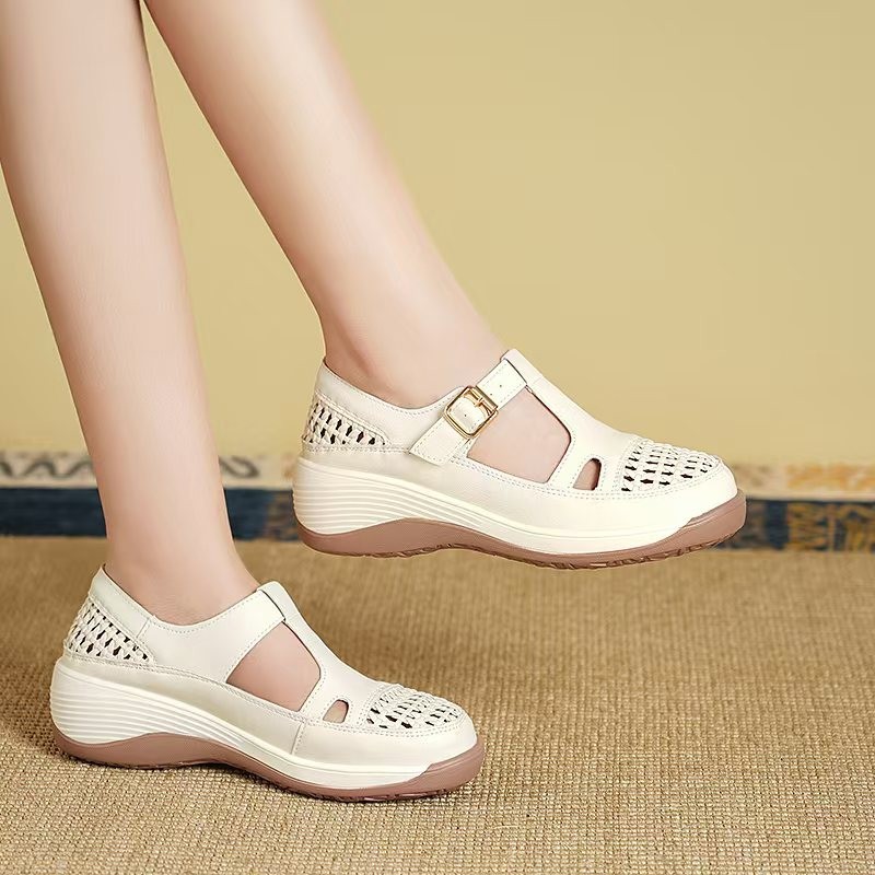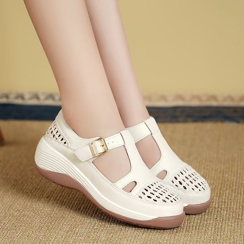 Главная страница > Белые мягкие кожаные сандалии Baotou для женщин 2025, новые летние плетеные с вырезами, на толстой подошве, на клиновидном каблуке, мягкая подошва, женские повседневные туфли