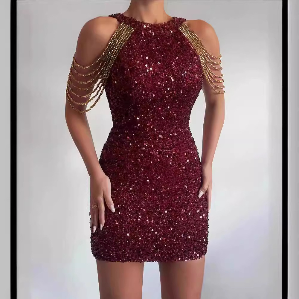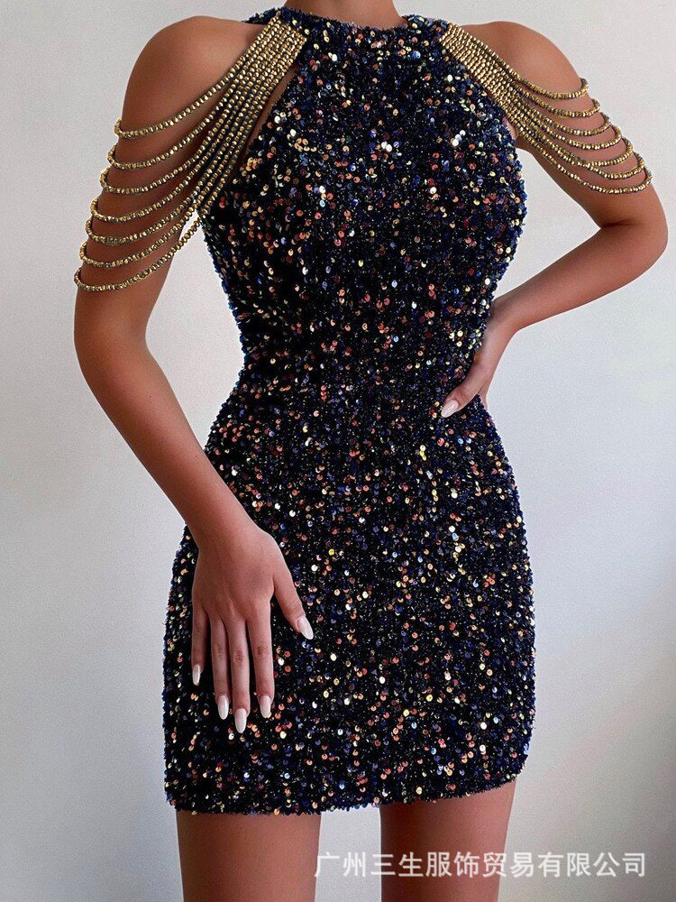 Главная страница > Новое модное платье-халтер с сексуальной цепочкой из кристаллов, закрывающее бедра, с пайетками, в европейском и американском стиле, средней посадки, вечернее платье весна-лето 2025 года