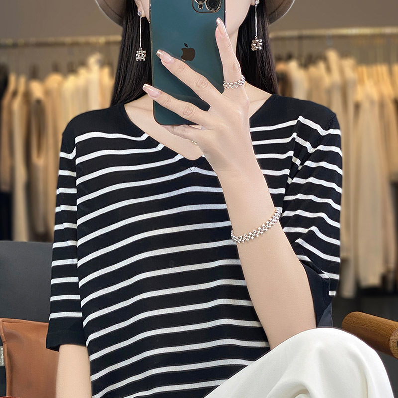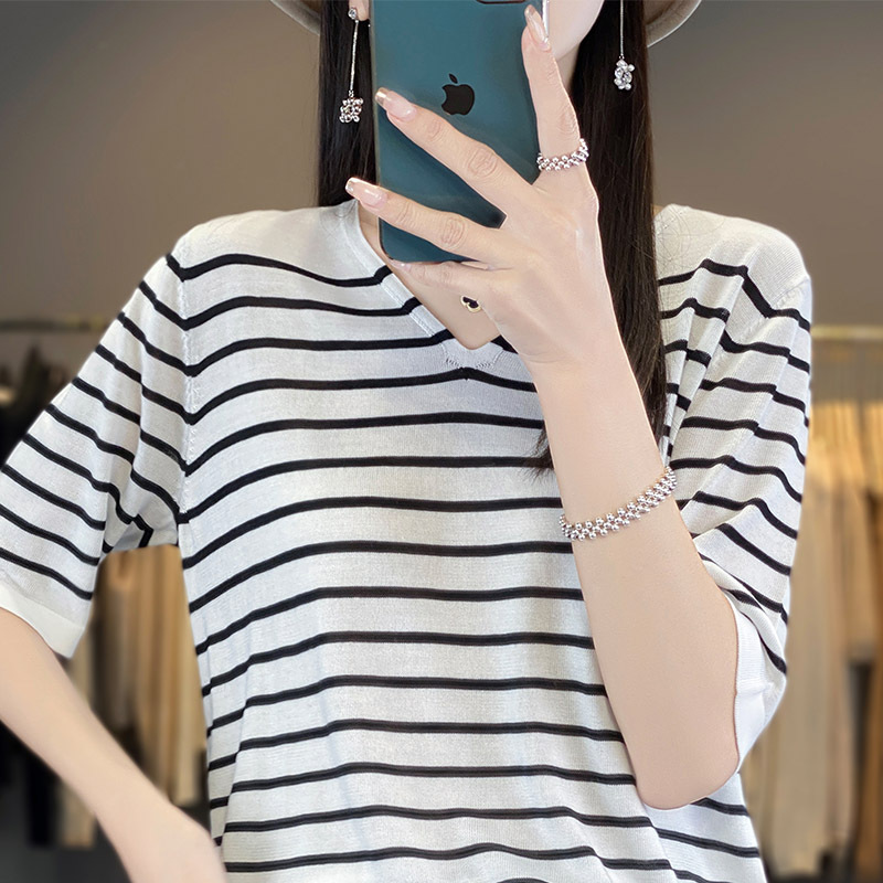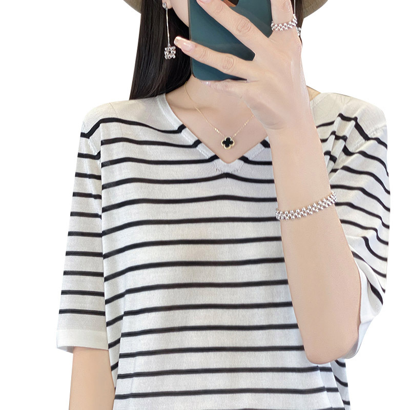 Главная страница > Летняя новая дышащая потная шелковая женская короткая рубашка с V-образным вырезом в полоску короткая футболка вязаная дикая рубашка с короткими рукавами оптом