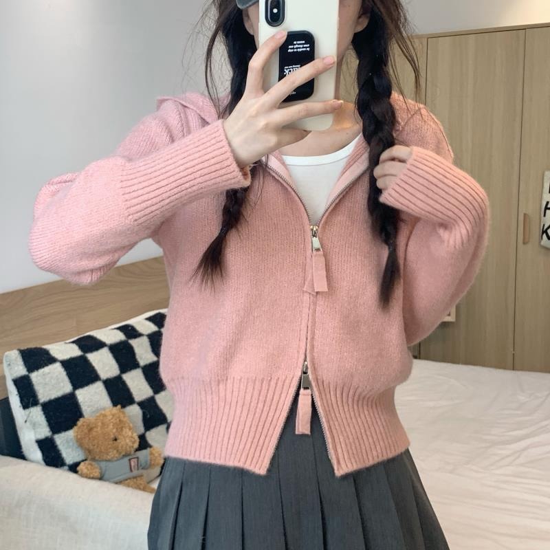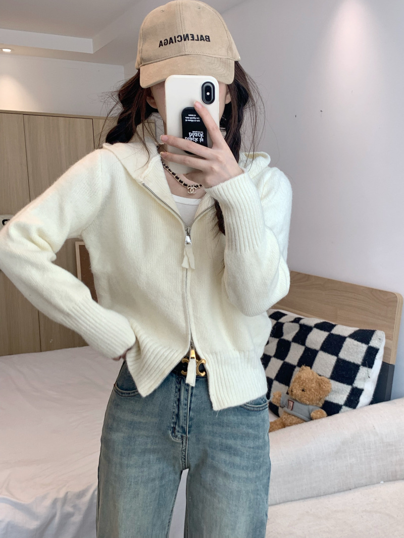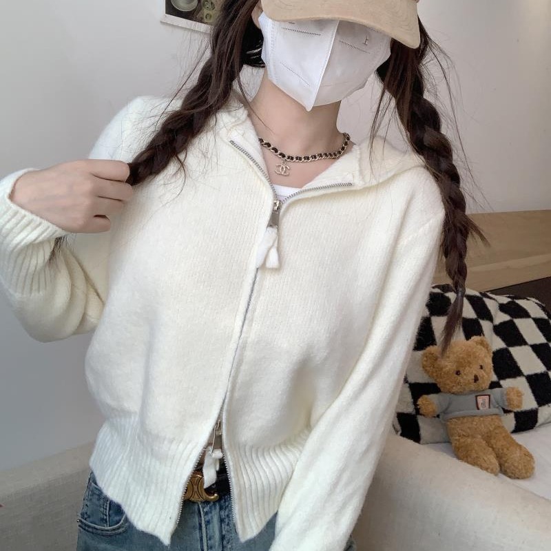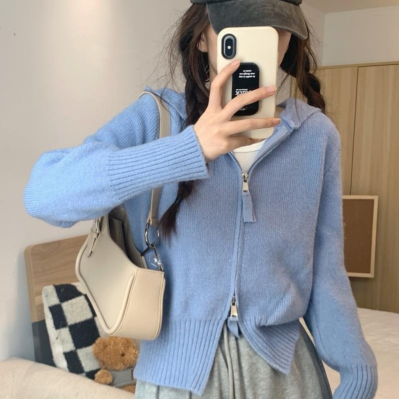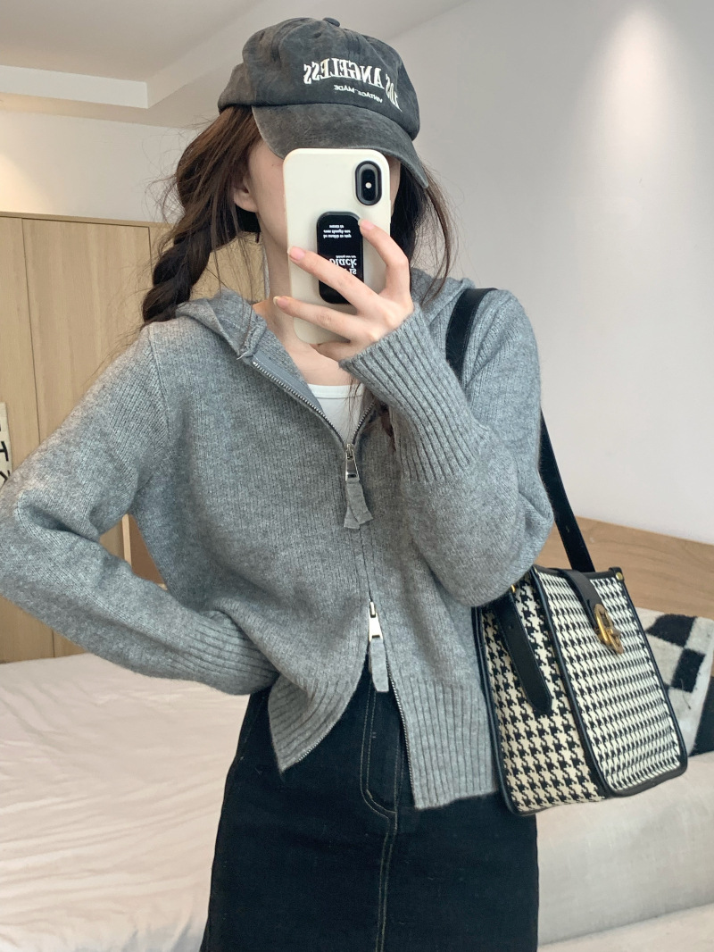 Главная страница > Серый вязаный кардиган с длинными рукавами в стиле Pure Desire для женщин, новая модель осени 2025 года, двусторонняя молния, облегающий крой, короткий топ.