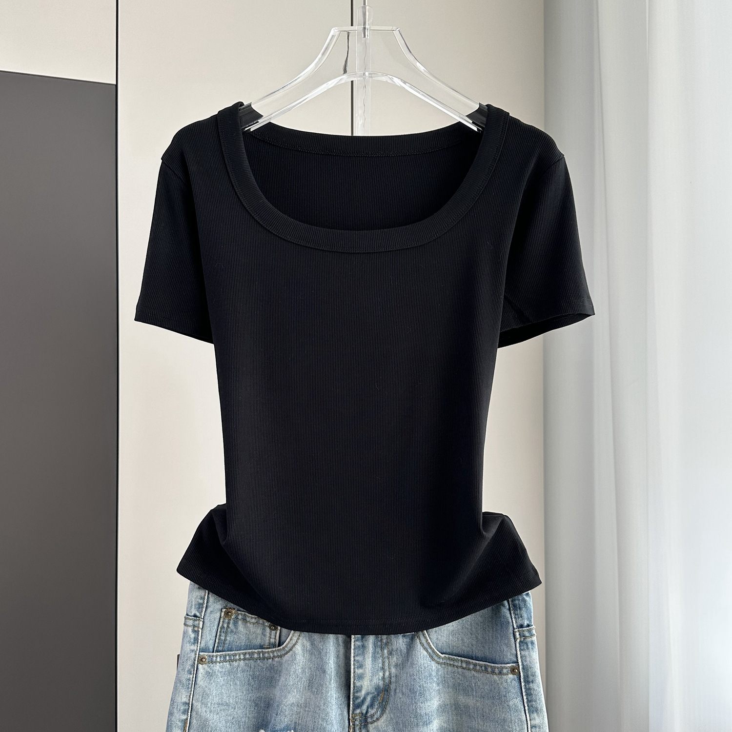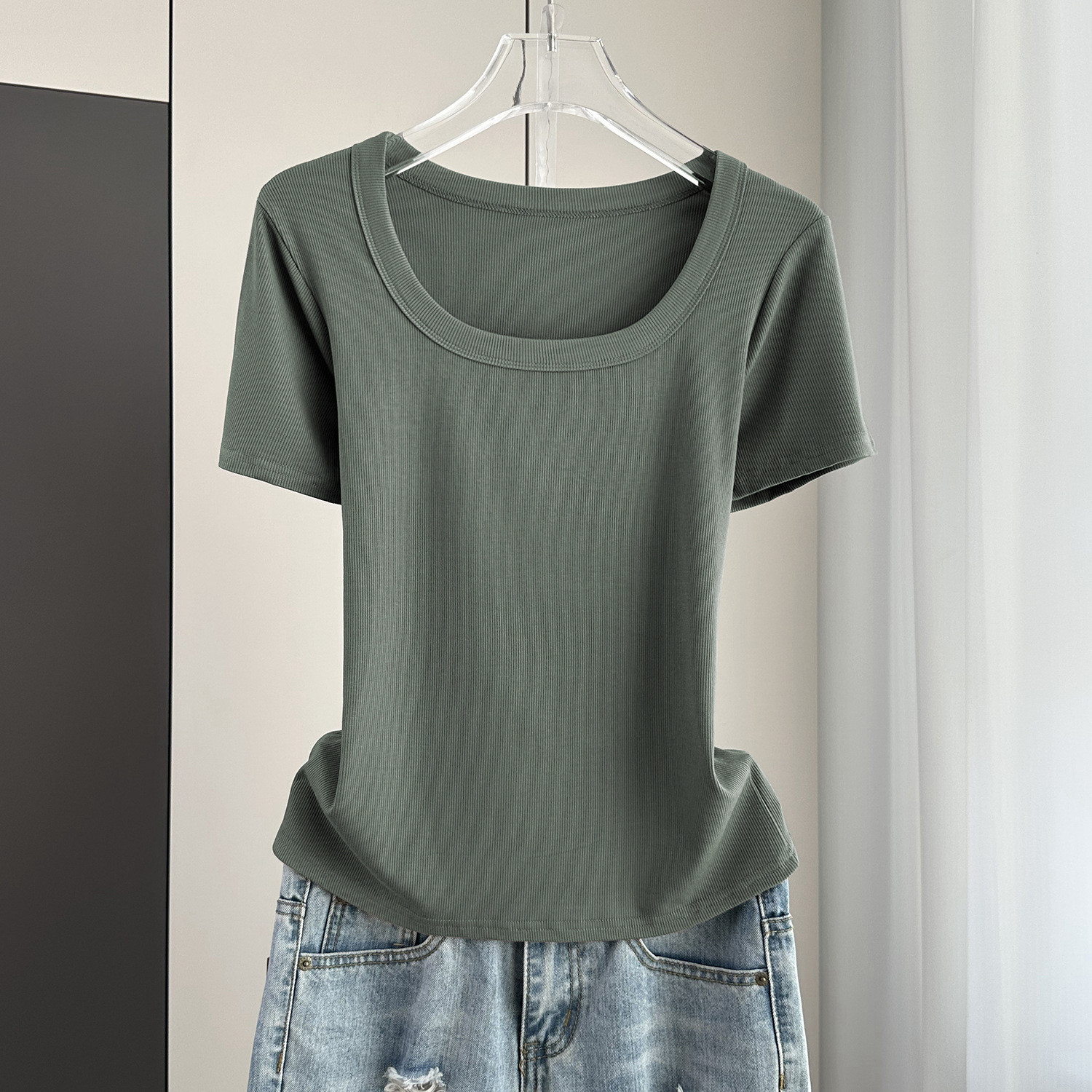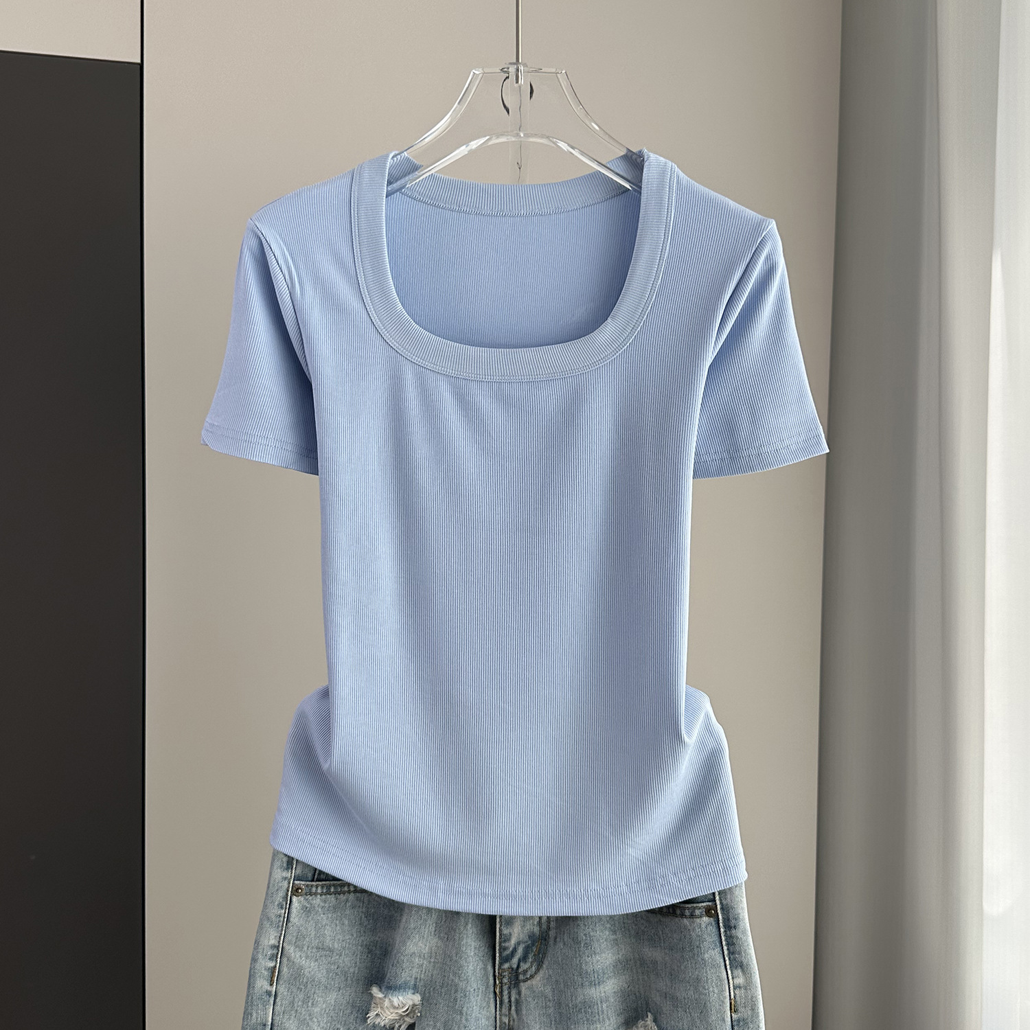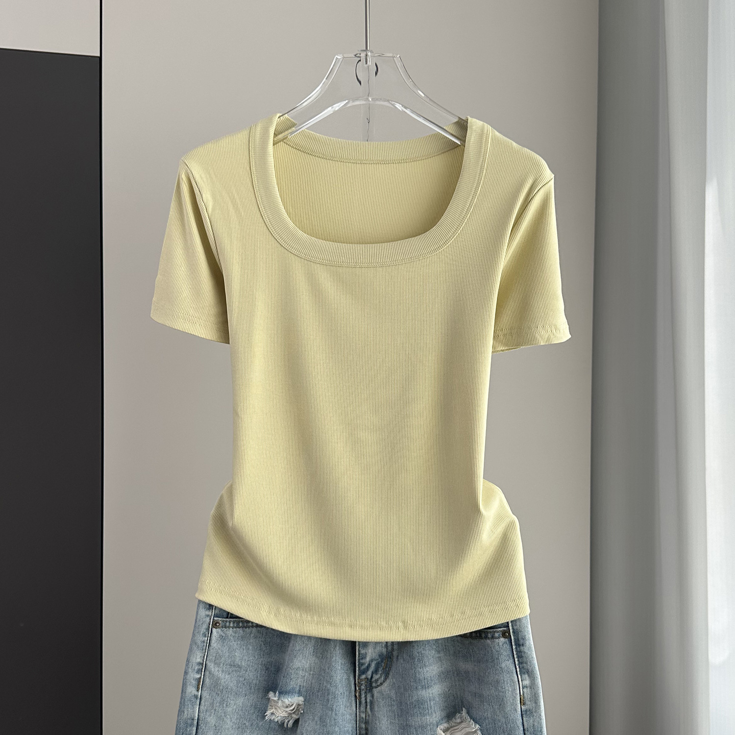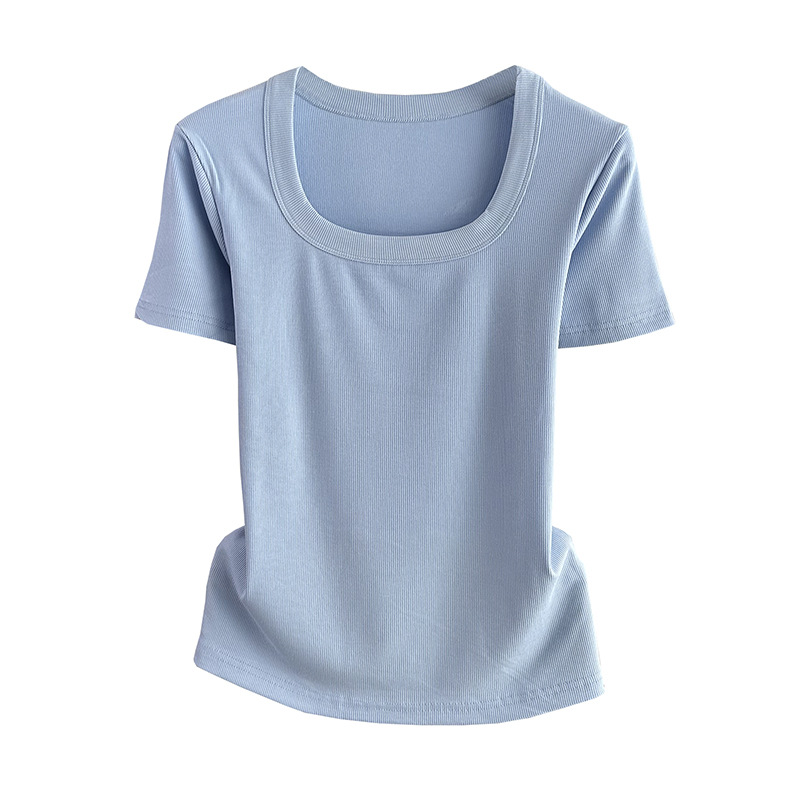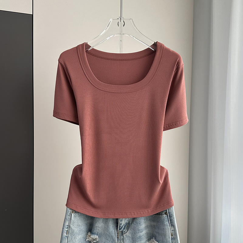 Главная страница > Женская футболка с короткими рукавами и обычными плечами, лето 2025, тонкий свободный утягивающий топ с U-образным вырезом и квадратным вырезом в рубчик для многослойности.