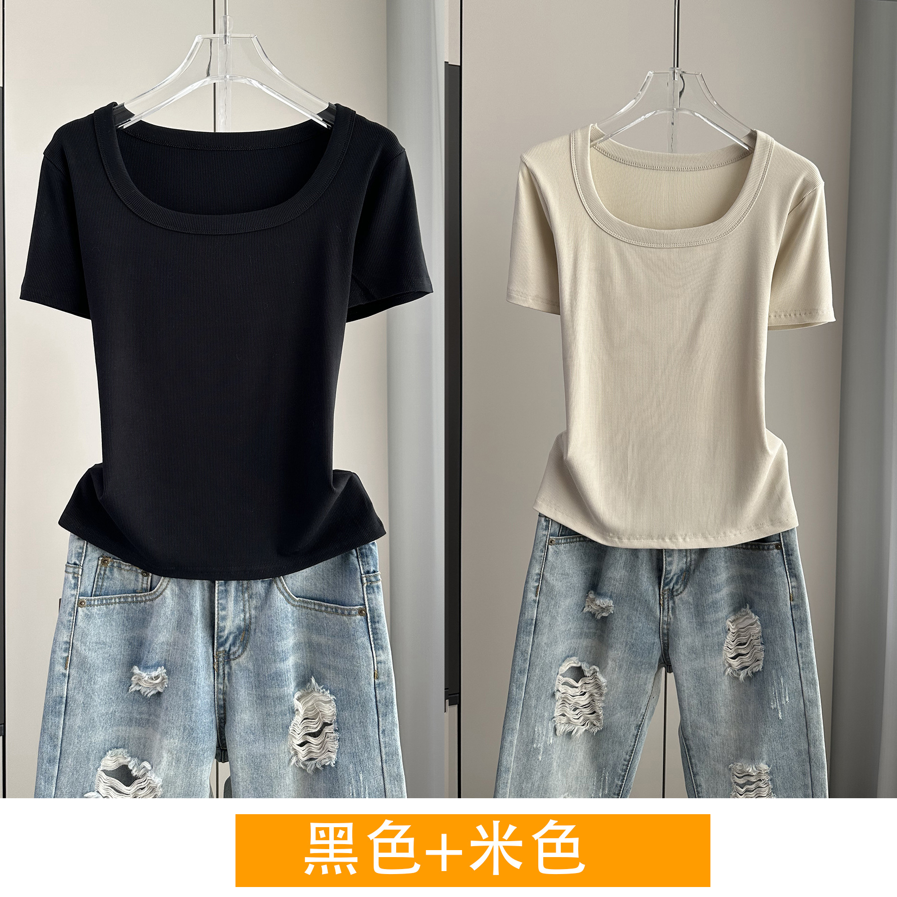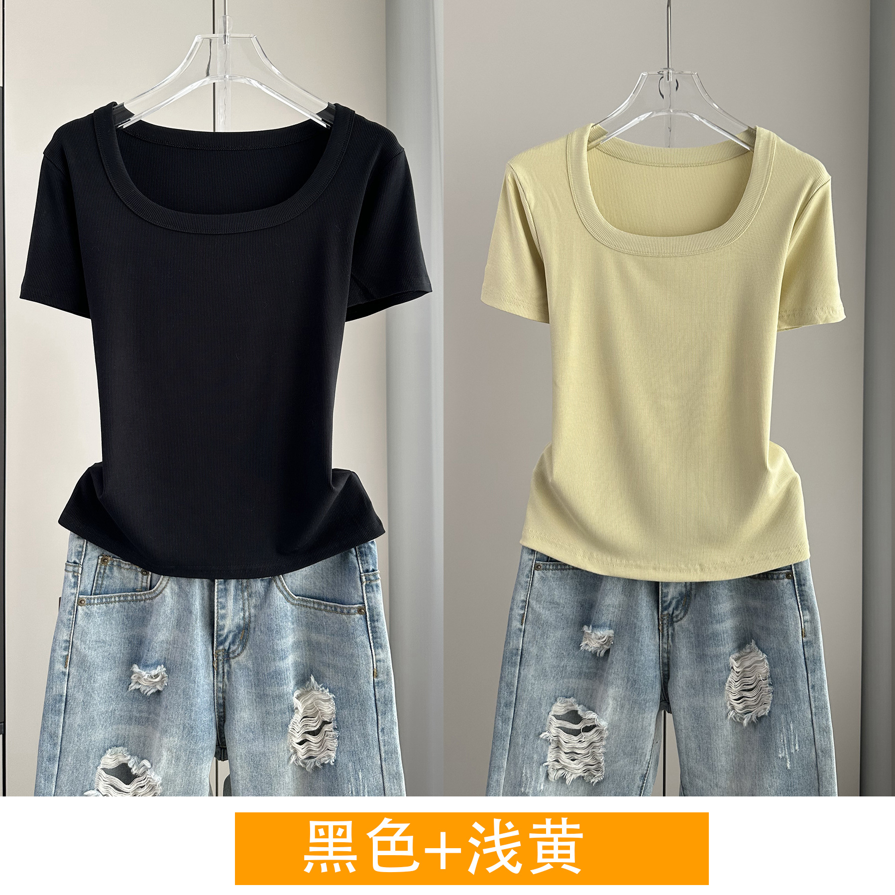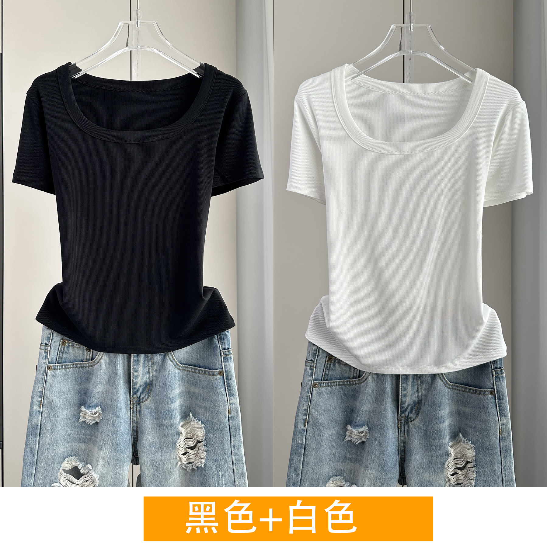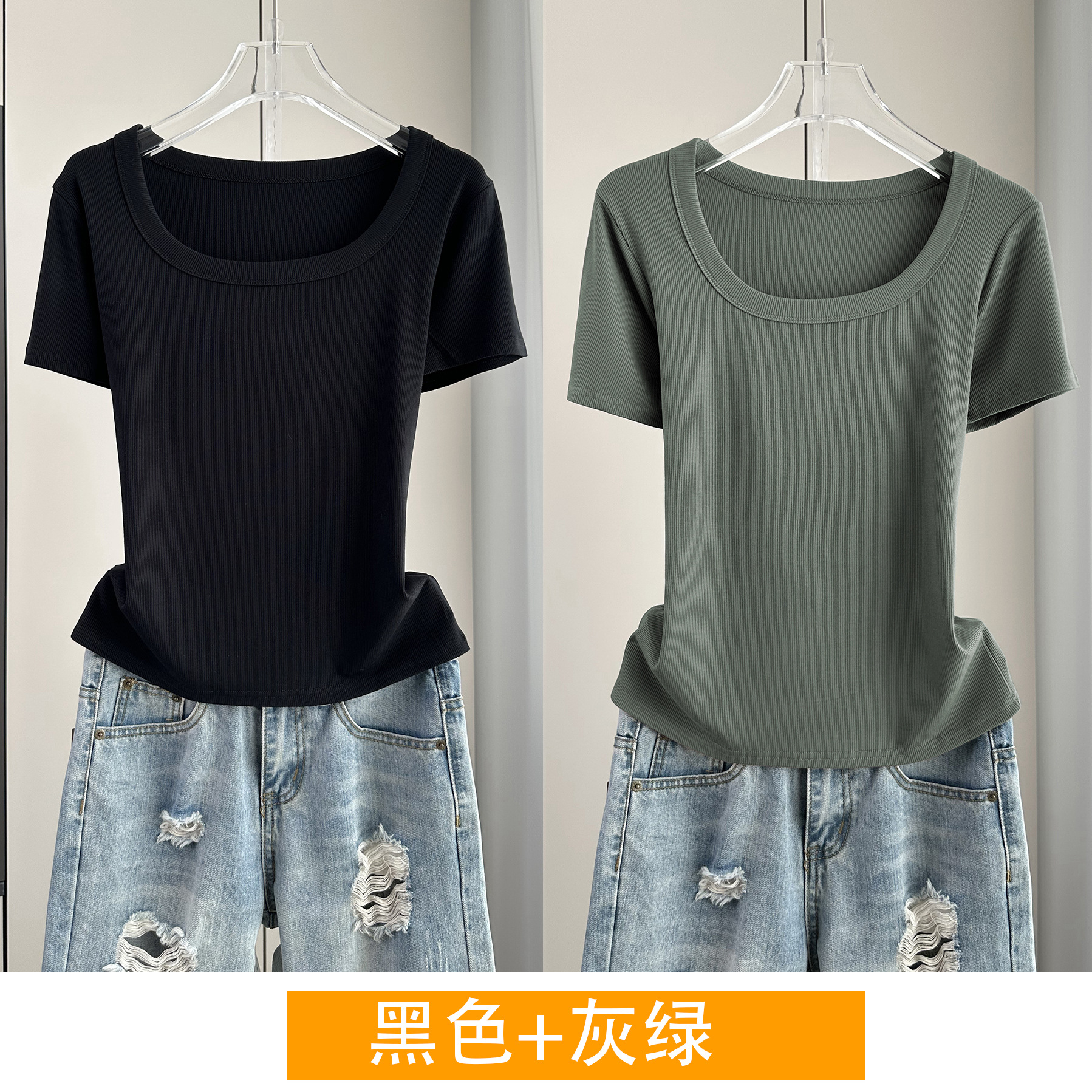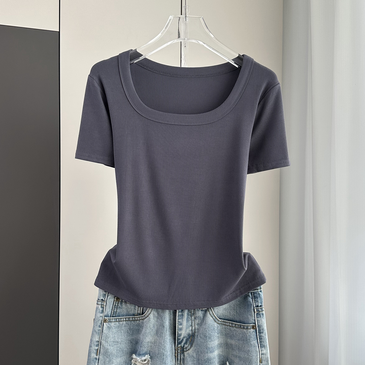 Главная страница > Женская футболка с короткими рукавами и обычными плечами, лето 2025, тонкий свободный утягивающий топ с U-образным вырезом и квадратным вырезом в рубчик для многослойности.