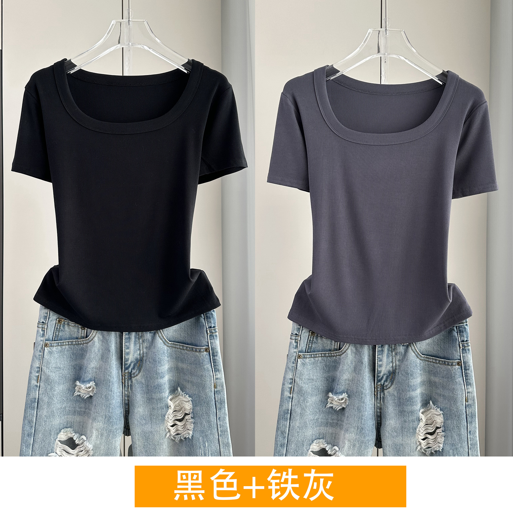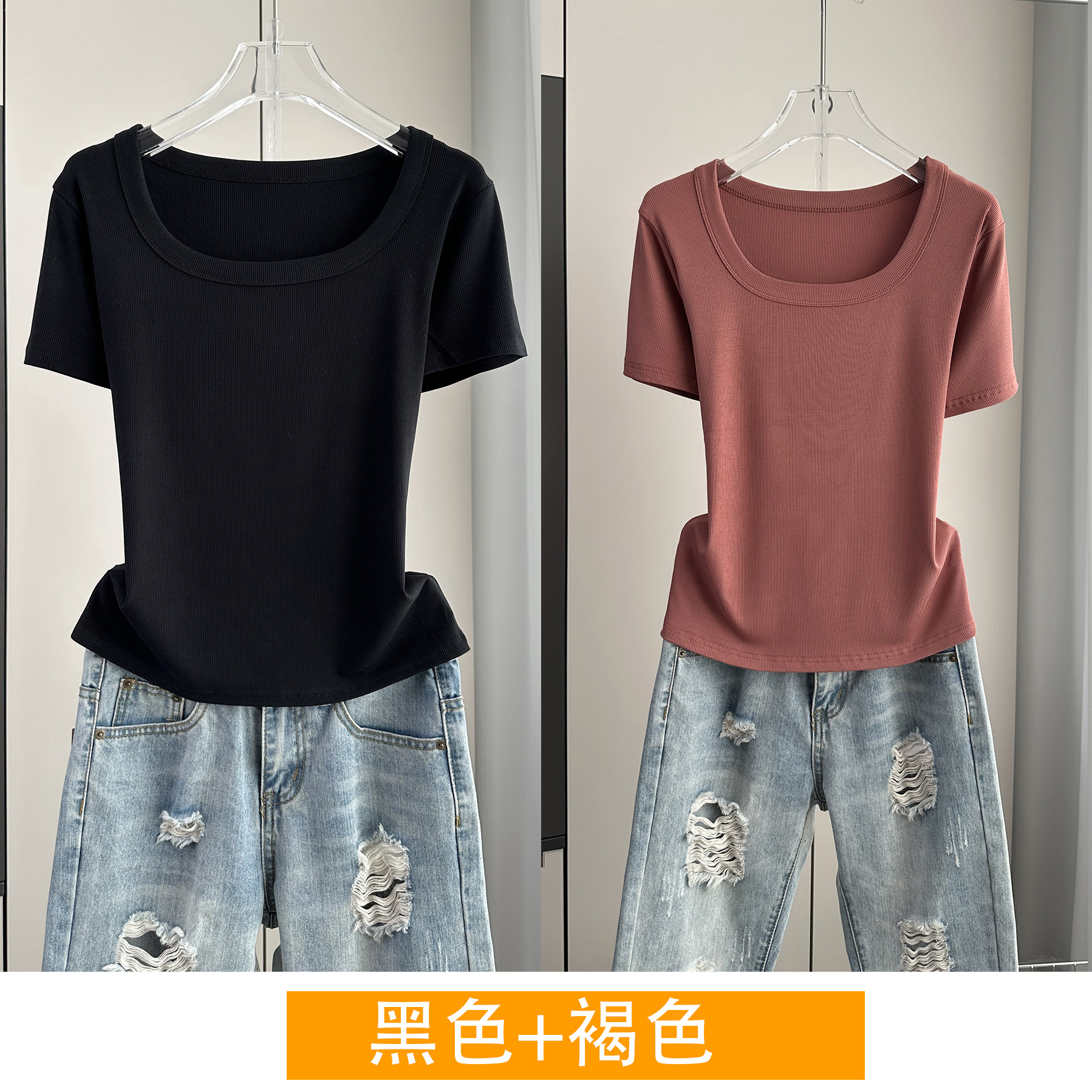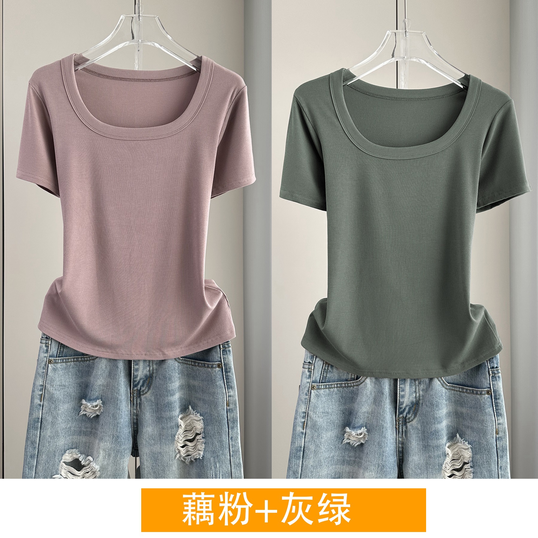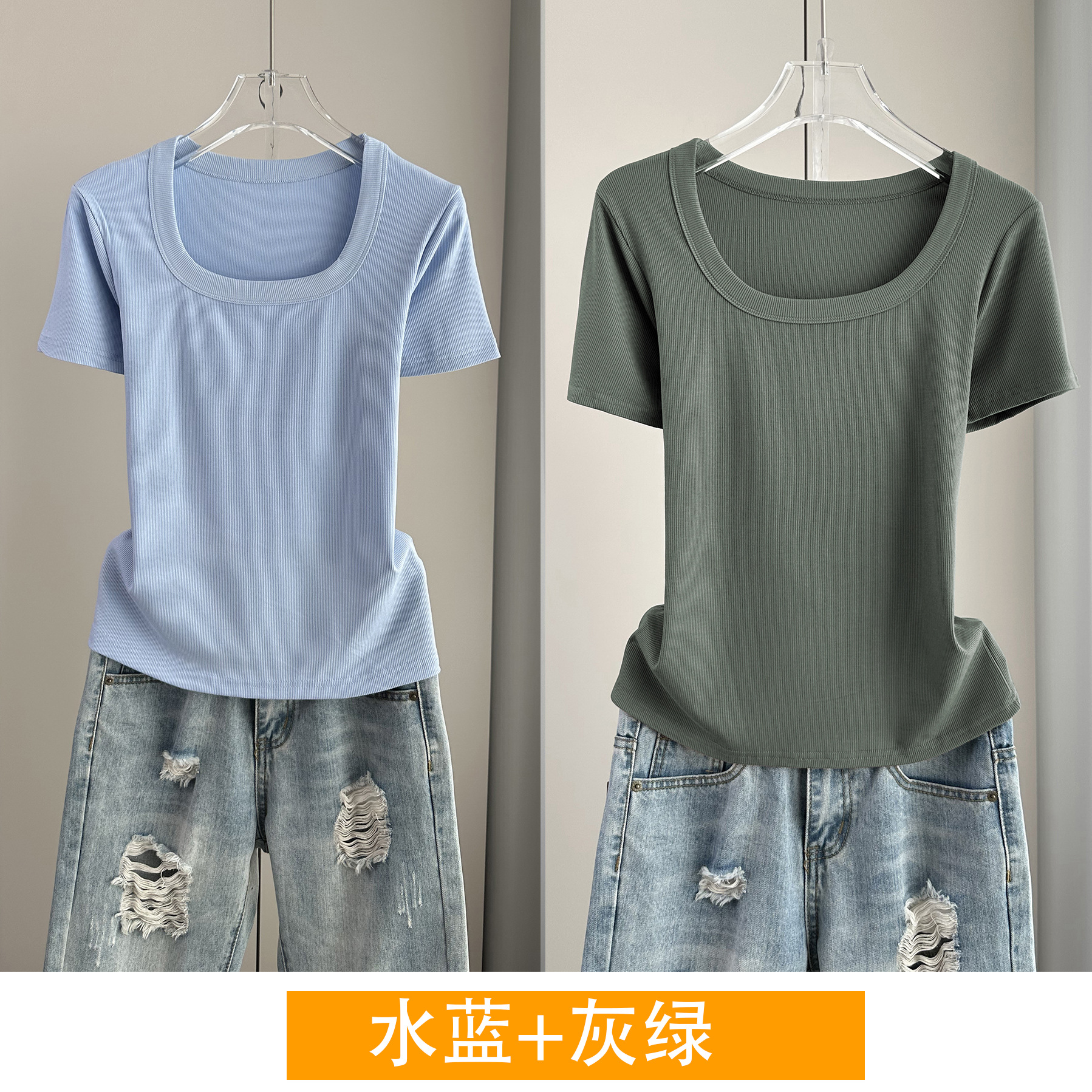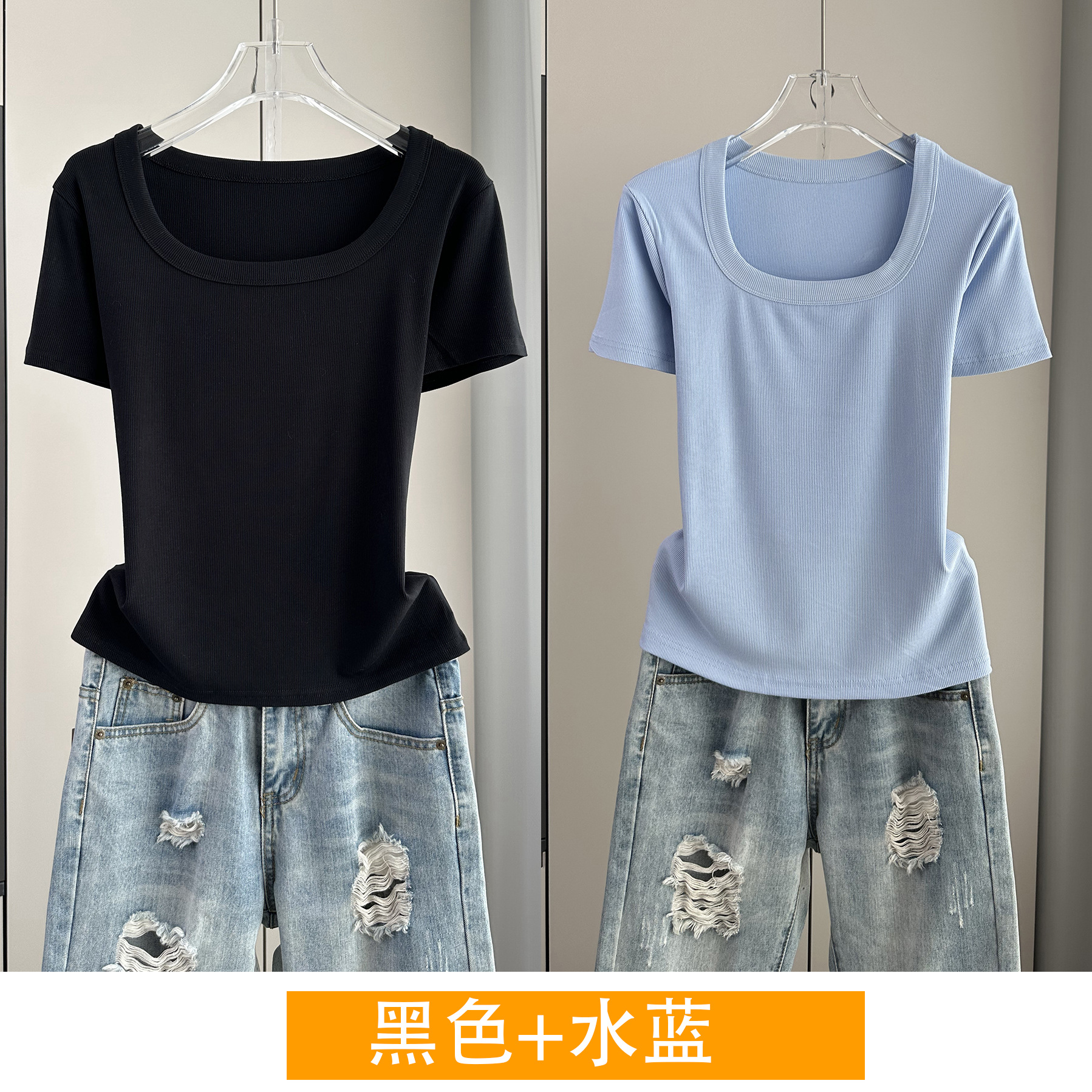 Главная страница > Женская футболка с короткими рукавами и обычными плечами, лето 2025, тонкий свободный утягивающий топ с U-образным вырезом и квадратным вырезом в рубчик для многослойности.