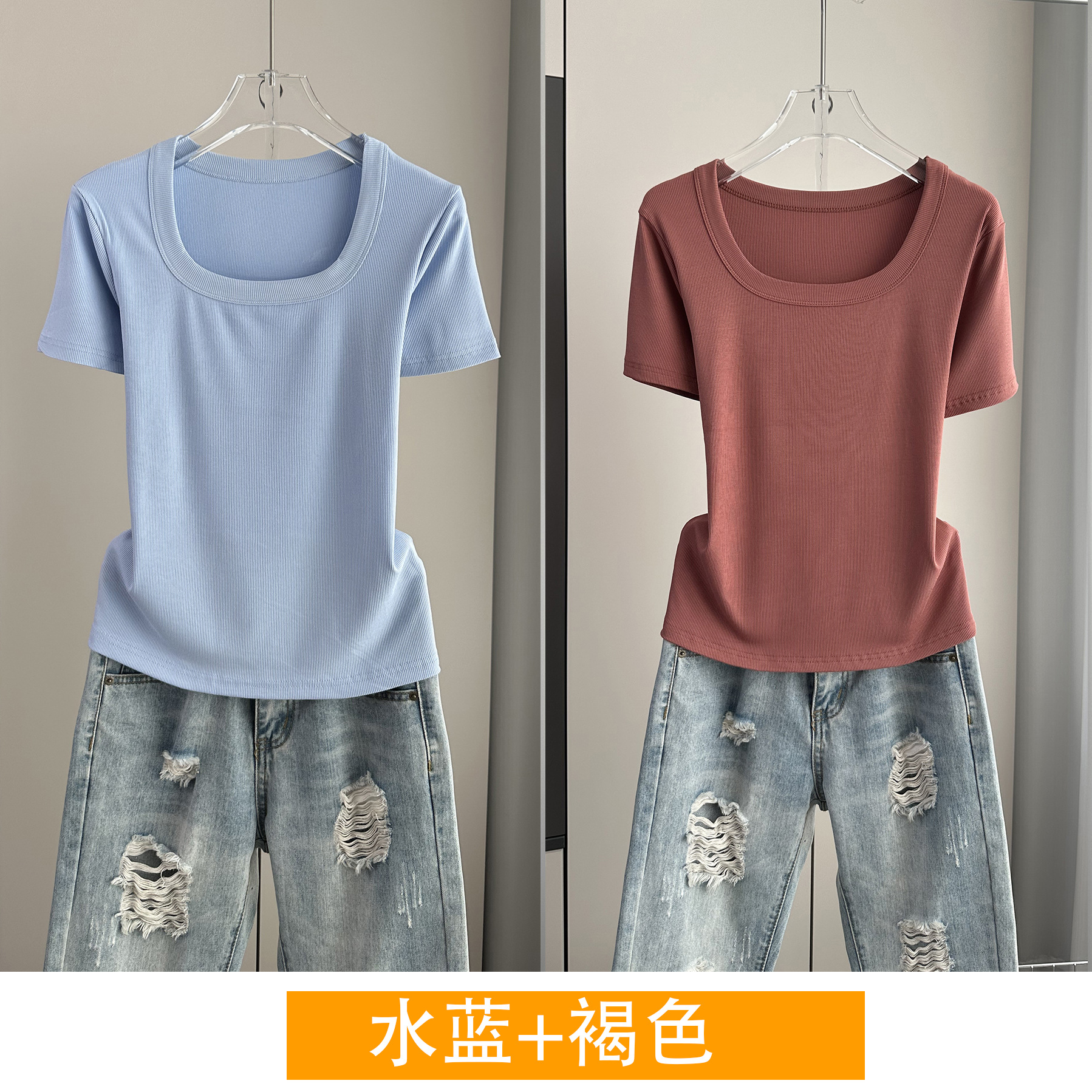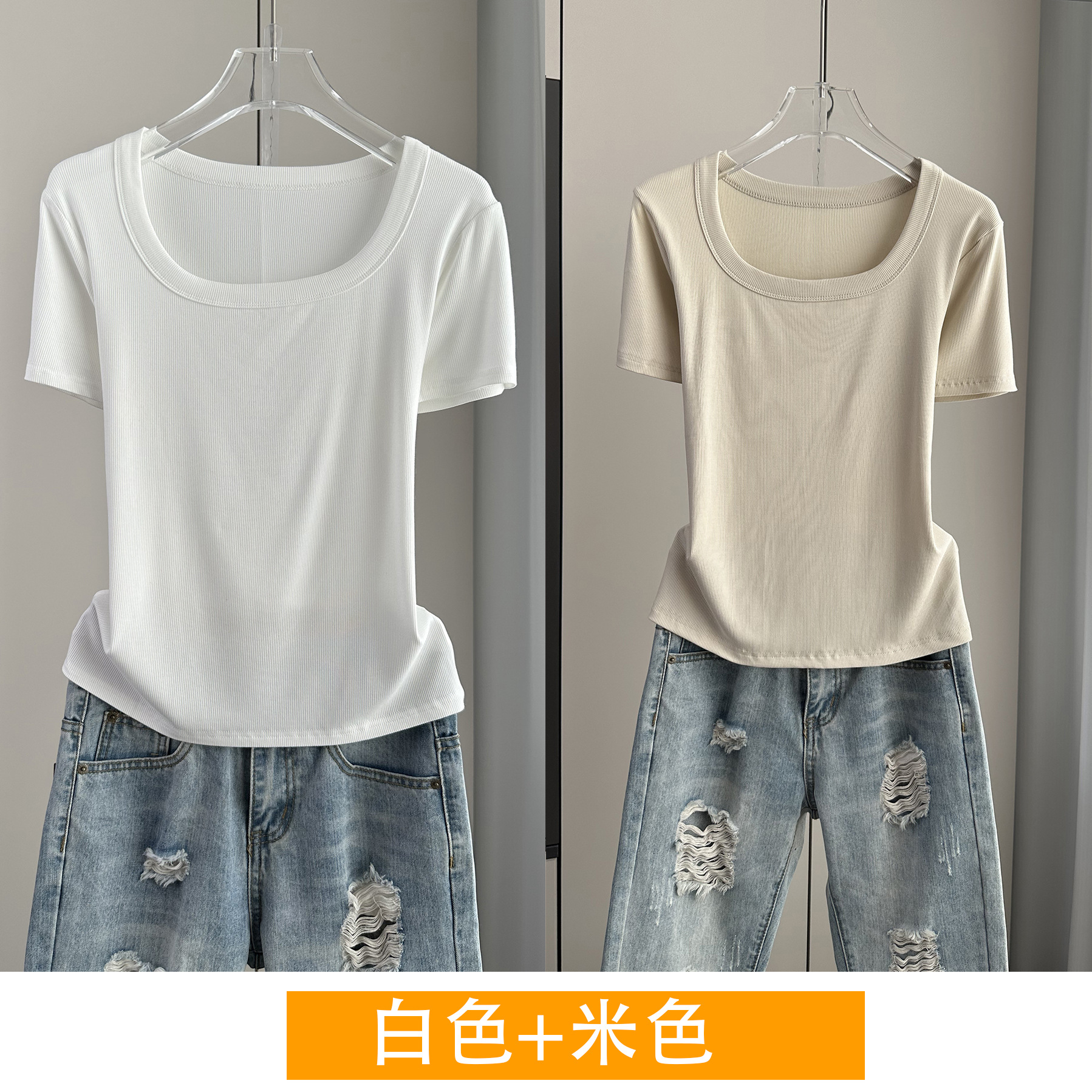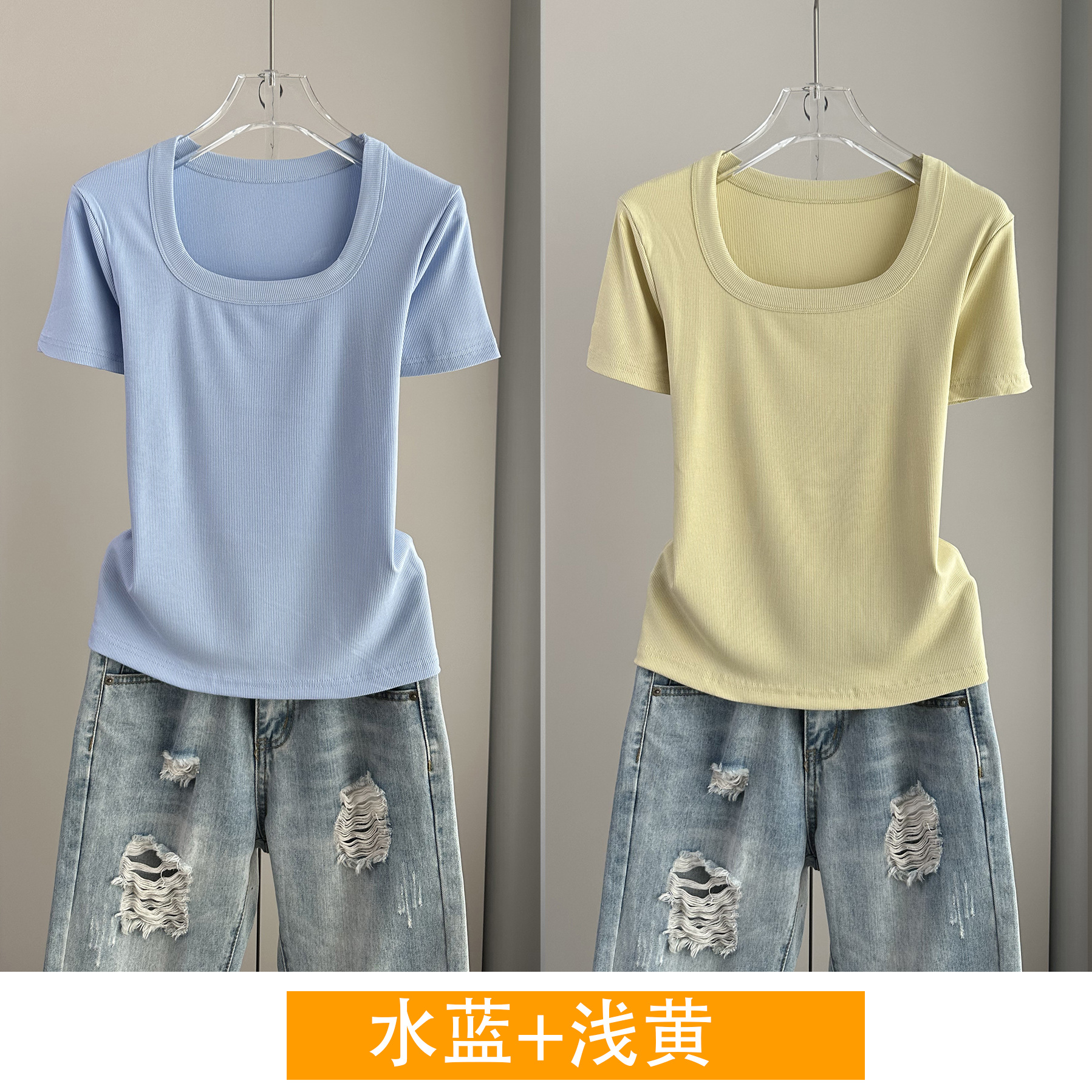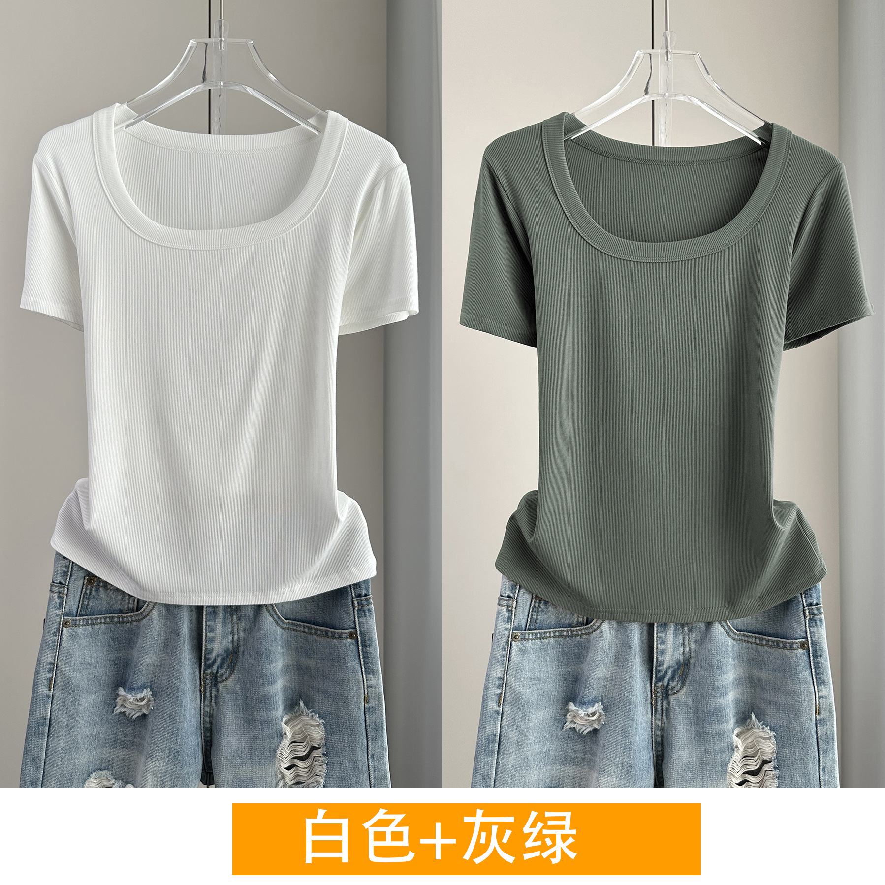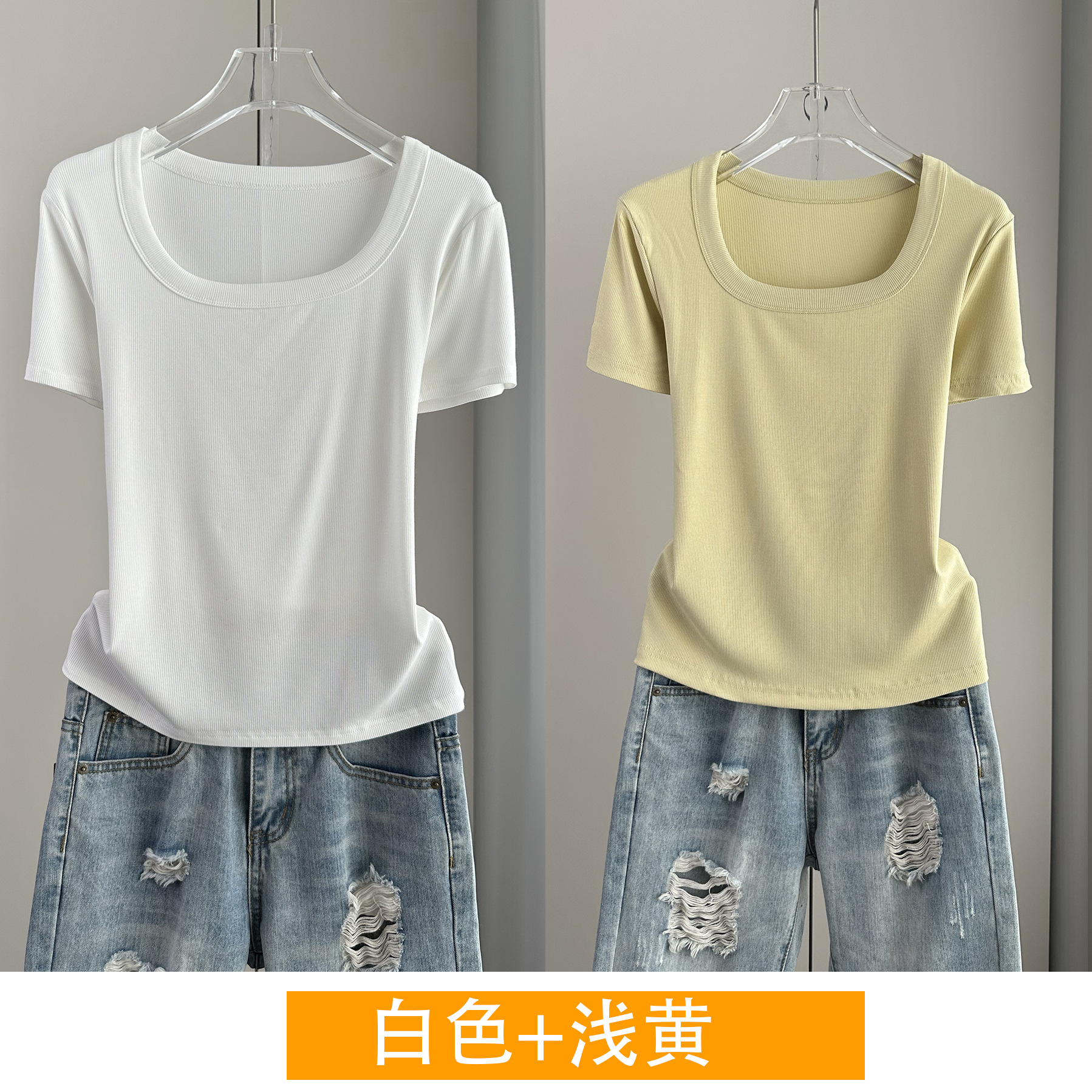 Главная страница > Женская футболка с короткими рукавами и обычными плечами, лето 2025, тонкий свободный утягивающий топ с U-образным вырезом и квадратным вырезом в рубчик для многослойности.