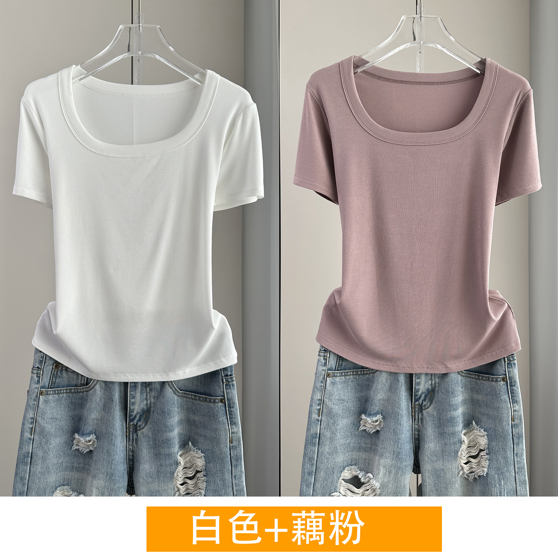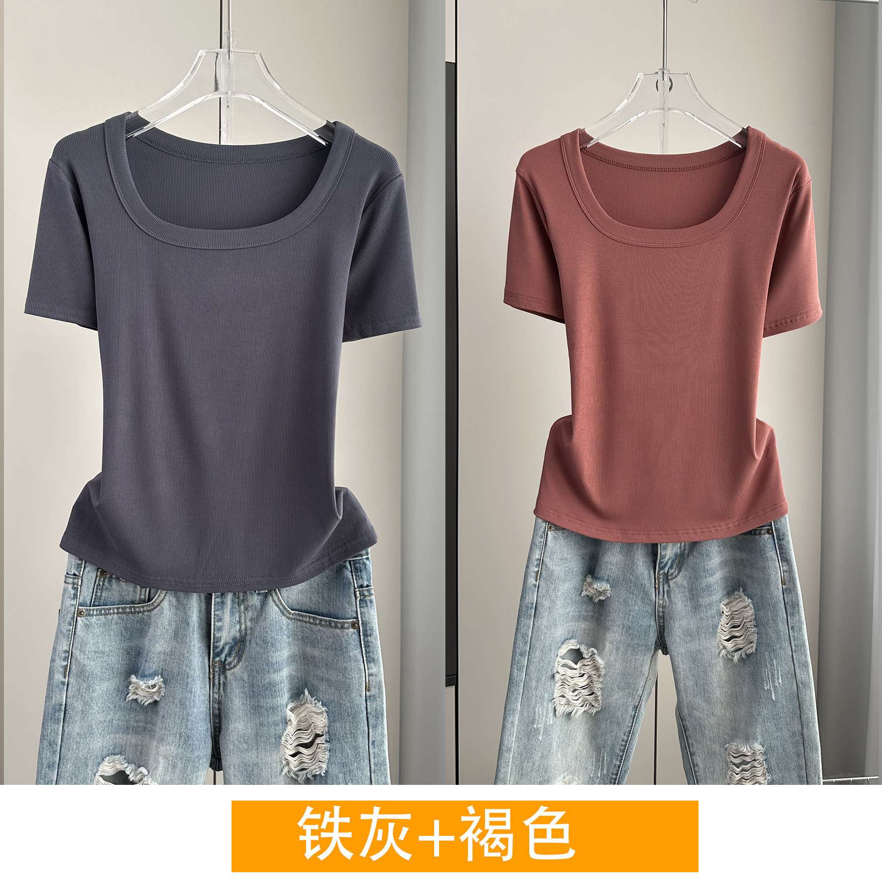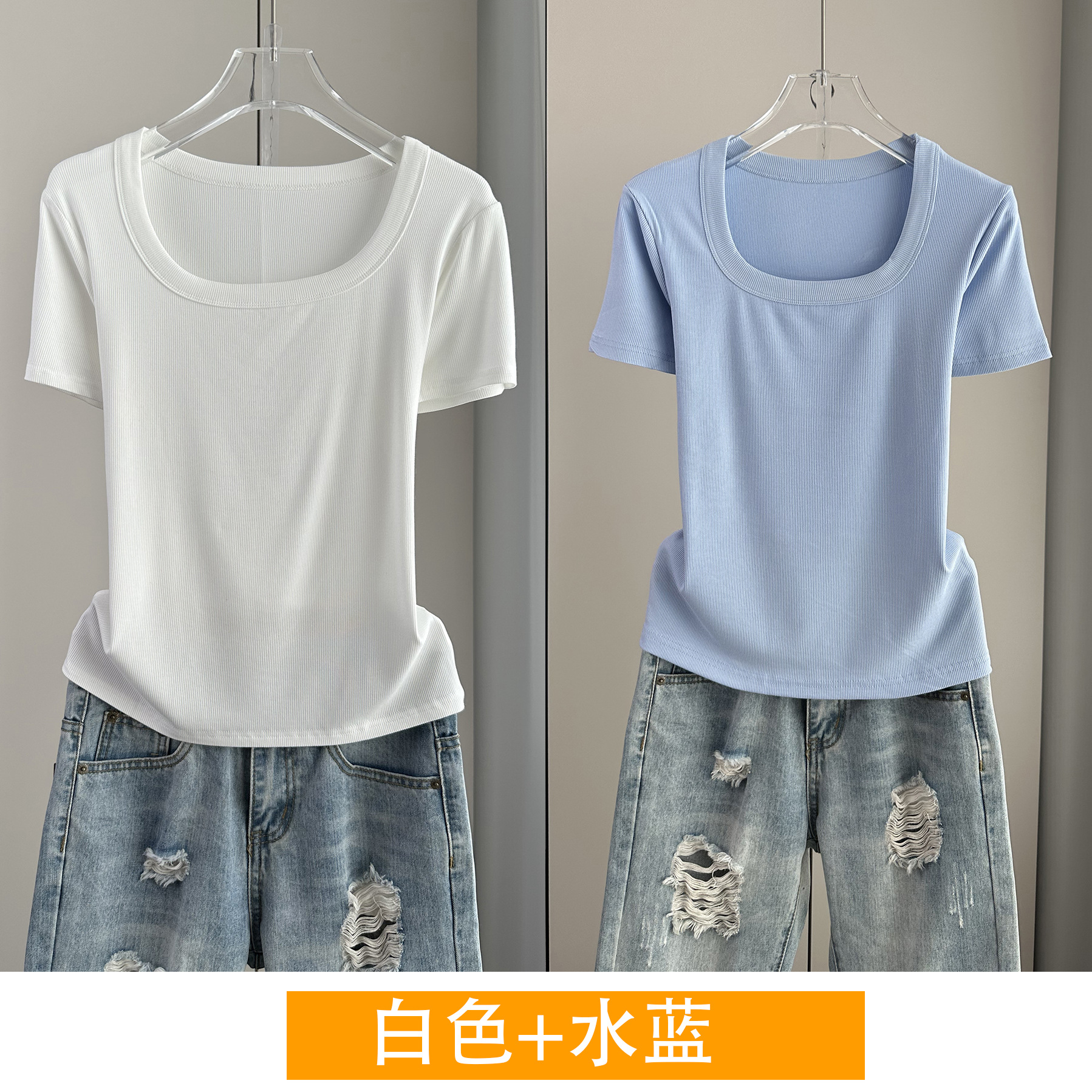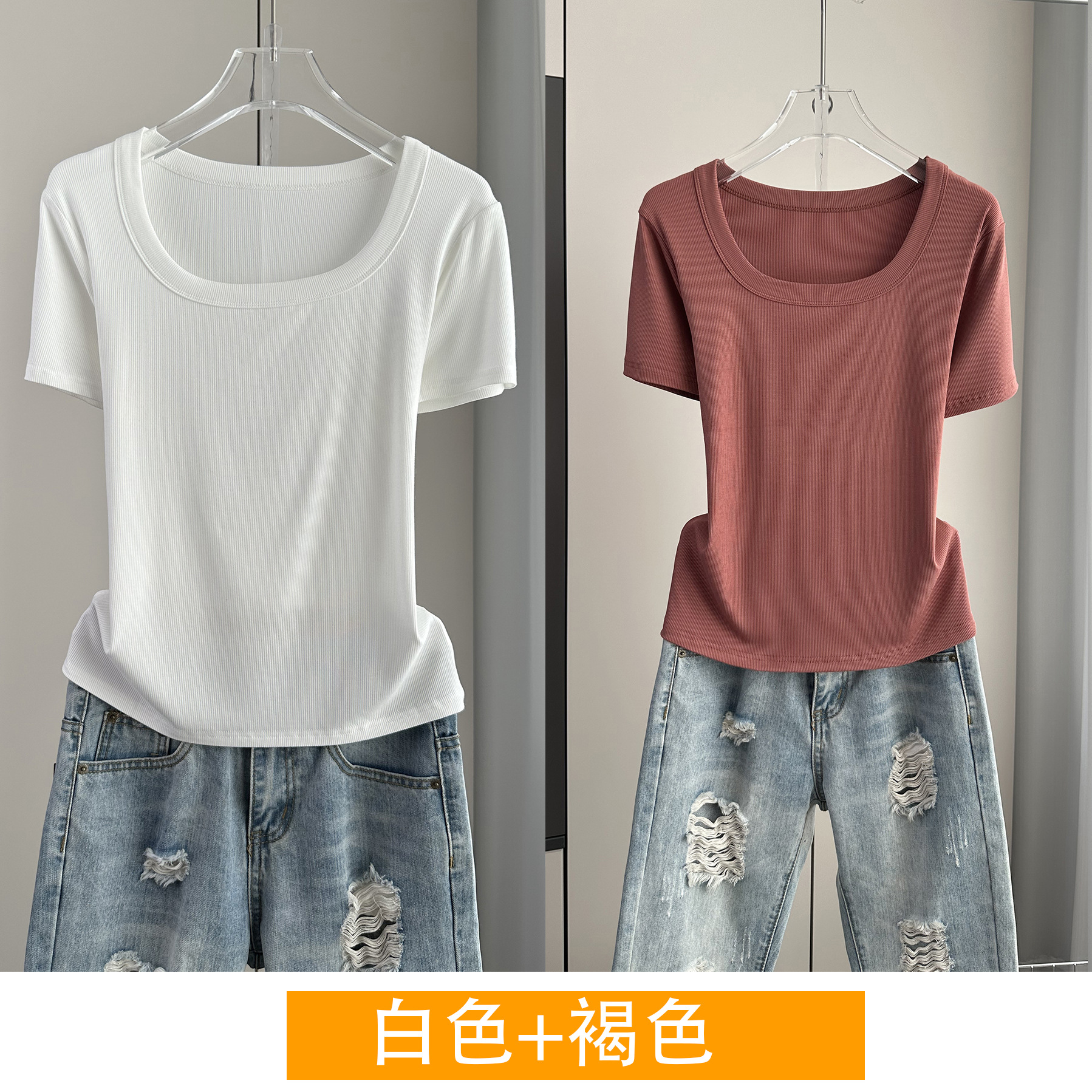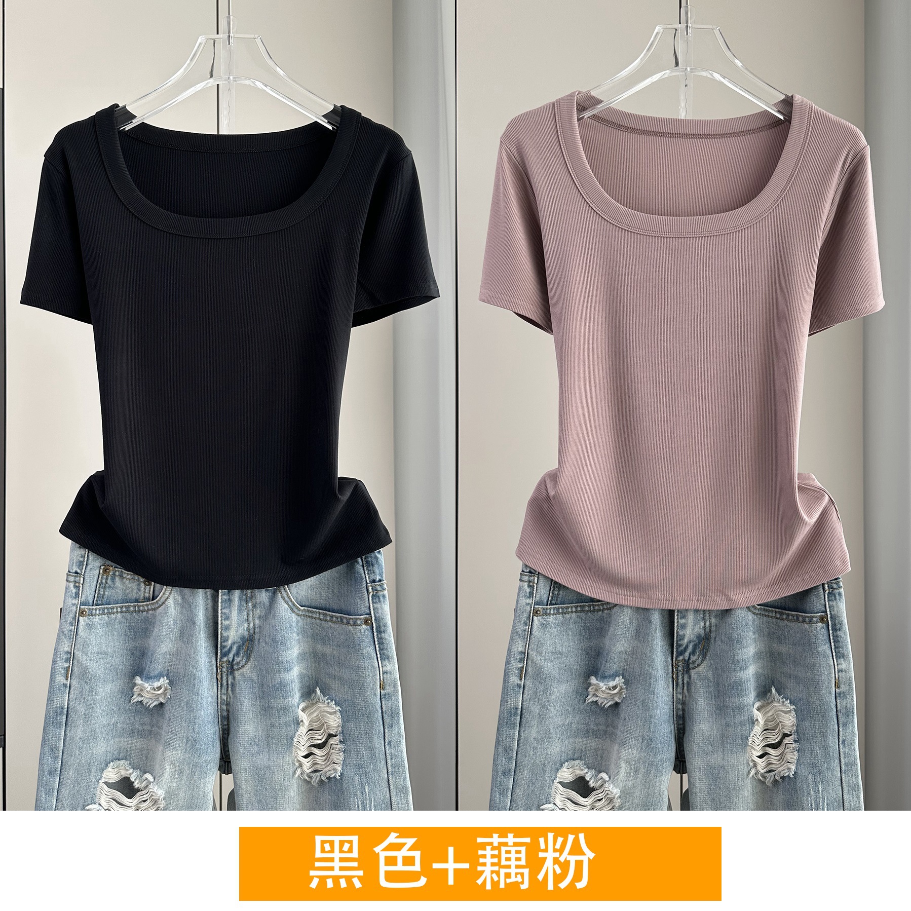 Главная страница > Женская футболка с короткими рукавами и обычными плечами, лето 2025, тонкий свободный утягивающий топ с U-образным вырезом и квадратным вырезом в рубчик для многослойности.
