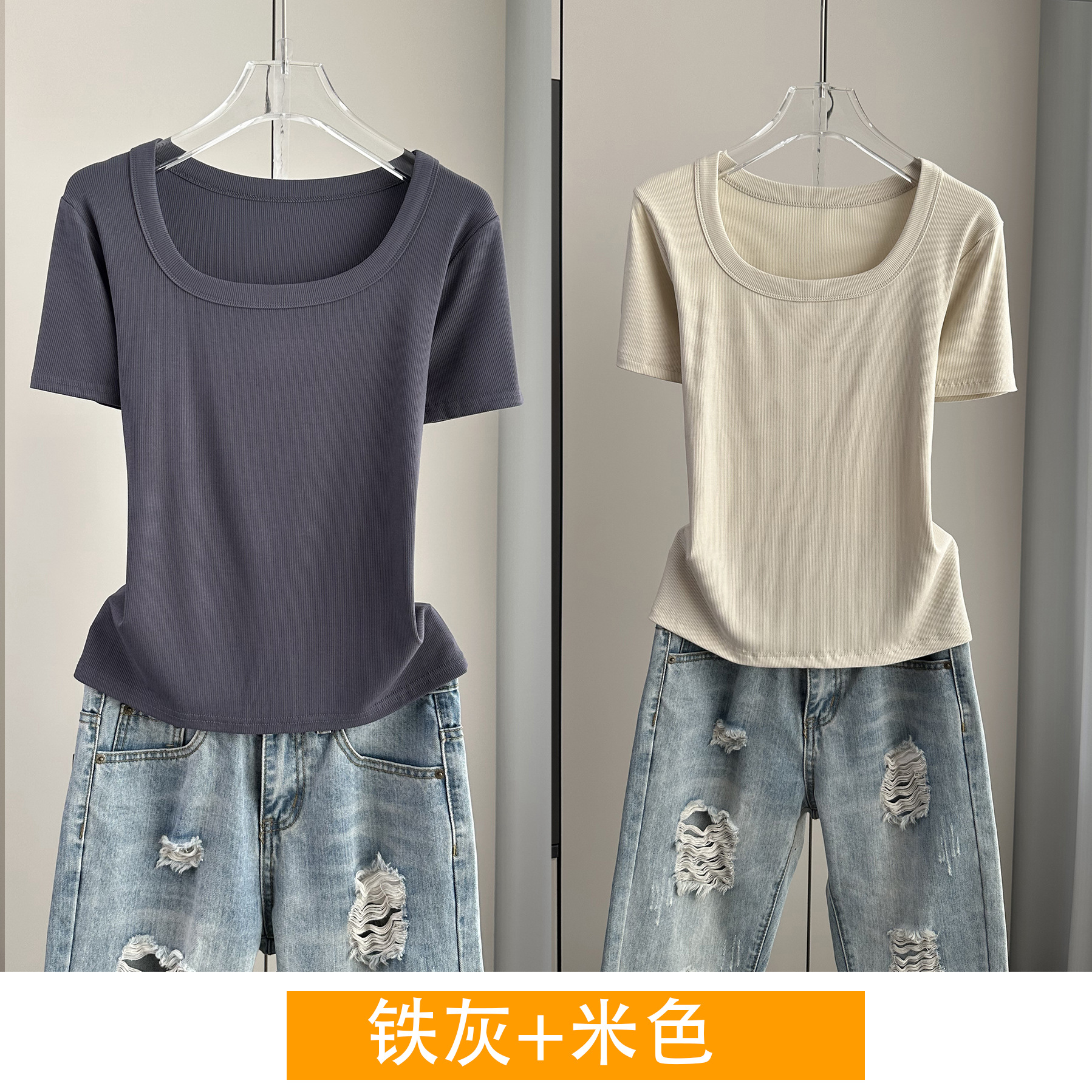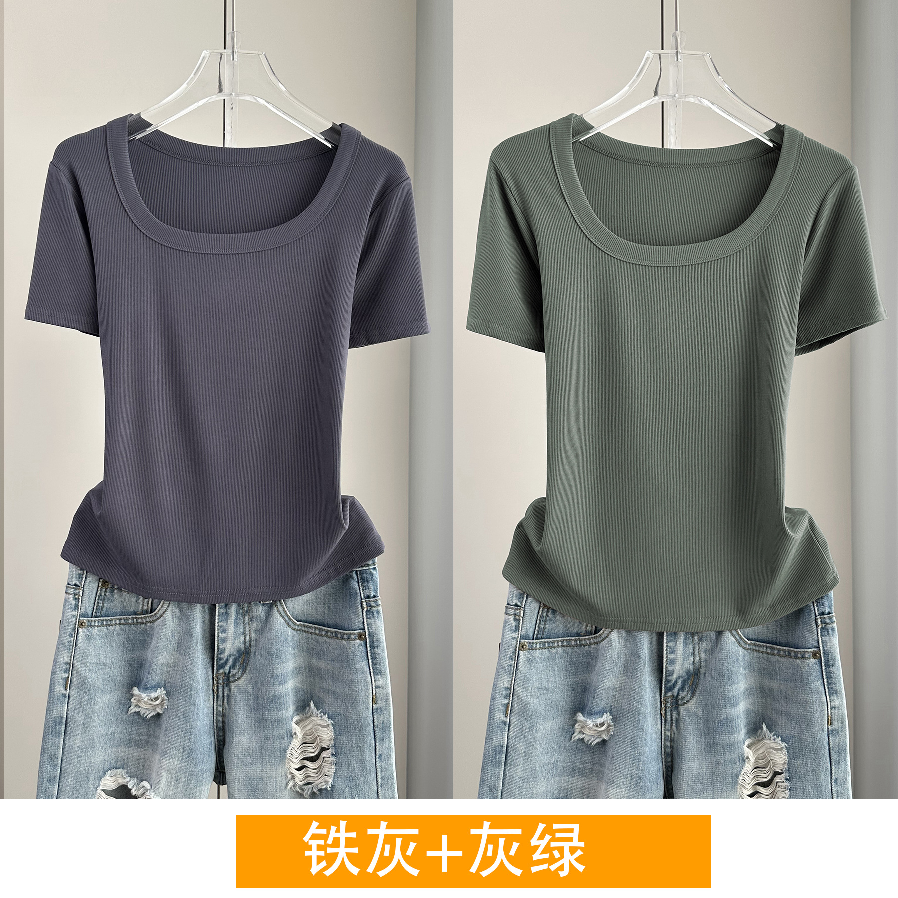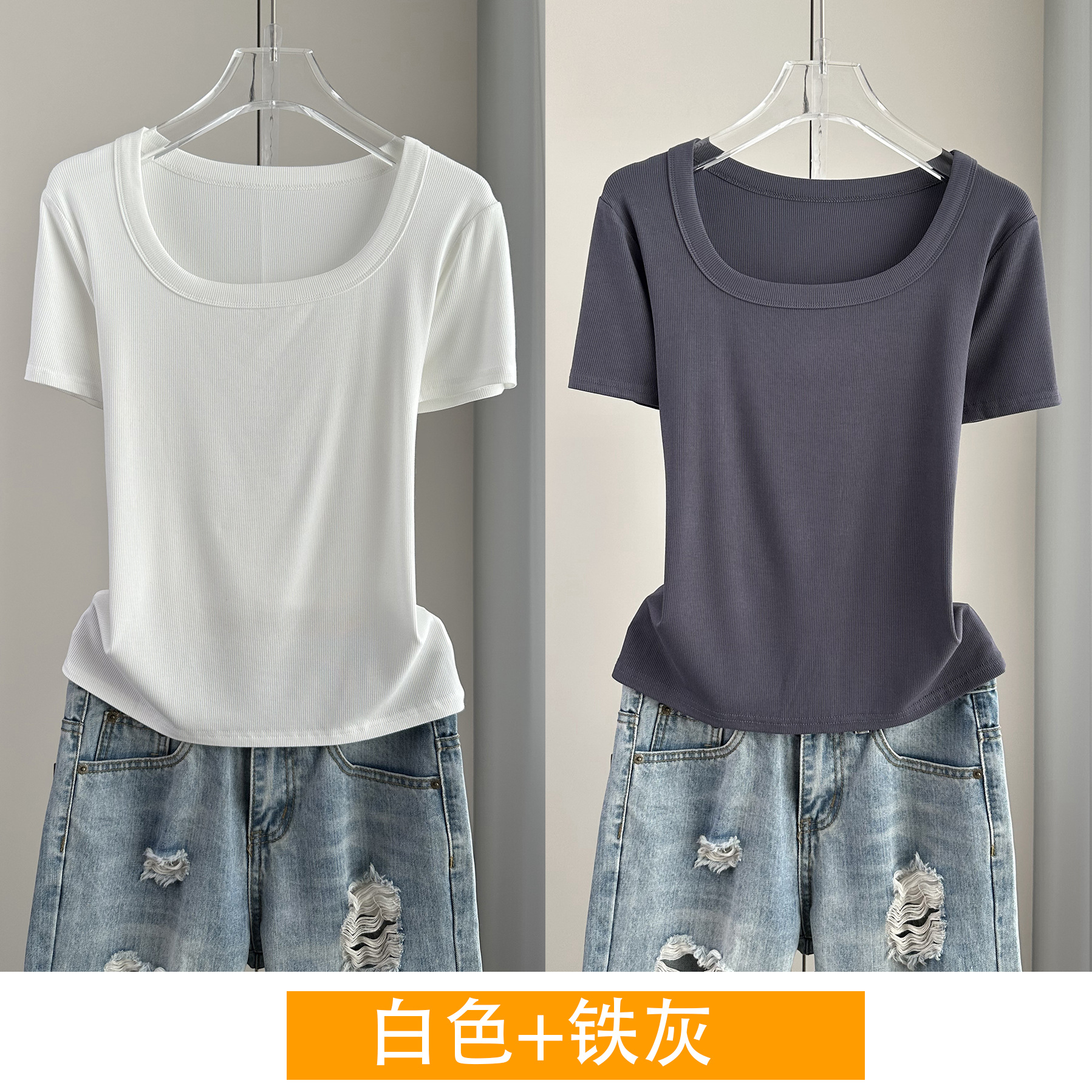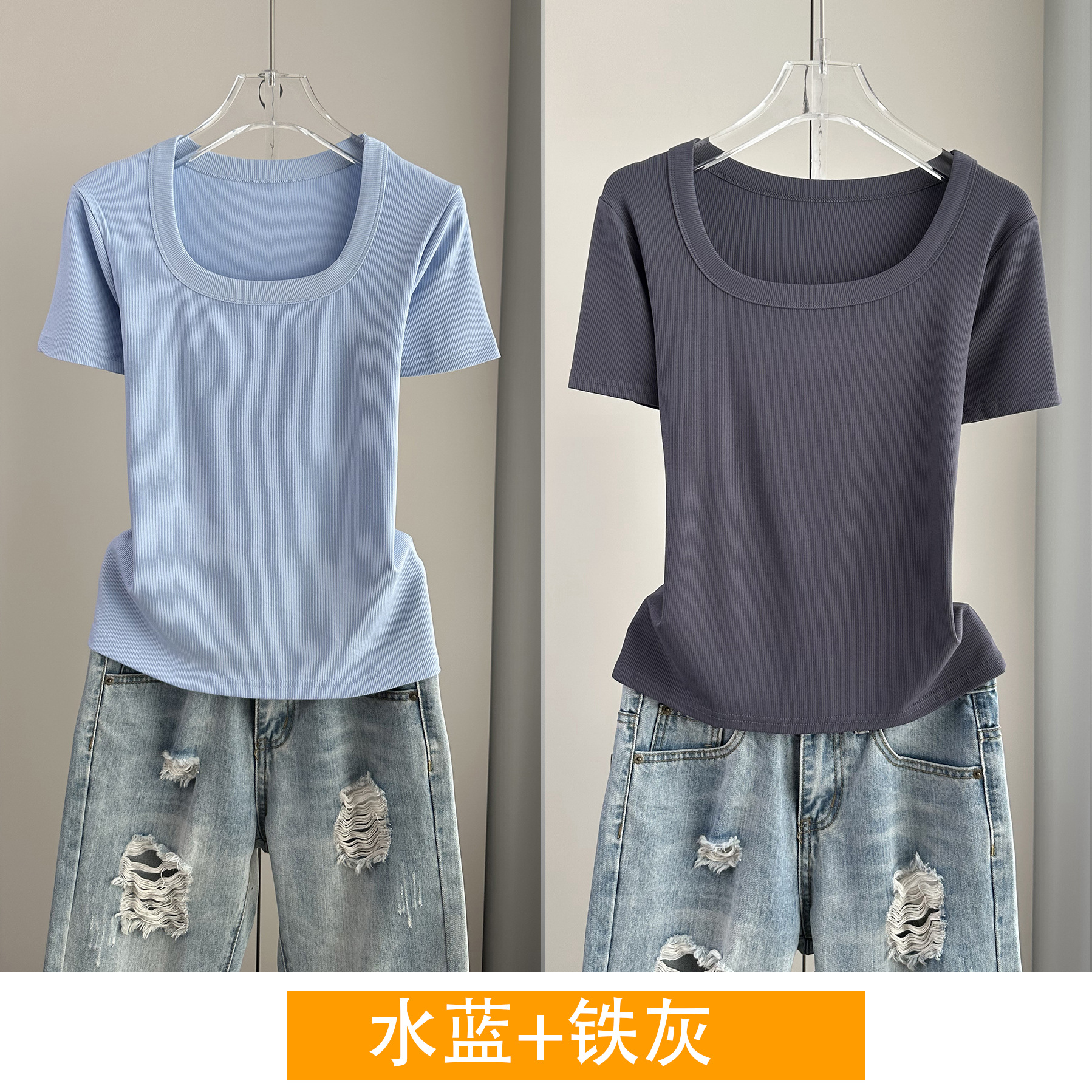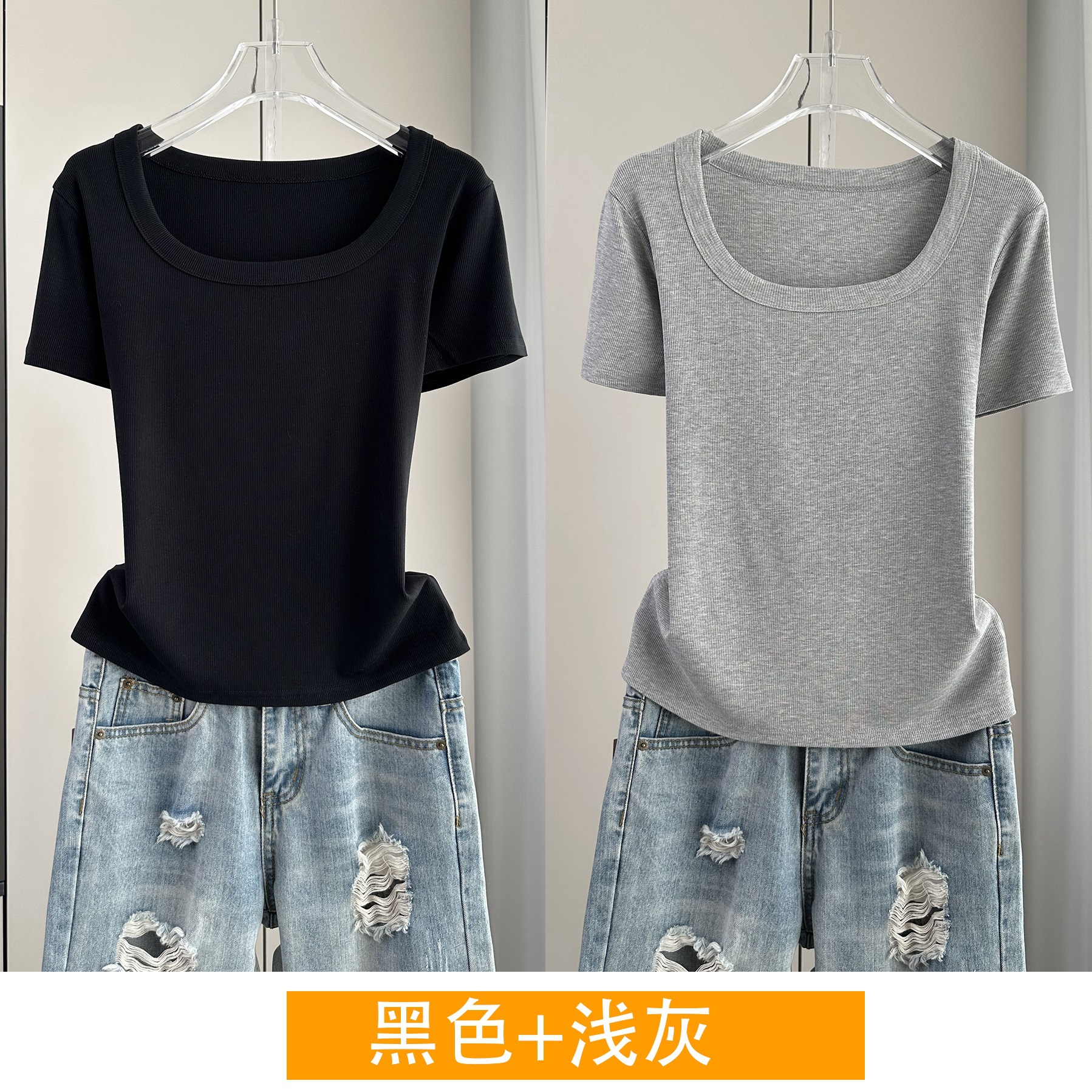 Главная страница > Женская футболка с короткими рукавами и обычными плечами, лето 2025, тонкий свободный утягивающий топ с U-образным вырезом и квадратным вырезом в рубчик для многослойности.