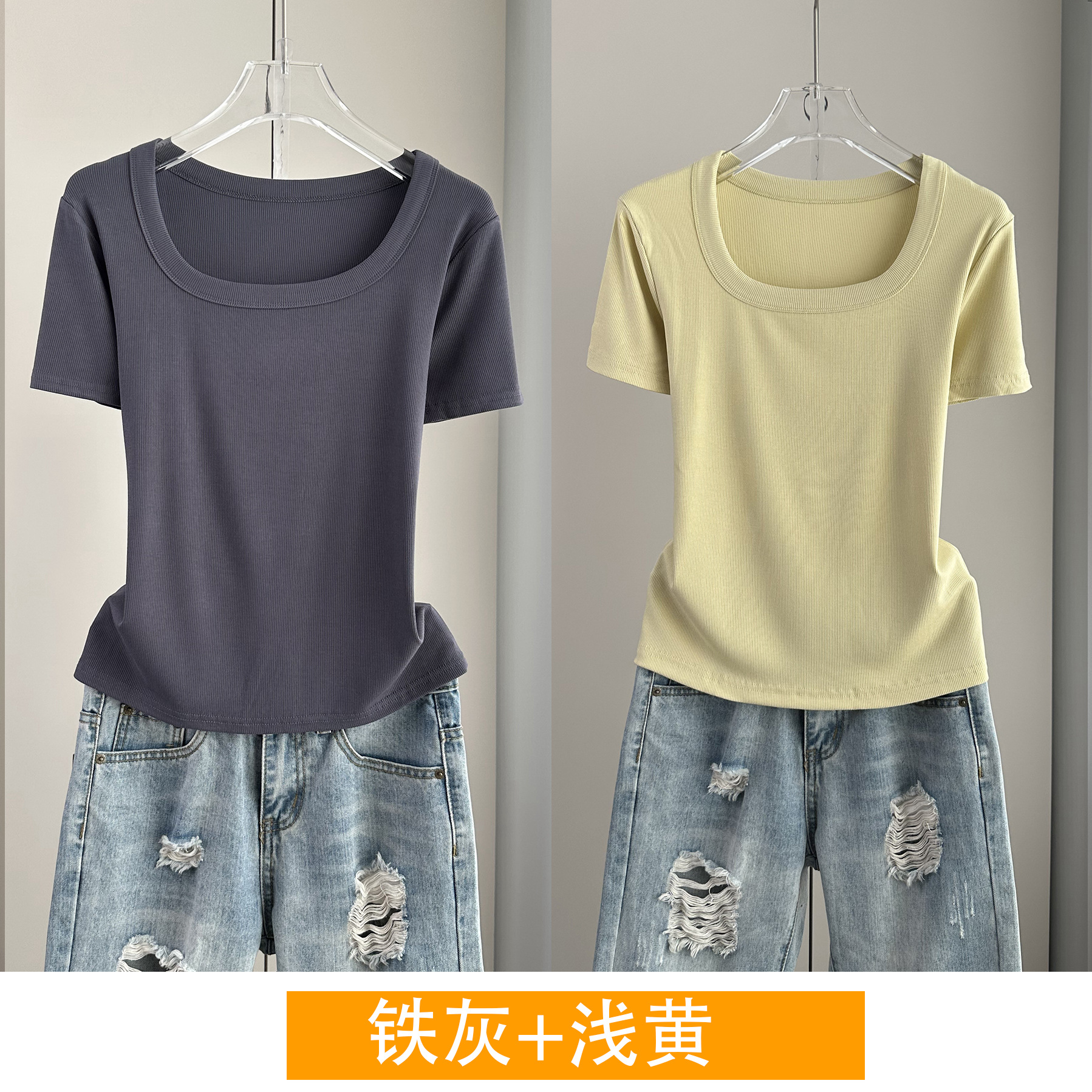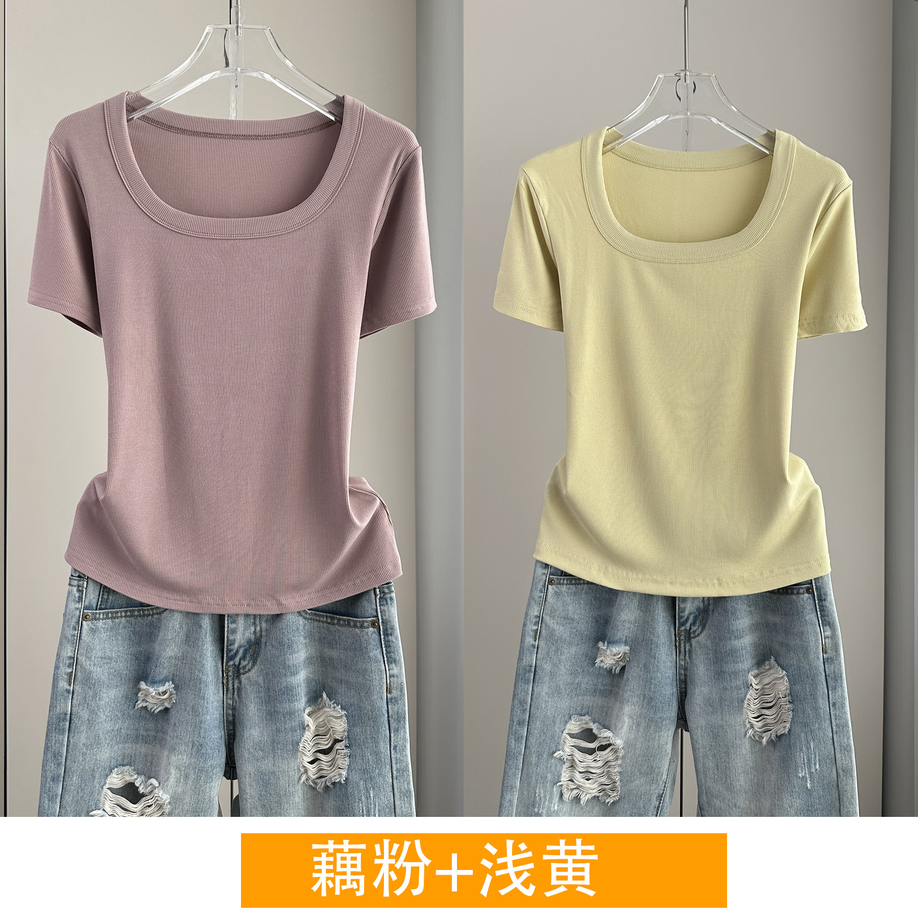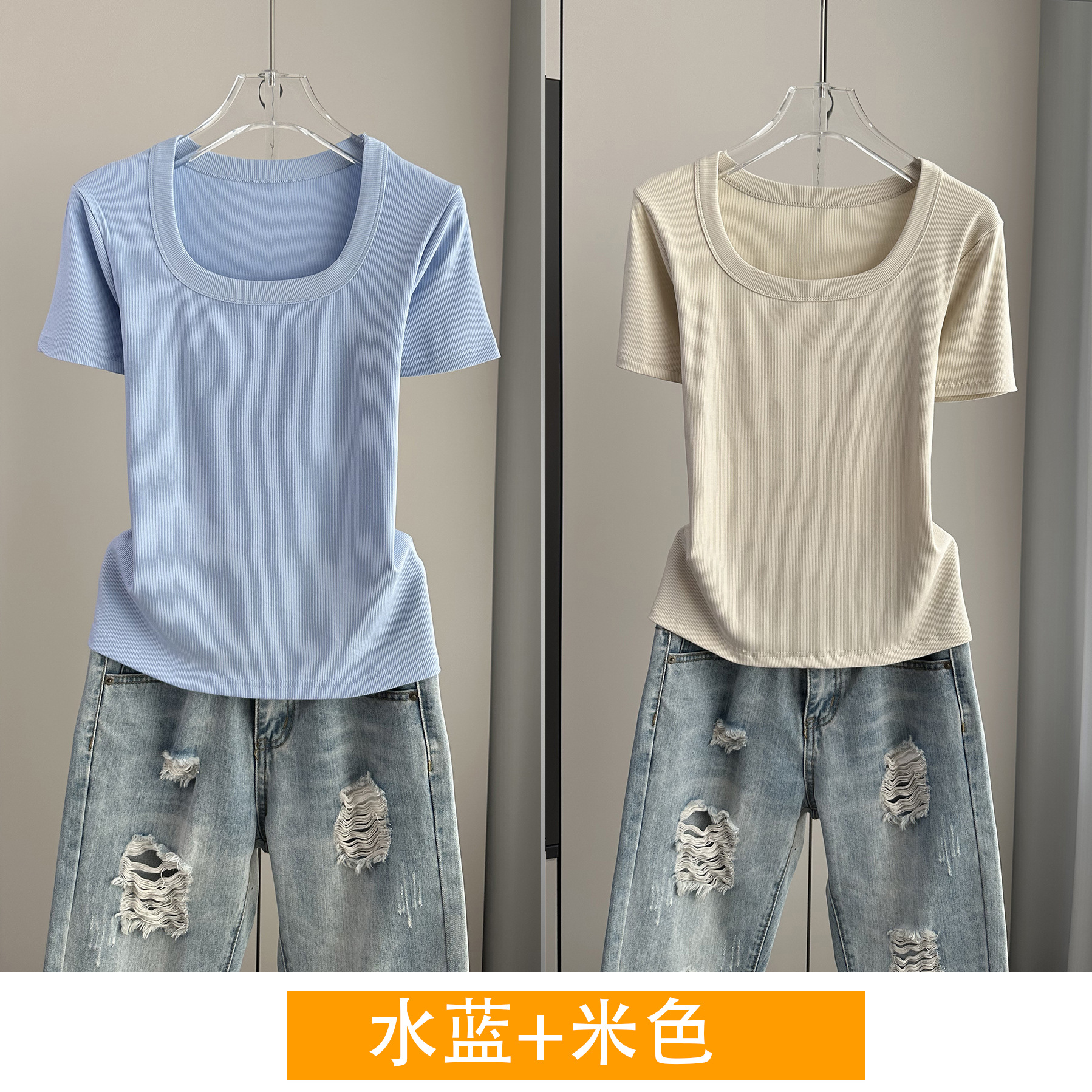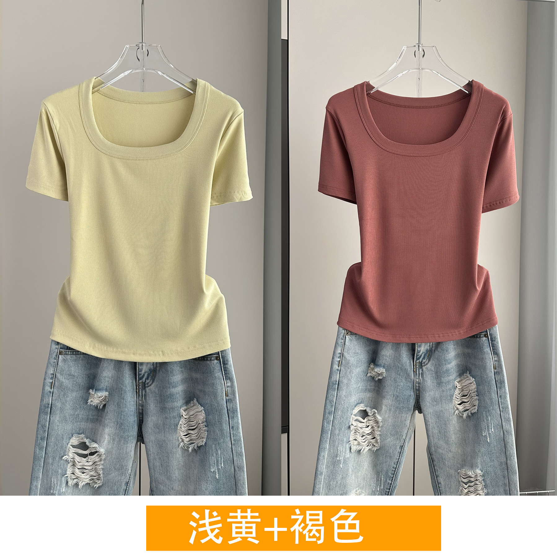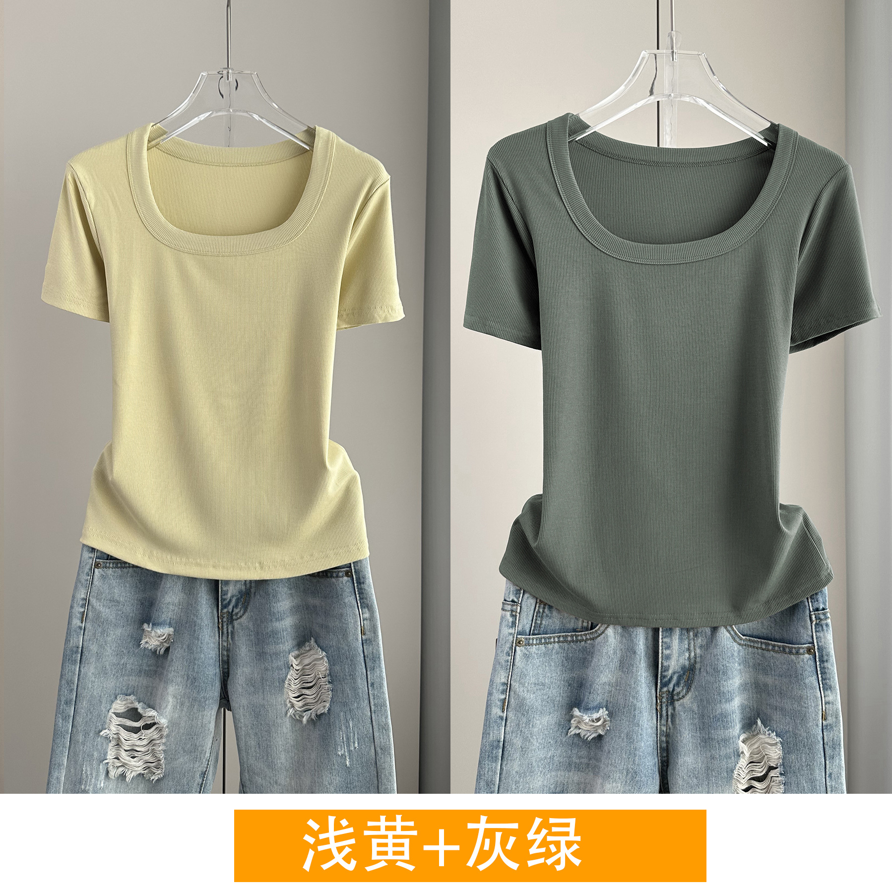 Главная страница > Женская футболка с короткими рукавами и обычными плечами, лето 2025, тонкий свободный утягивающий топ с U-образным вырезом и квадратным вырезом в рубчик для многослойности.