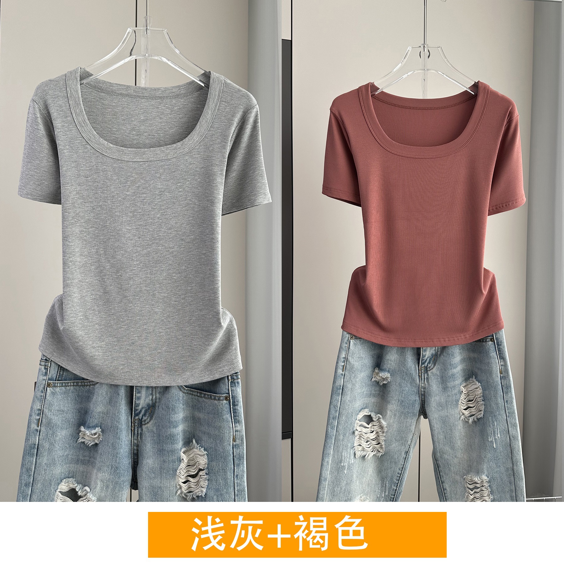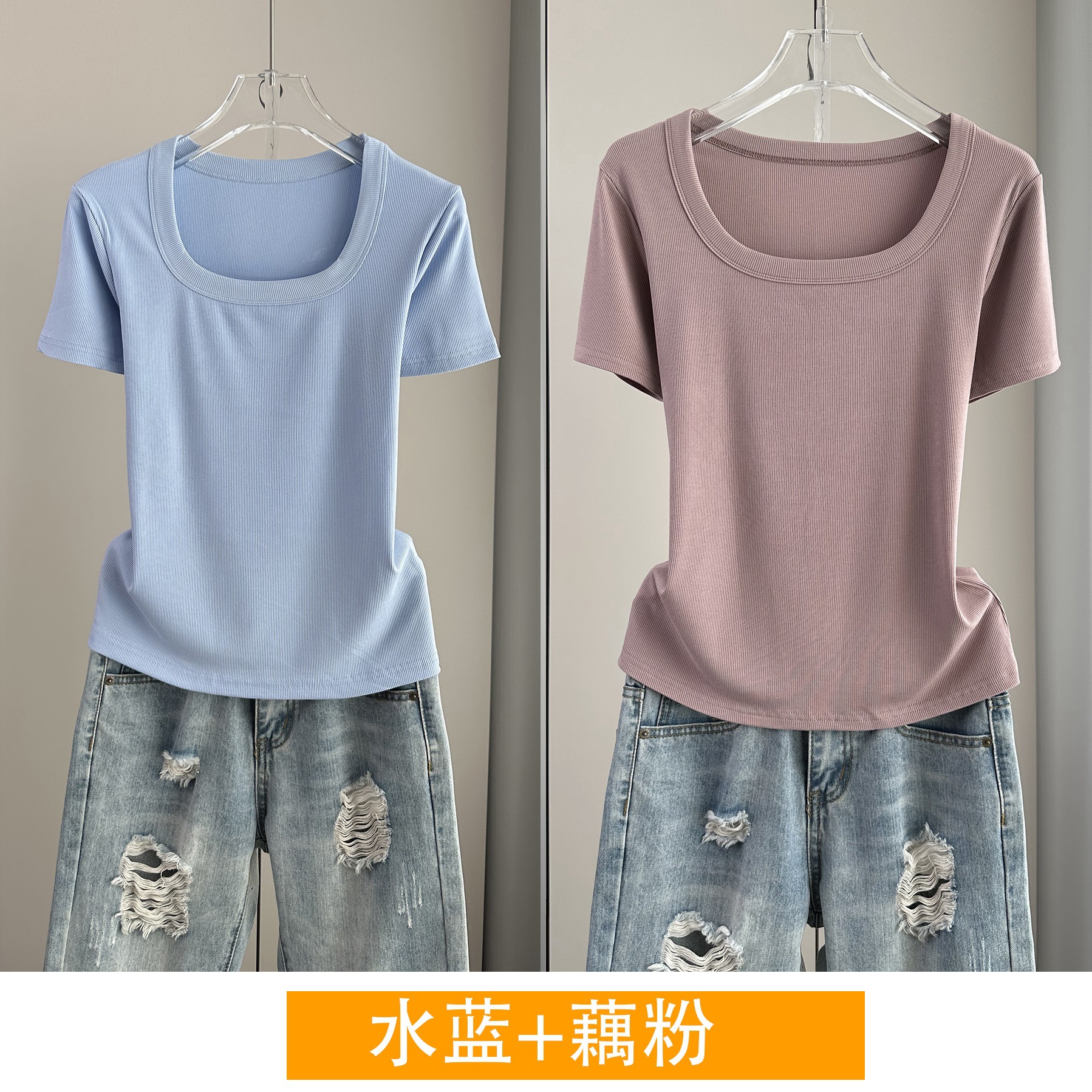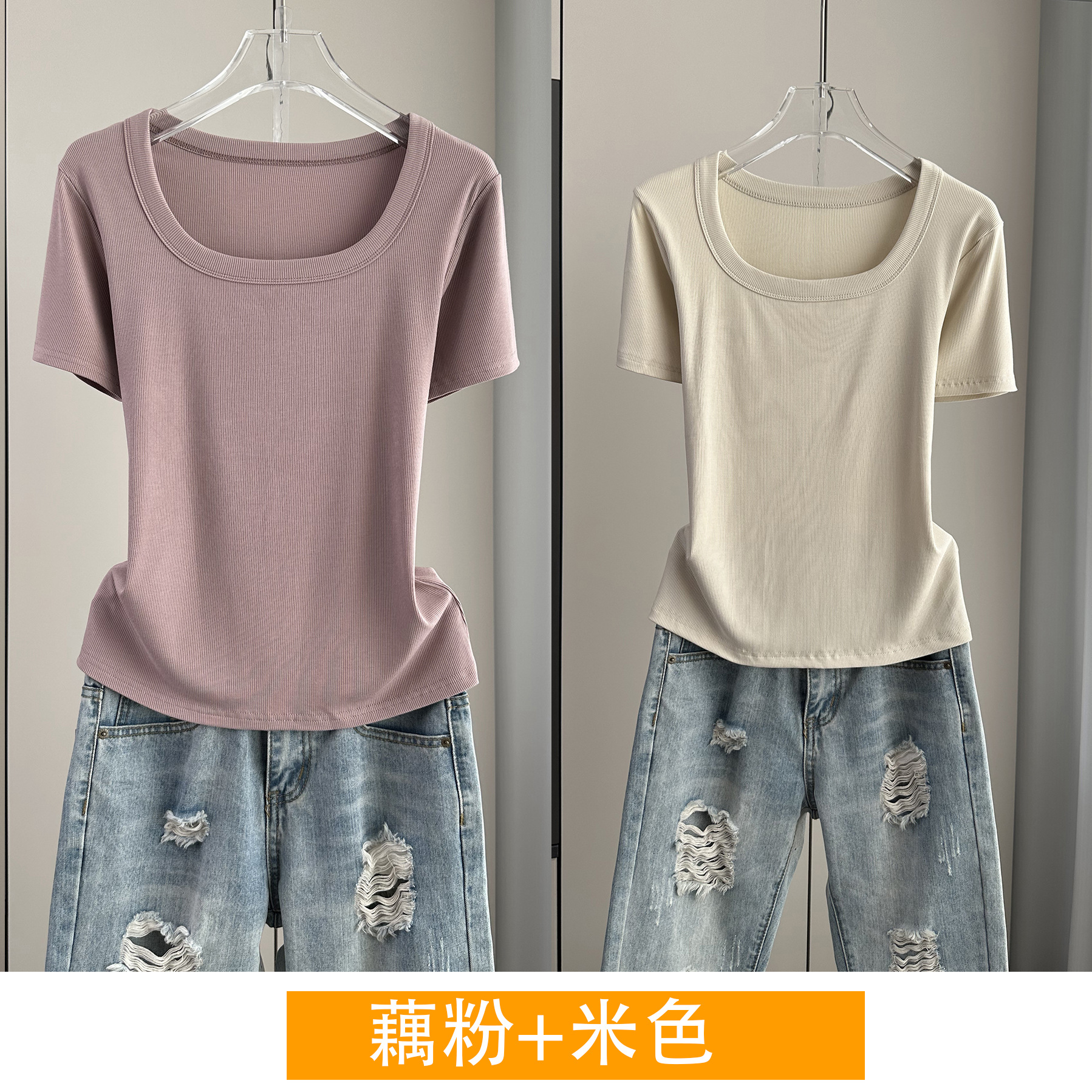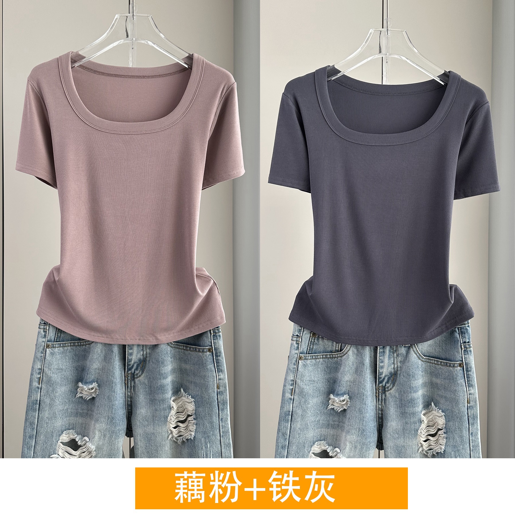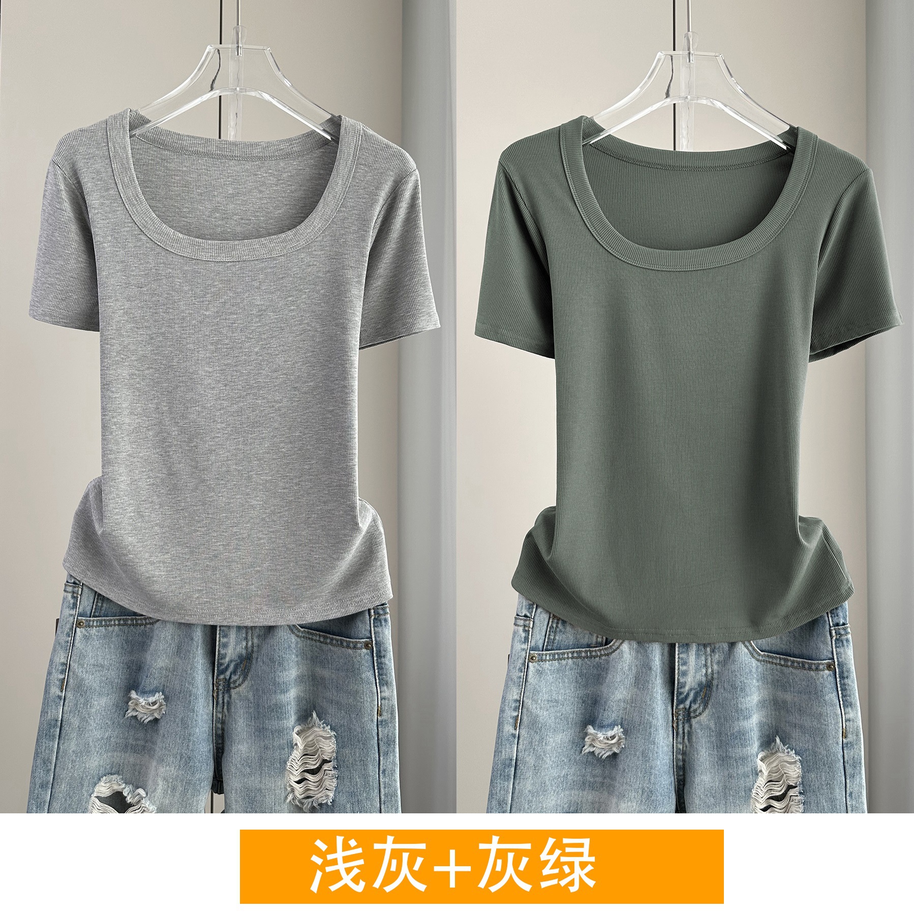 Главная страница > Женская футболка с короткими рукавами и обычными плечами, лето 2025, тонкий свободный утягивающий топ с U-образным вырезом и квадратным вырезом в рубчик для многослойности.