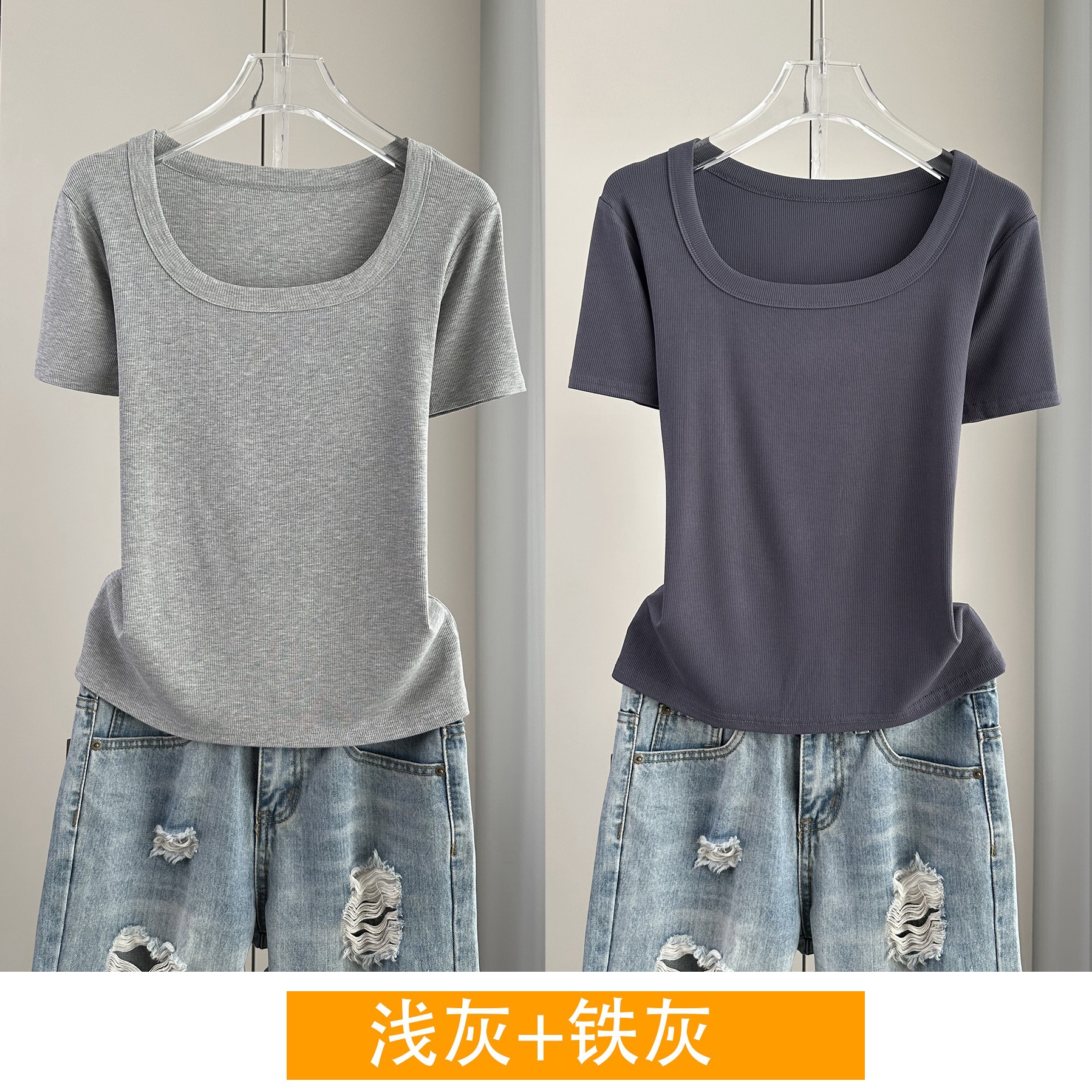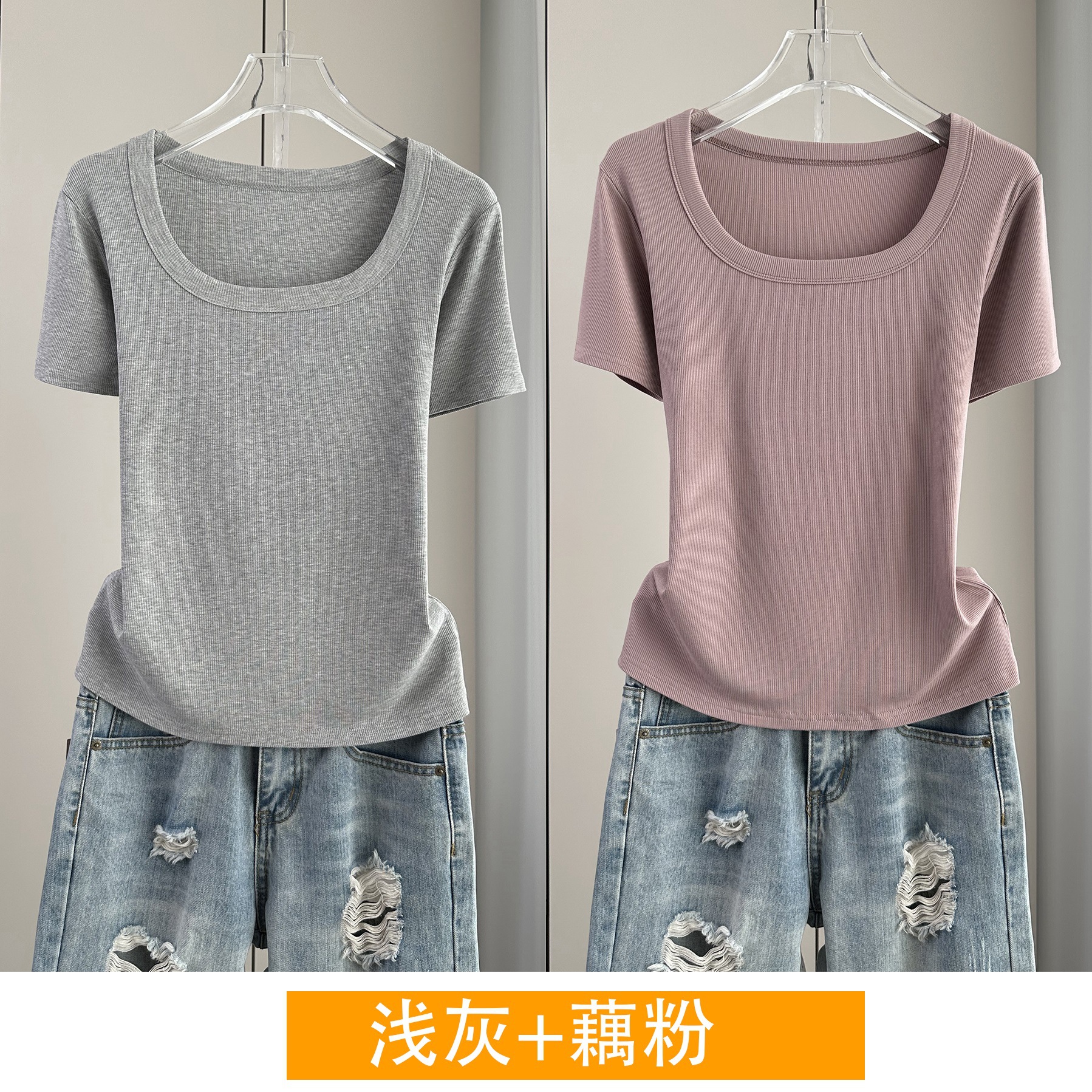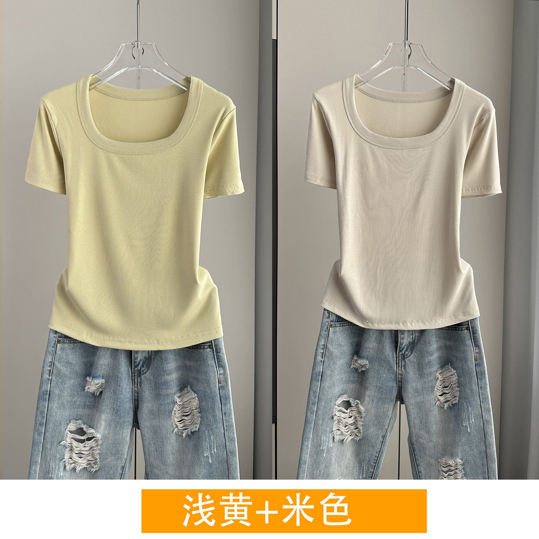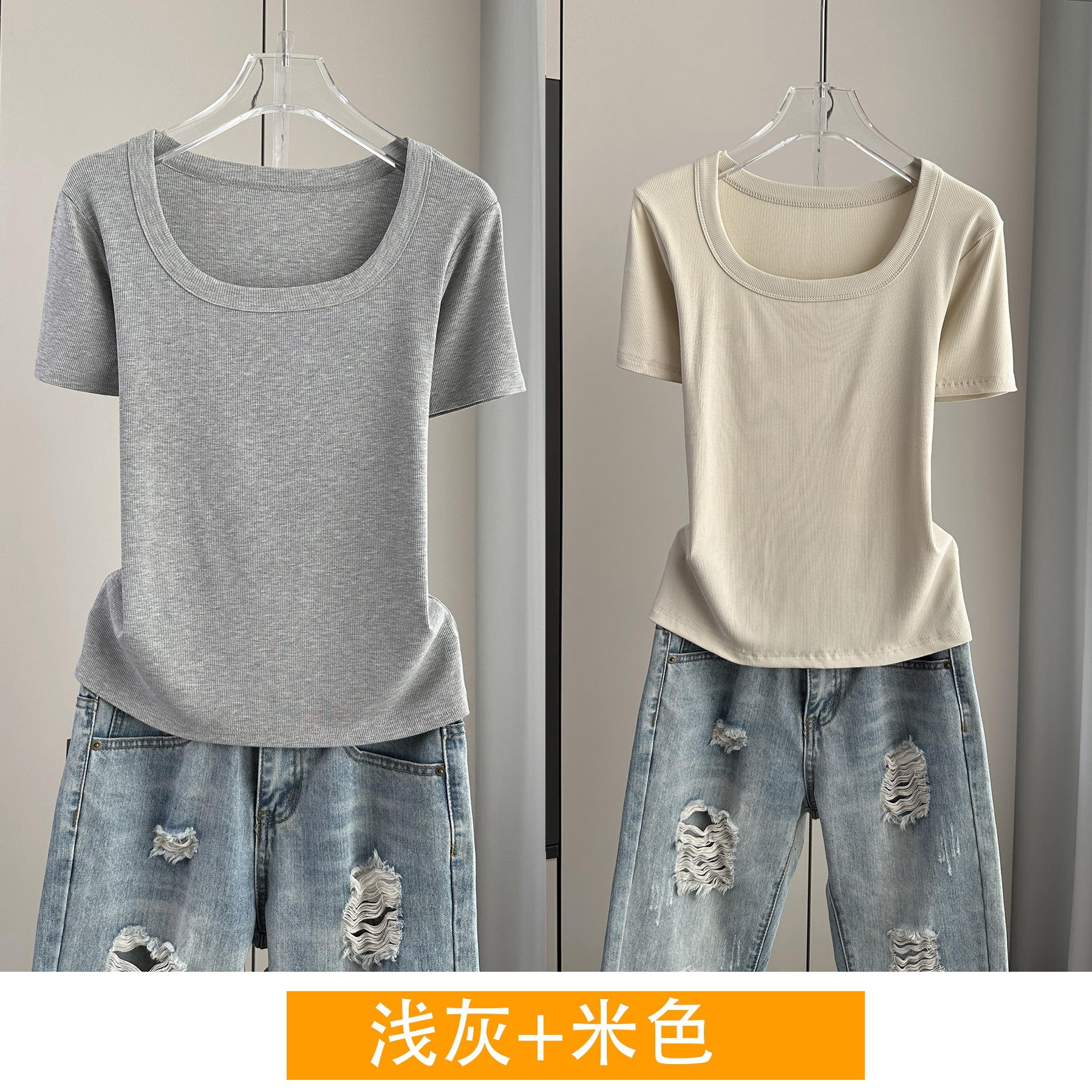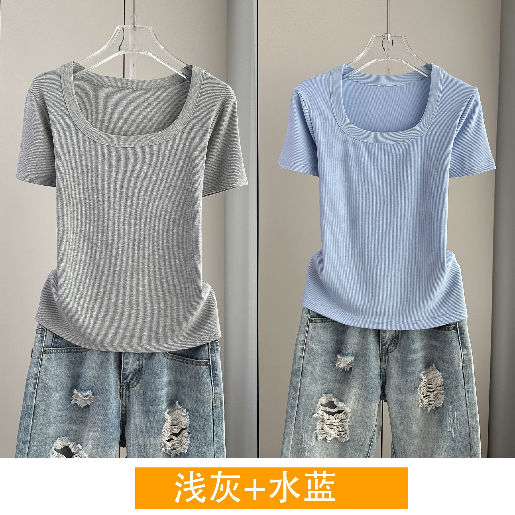 Главная страница > Женская футболка с короткими рукавами и обычными плечами, лето 2025, тонкий свободный утягивающий топ с U-образным вырезом и квадратным вырезом в рубчик для многослойности.