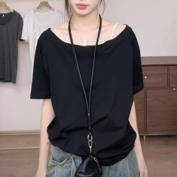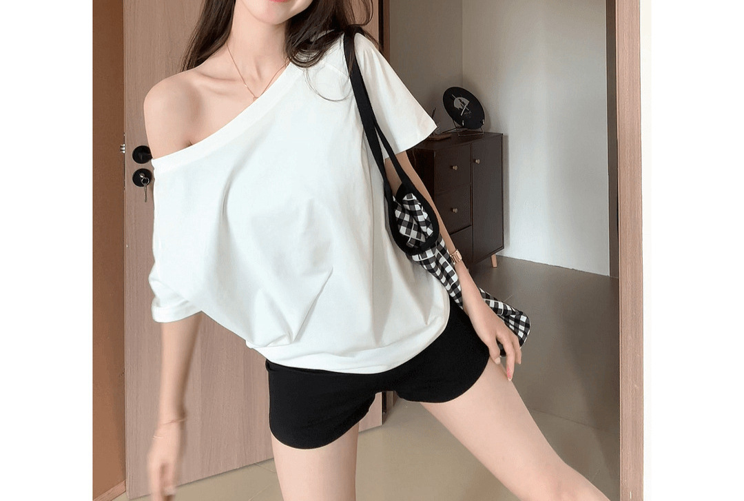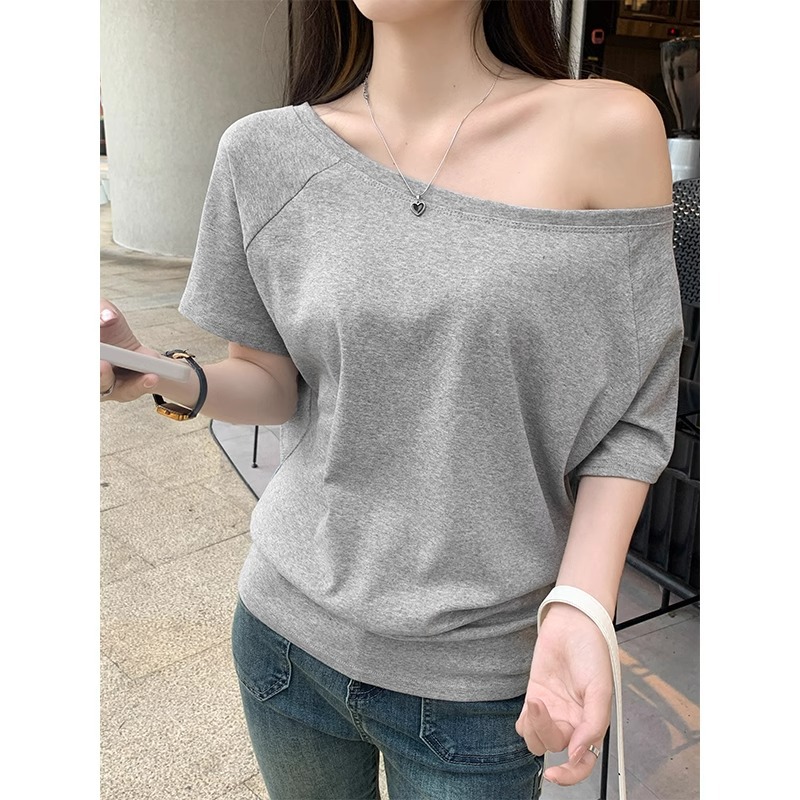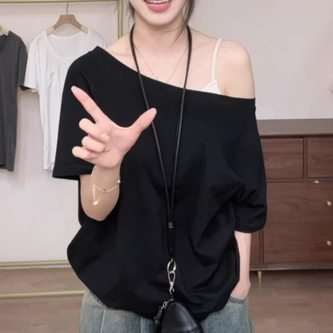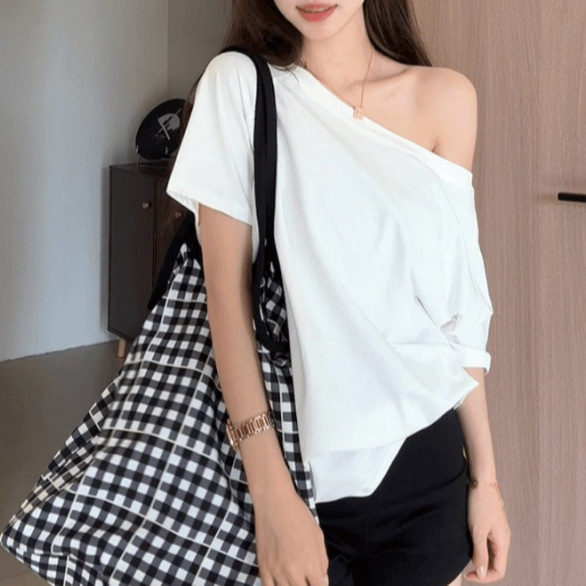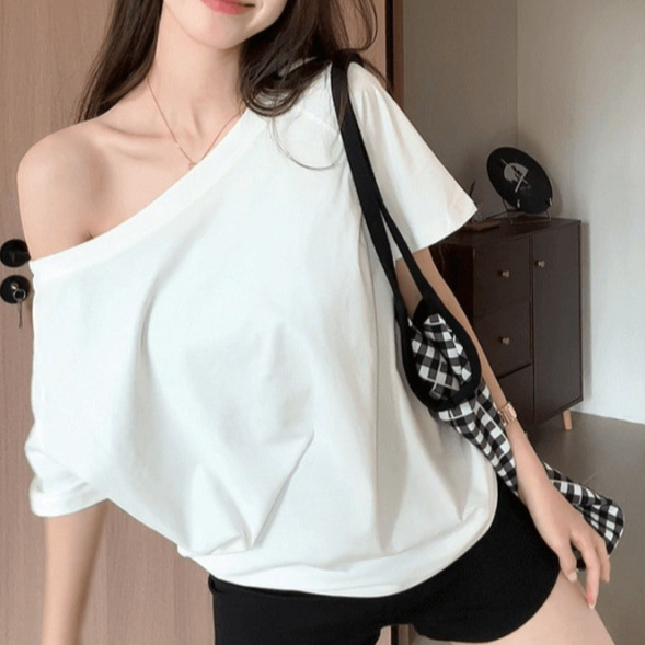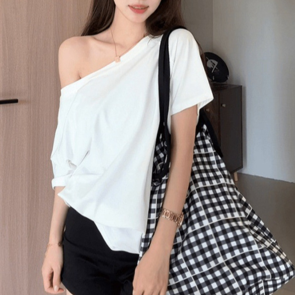 Главная страница > Белая футболка с косым плечом и открытым плечом, женская футболка с короткими рукавами, лето 2025, новый свободный утягивающий сексуальный топ на одно плечо