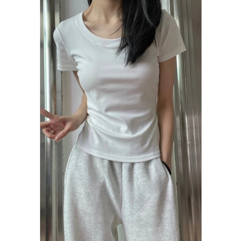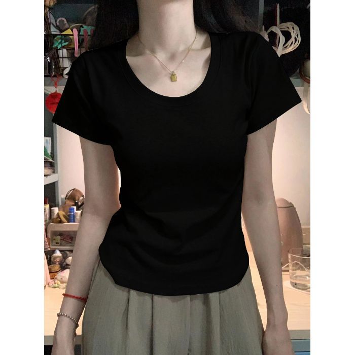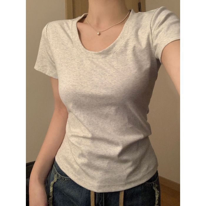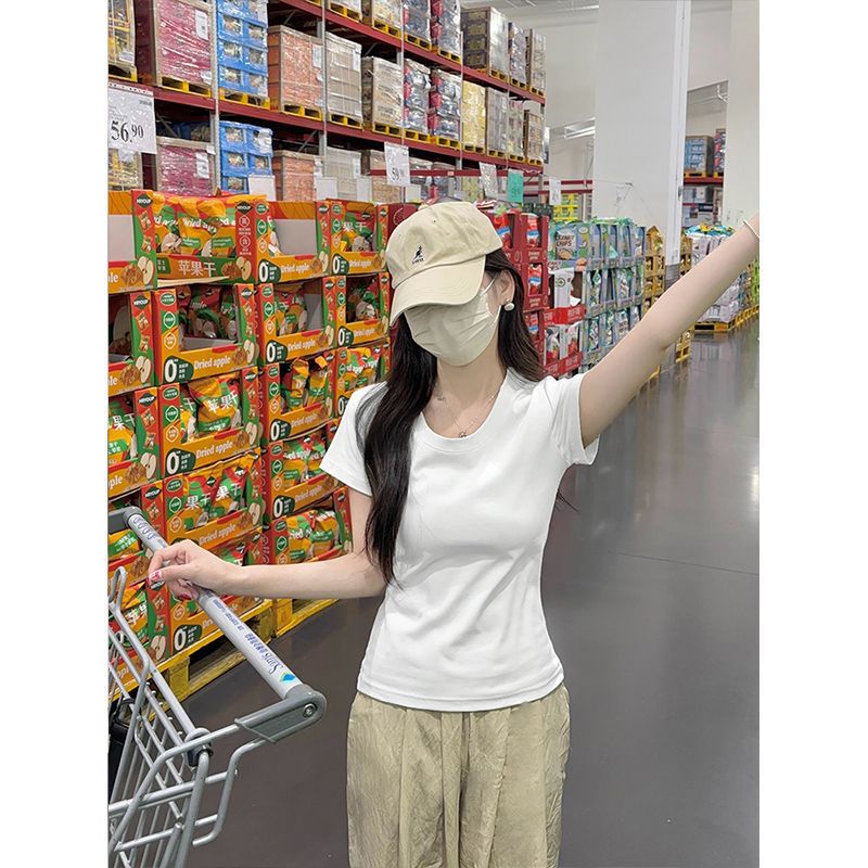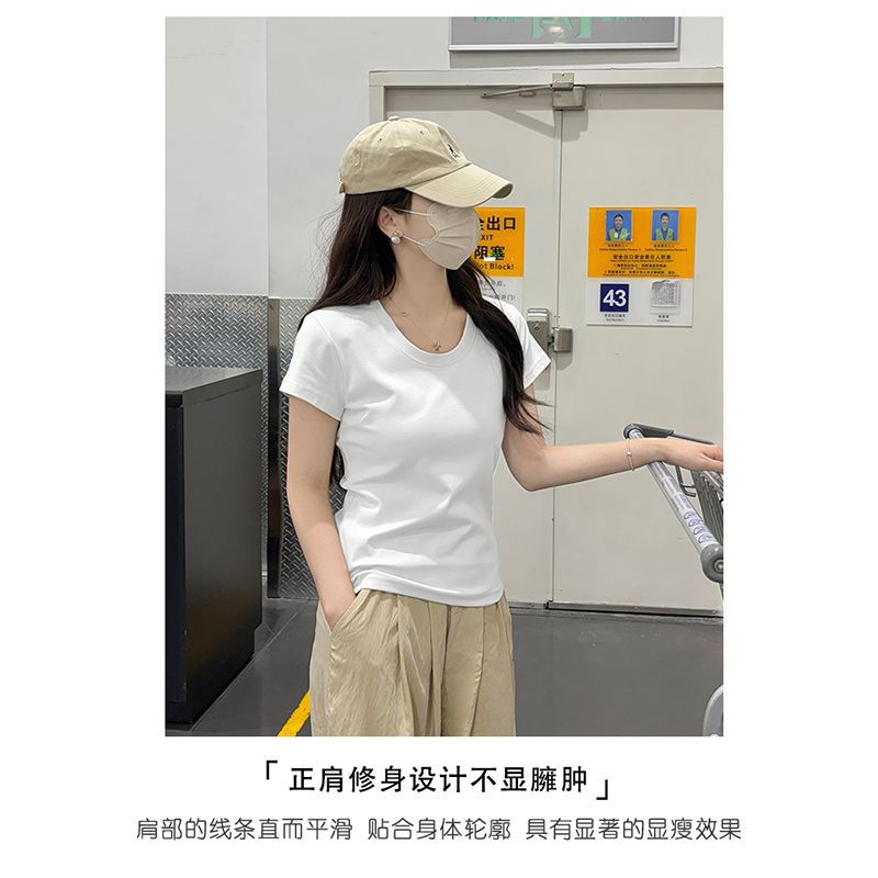 Главная страница > Белая женская футболка с короткими рукавами на правое плечо, лето 2025, новый стиль, U-образный вырез, большой вырез, тонкая талия, внутренний короткий топ с половиной рукавов