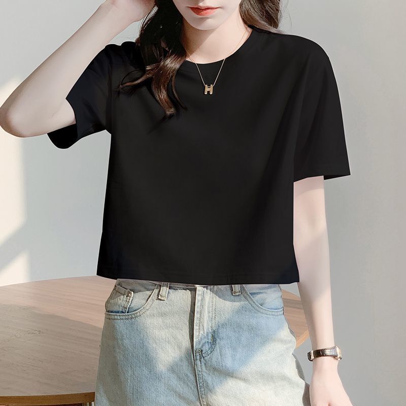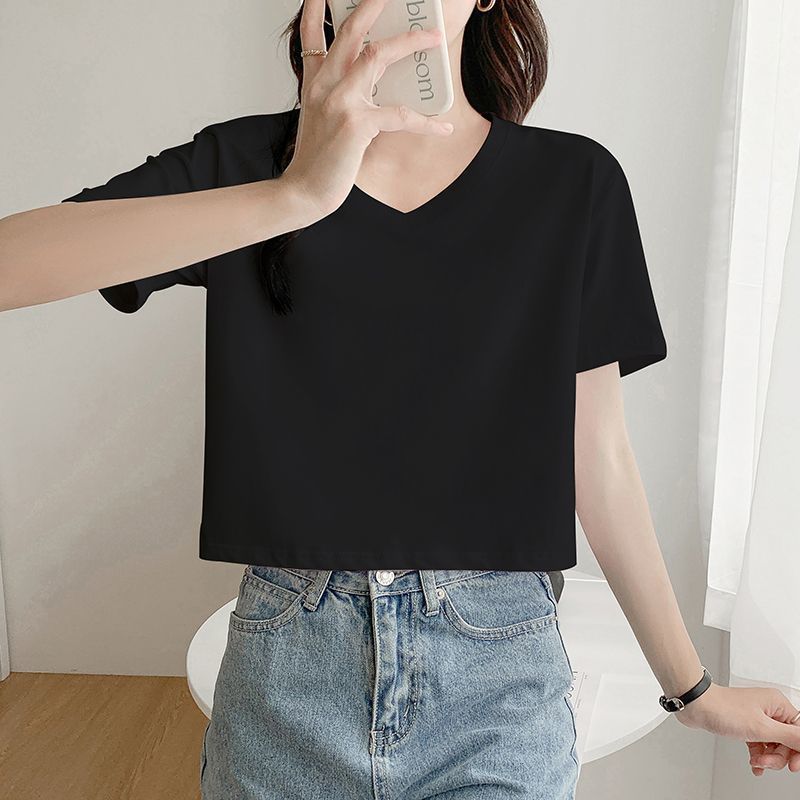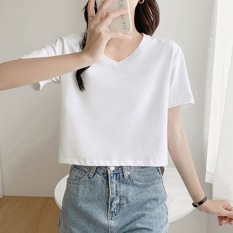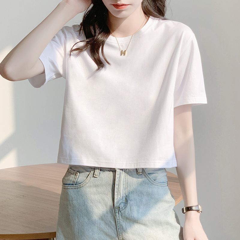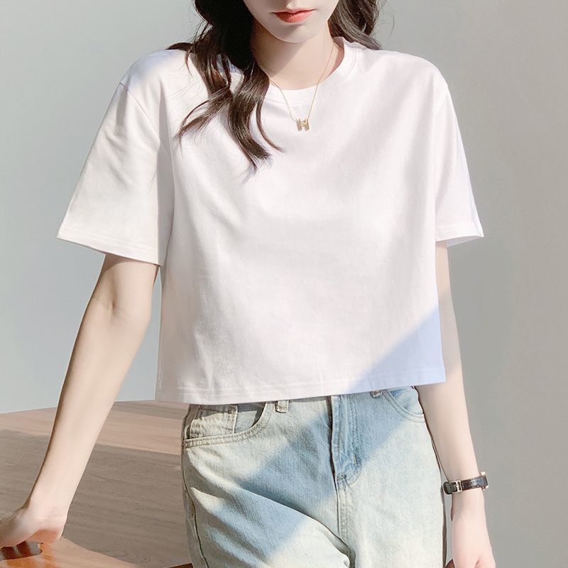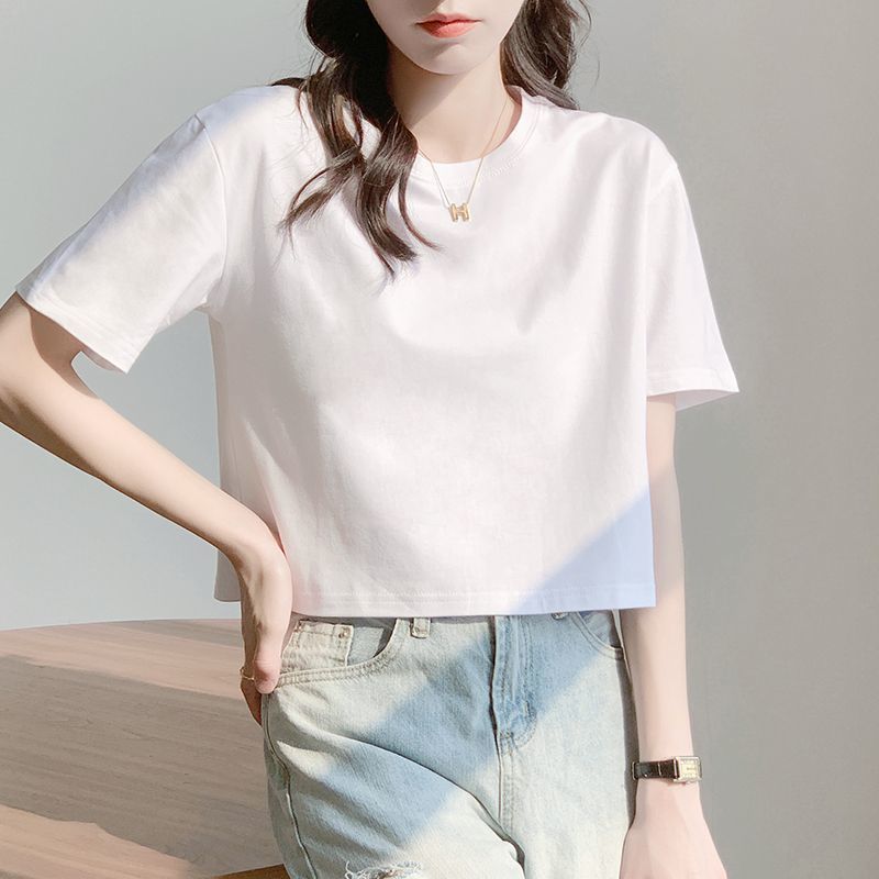 Главная страница > Белая свободная короткая футболка, женская летняя футболка с короткими рукавами и высокой талией, обнажающая пупок, новый стиль, утягивающий топ