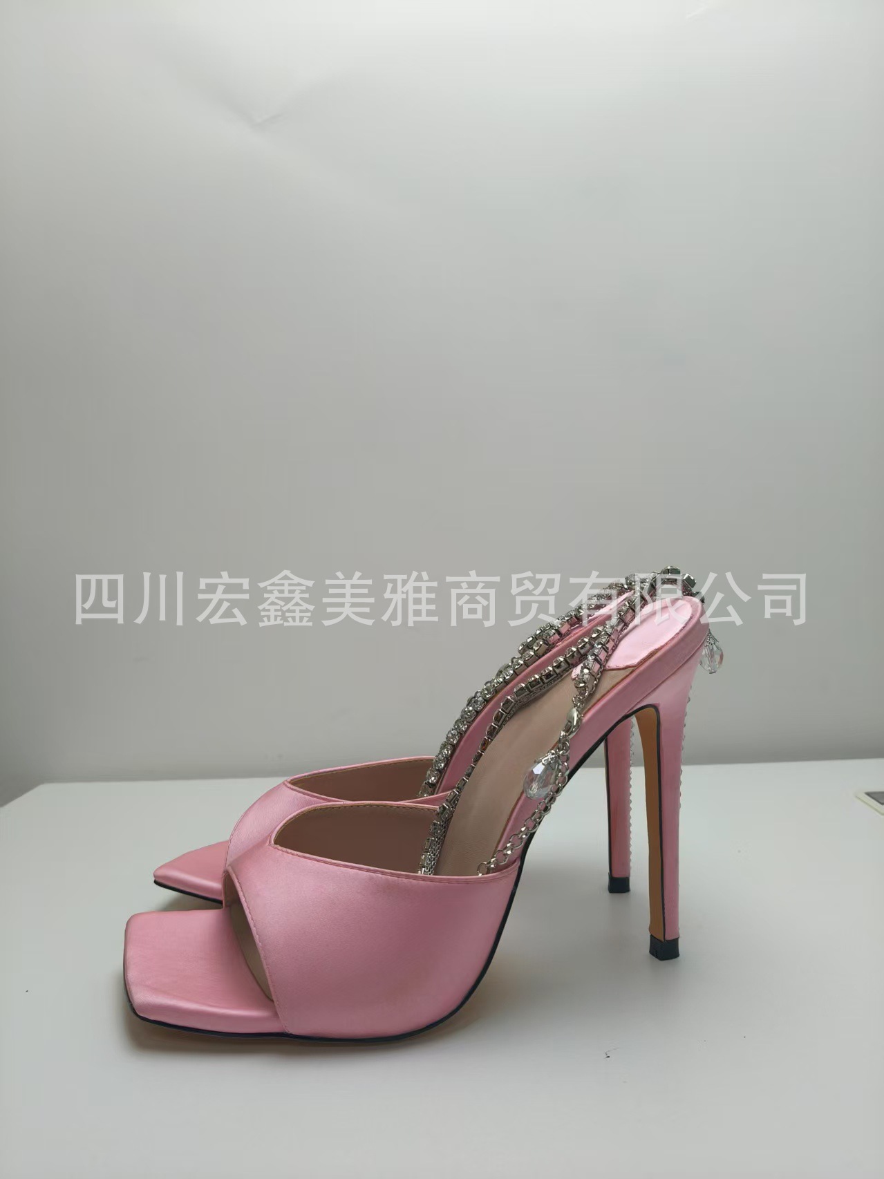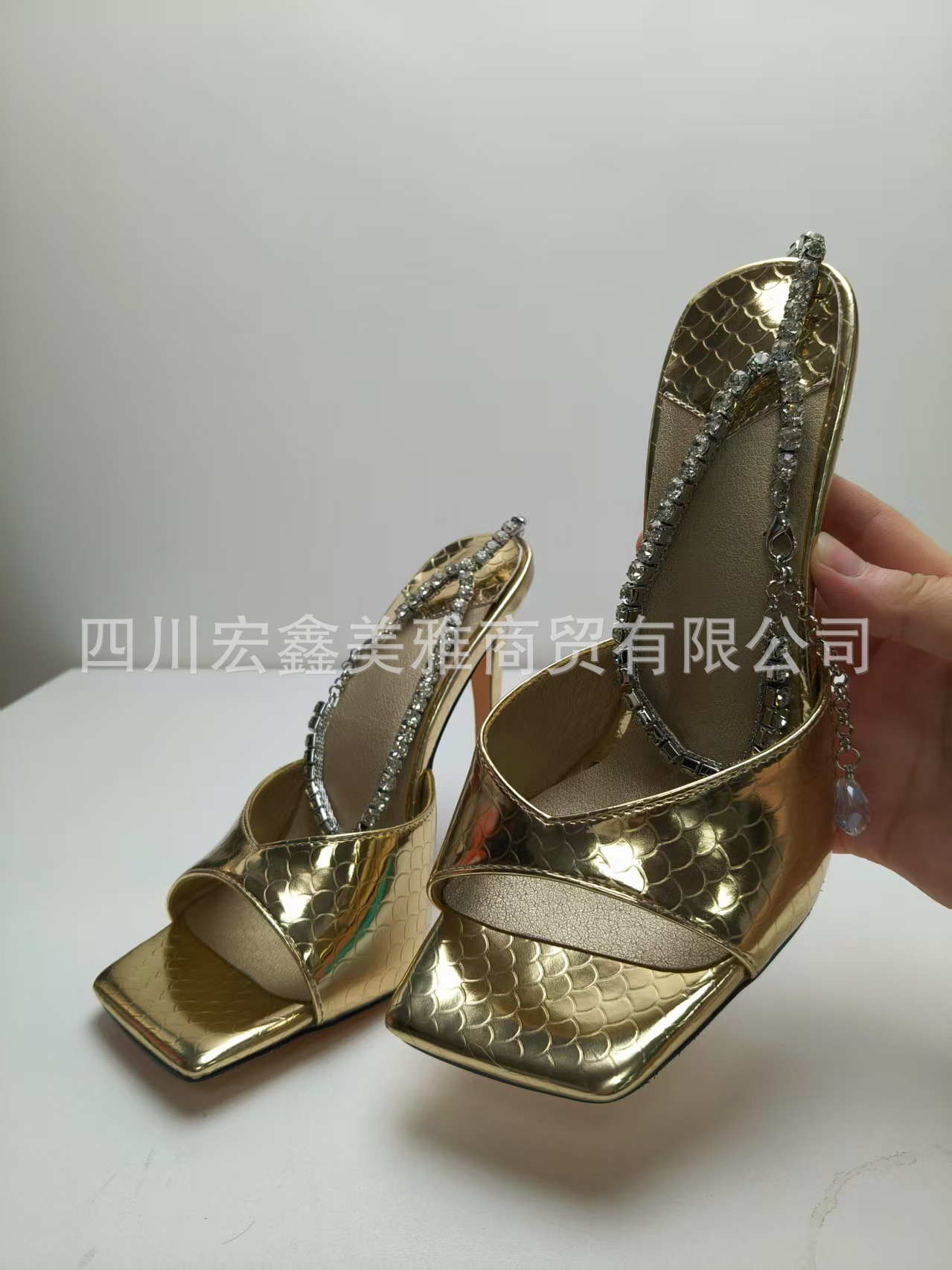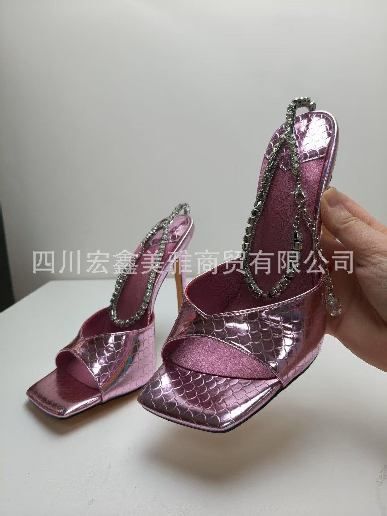 Женские босоножки-слипоны на очень высоком каблуке-шпильке с квадратным открытым носком, ажурным рисунком в виде рыбки, цепочкой и большими размерами, весна 2025 года.