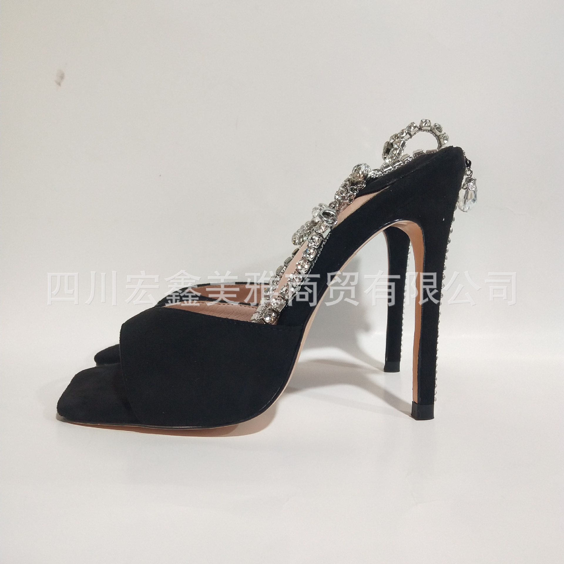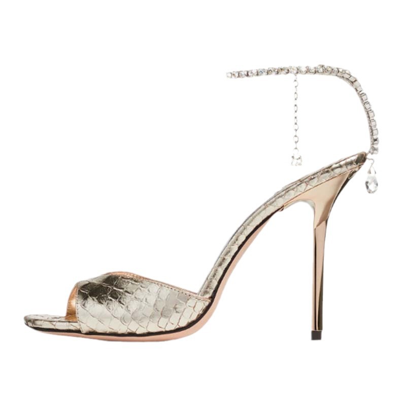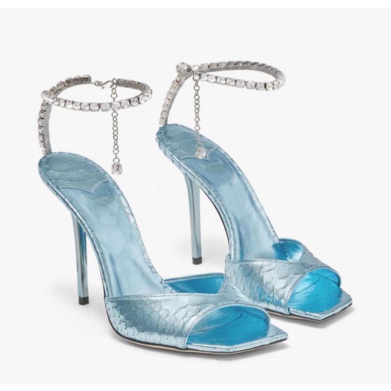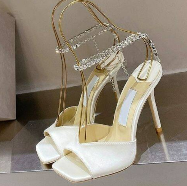 Женские босоножки-слипоны на очень высоком каблуке-шпильке с квадратным открытым носком, ажурным рисунком в виде рыбки, цепочкой и большими размерами, весна 2025 года.