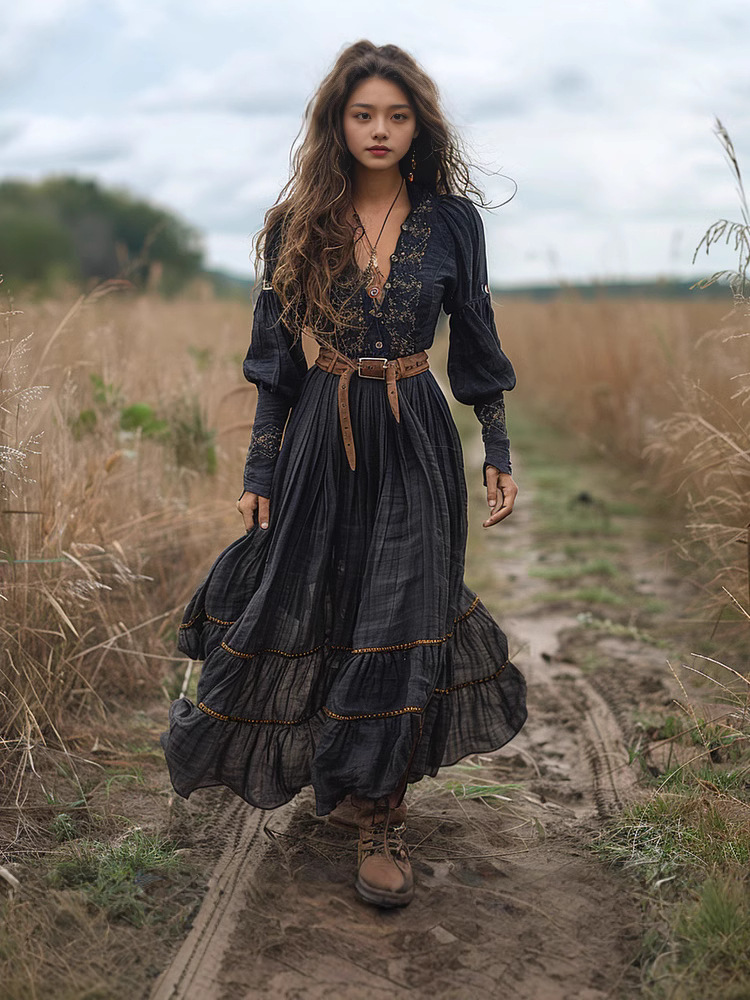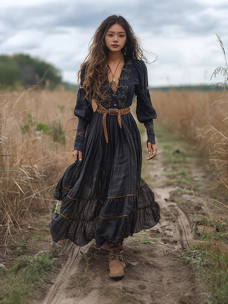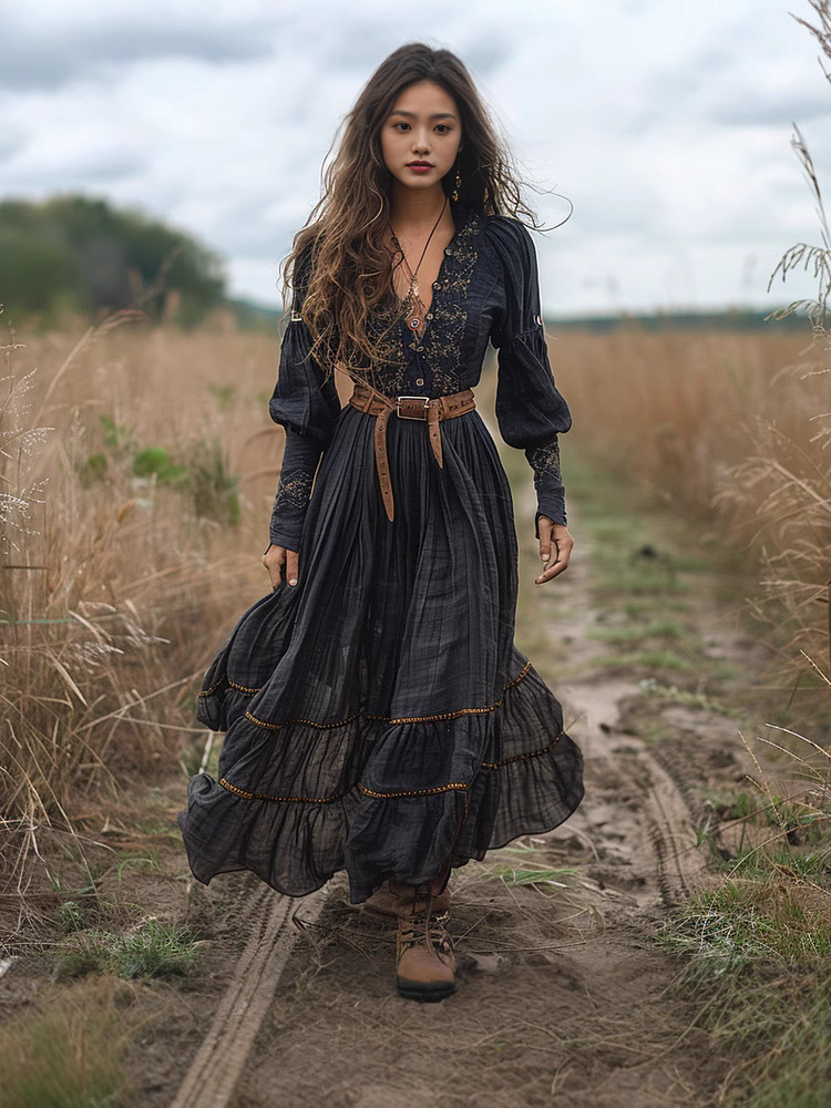 Главная страница > Трансграничные европейские и американские горячие продажи новые вышитые винтажные V-образные вырезы женские длинные рукава длинные платья идиллический повседневные платья с длинными рукавами