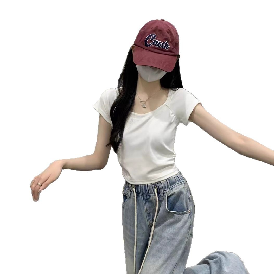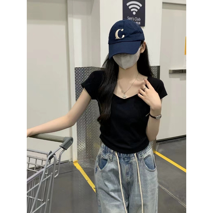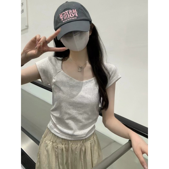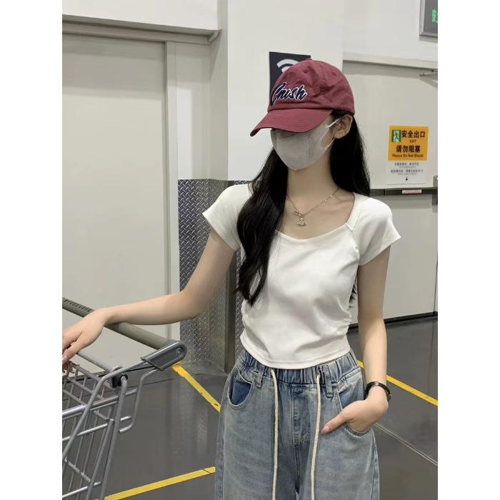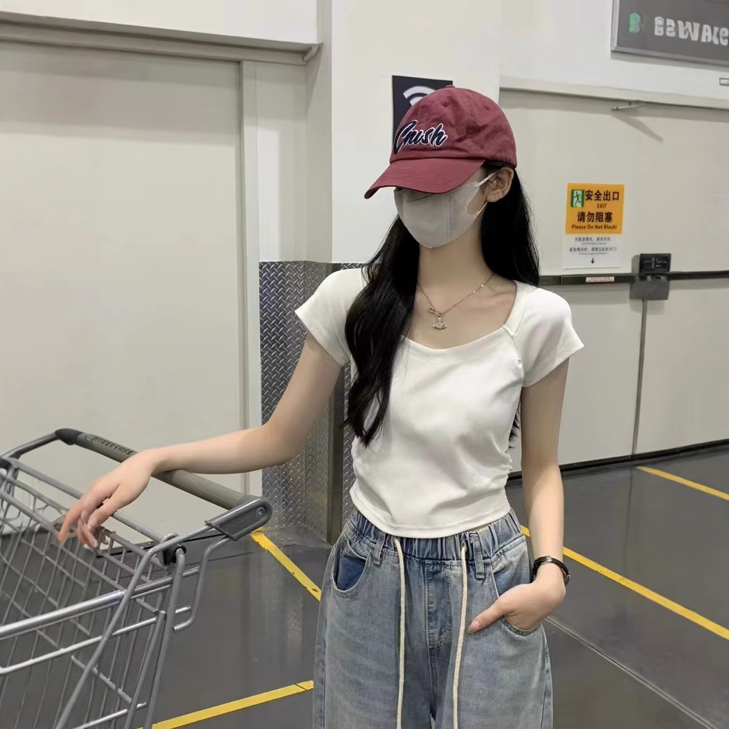 Главная страница > Женская футболка с квадратным вырезом и правым плечом, летняя футболка с короткими рукавами, сексуальный тонкий дизайн, нишевый тонкий короткий топ, модный