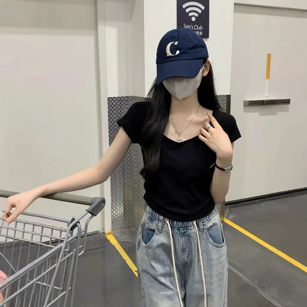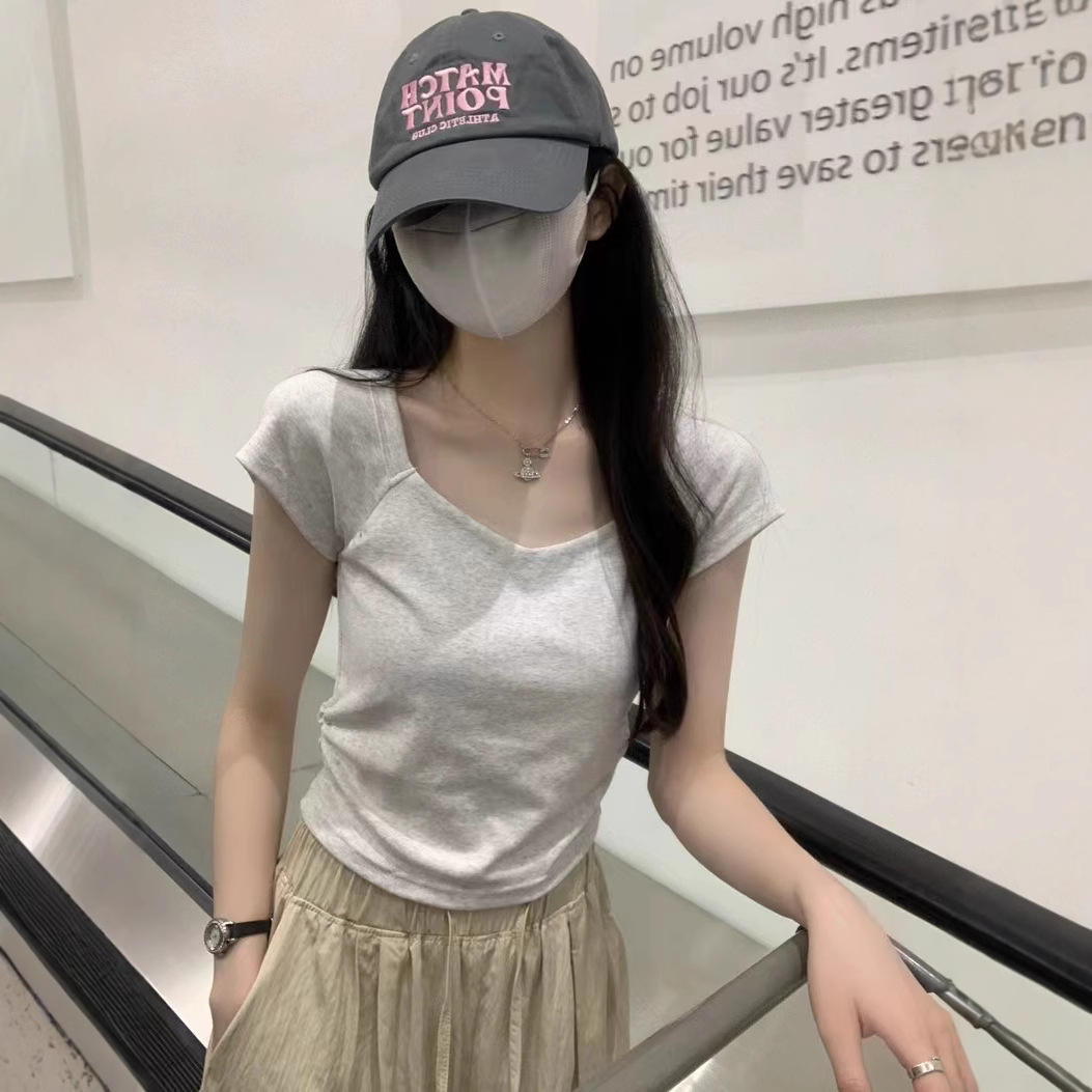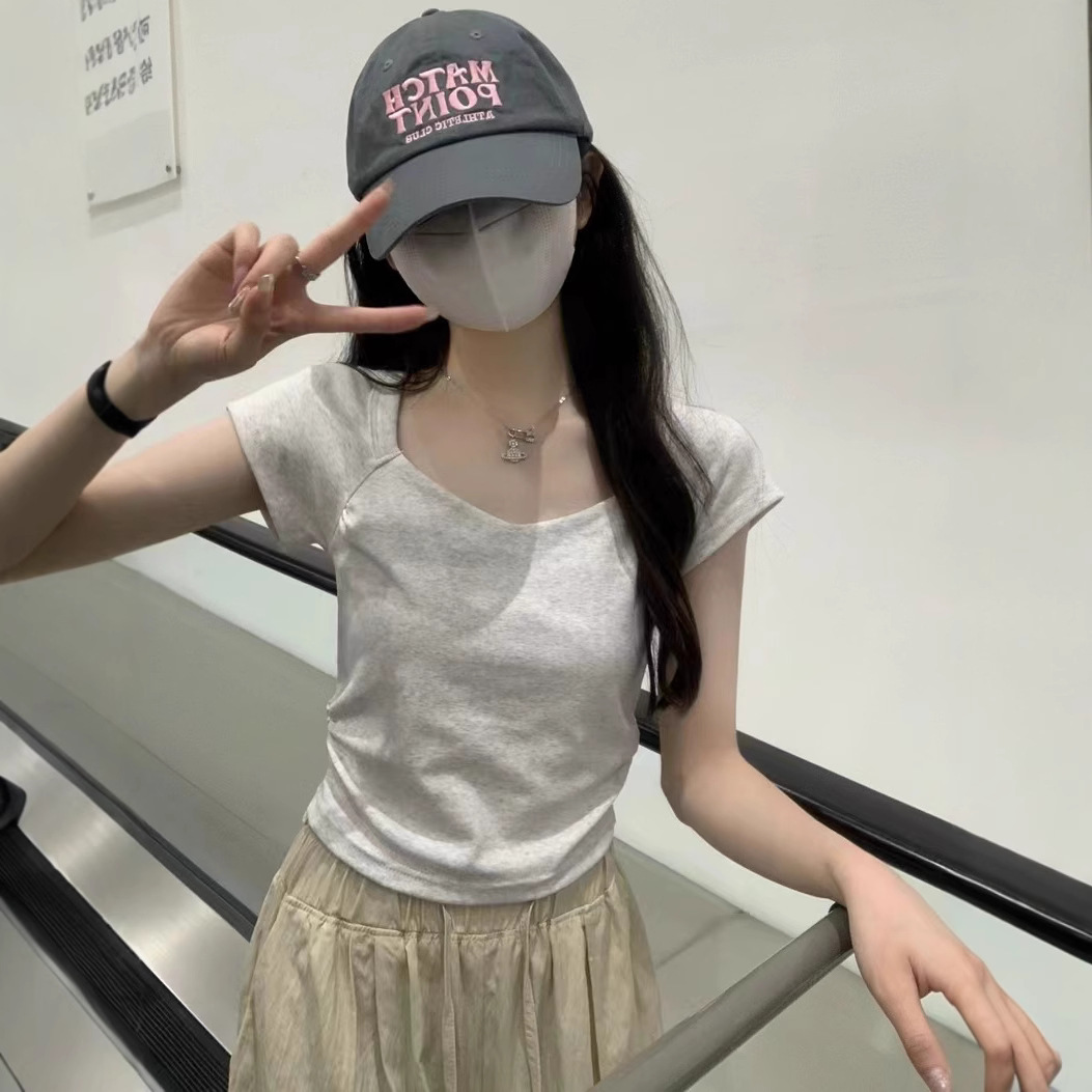 Главная страница > Женская футболка с квадратным вырезом и правым плечом, летняя футболка с короткими рукавами, сексуальный тонкий дизайн, нишевый тонкий короткий топ, модный