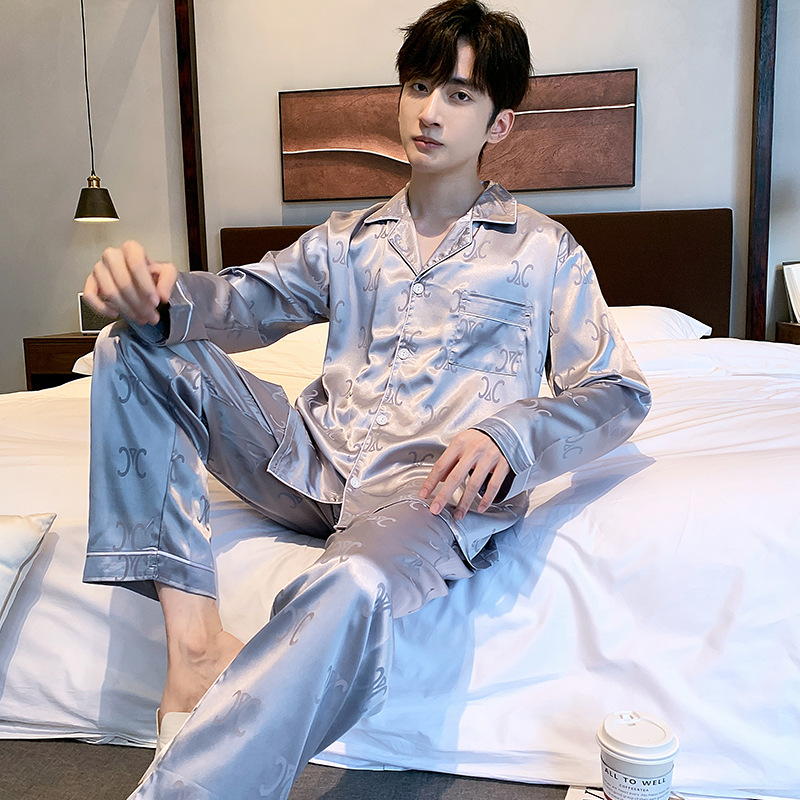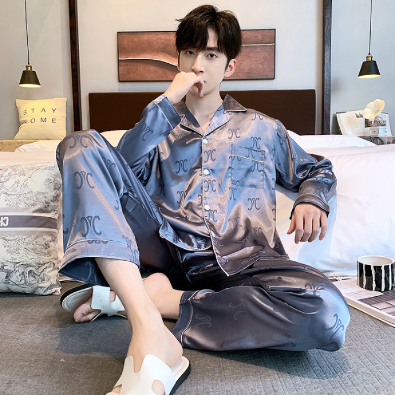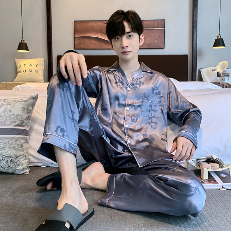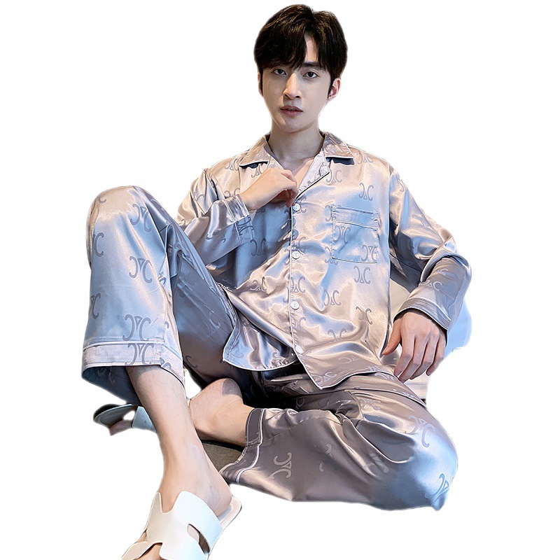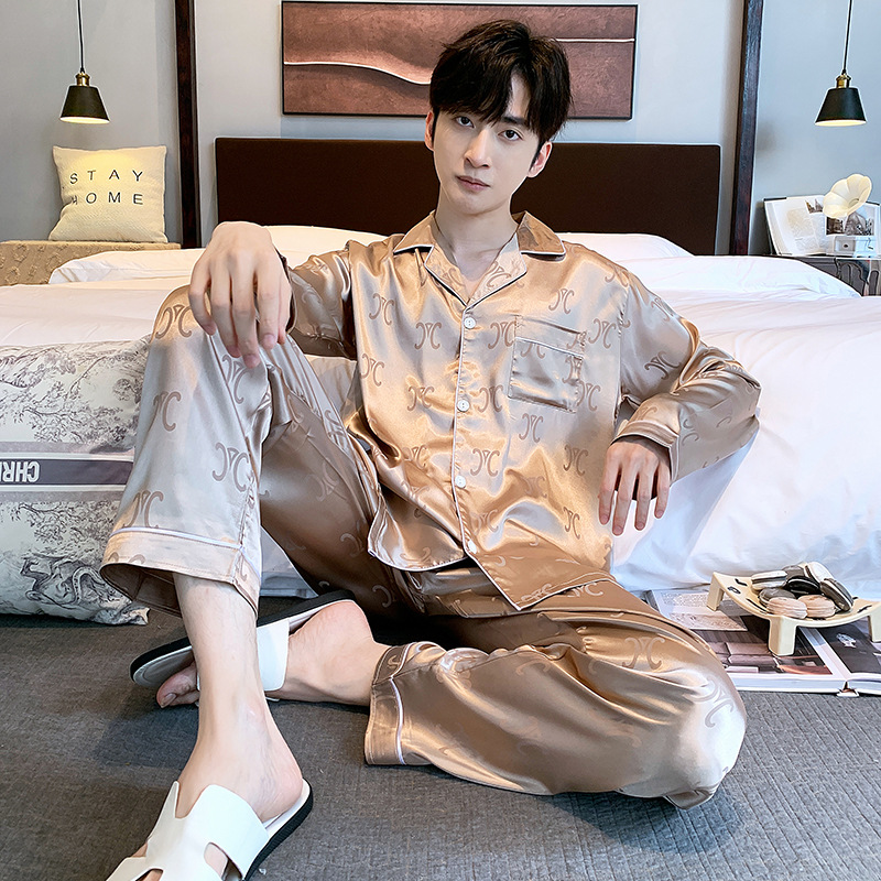 Главная страница > 2023 осень новая Пижама Мужская 5050 жаккардовый ледяной Шелковый кардиган с лацканами Свободная Домашняя одежда комплект из двух предметов