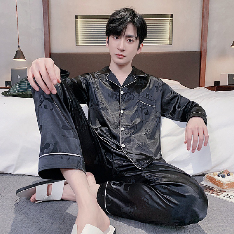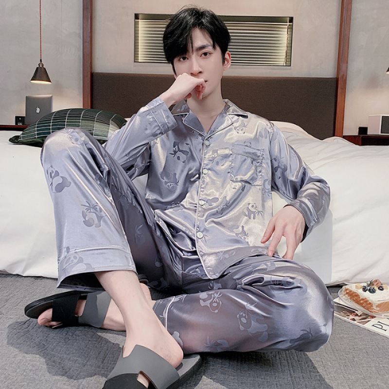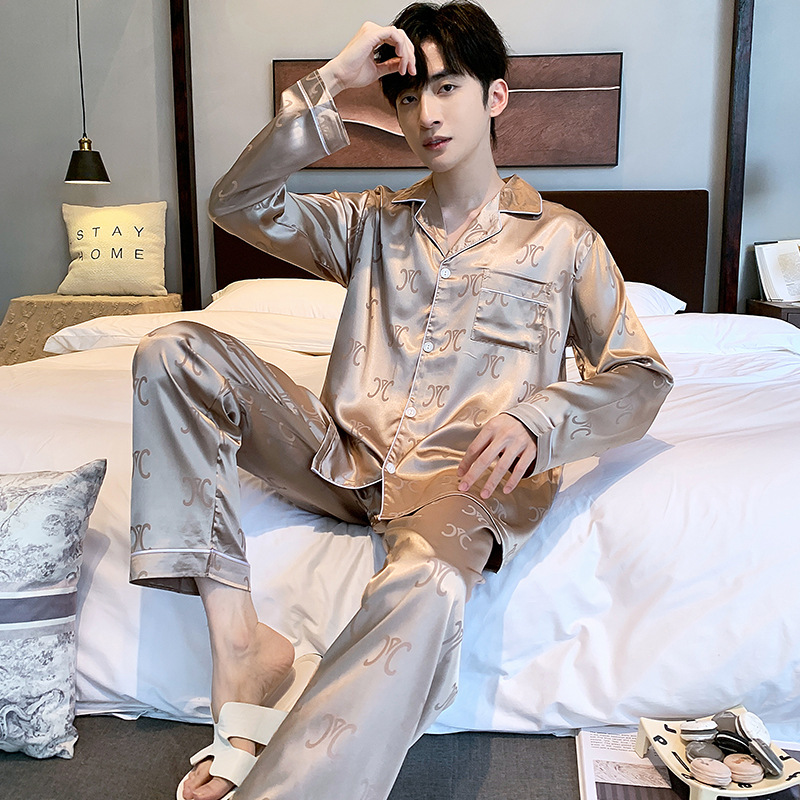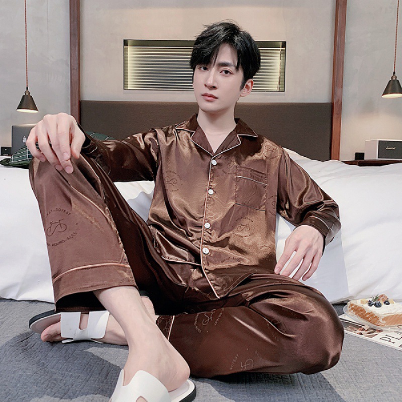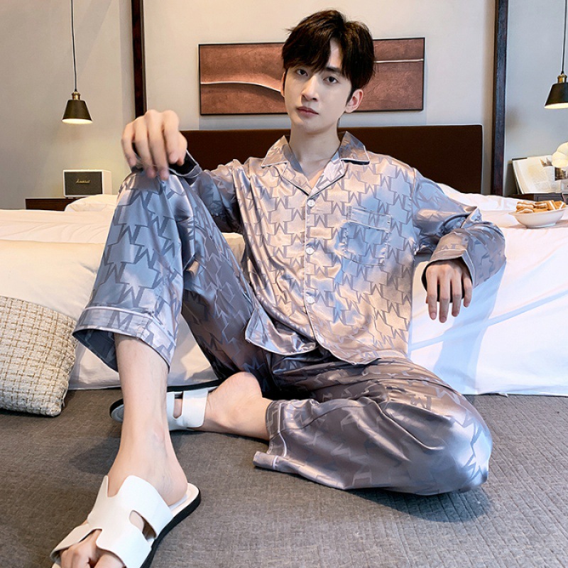Главная страница > 2023 осень новая Пижама Мужская 5050 жаккардовый ледяной Шелковый кардиган с лацканами Свободная Домашняя одежда комплект из двух предметов