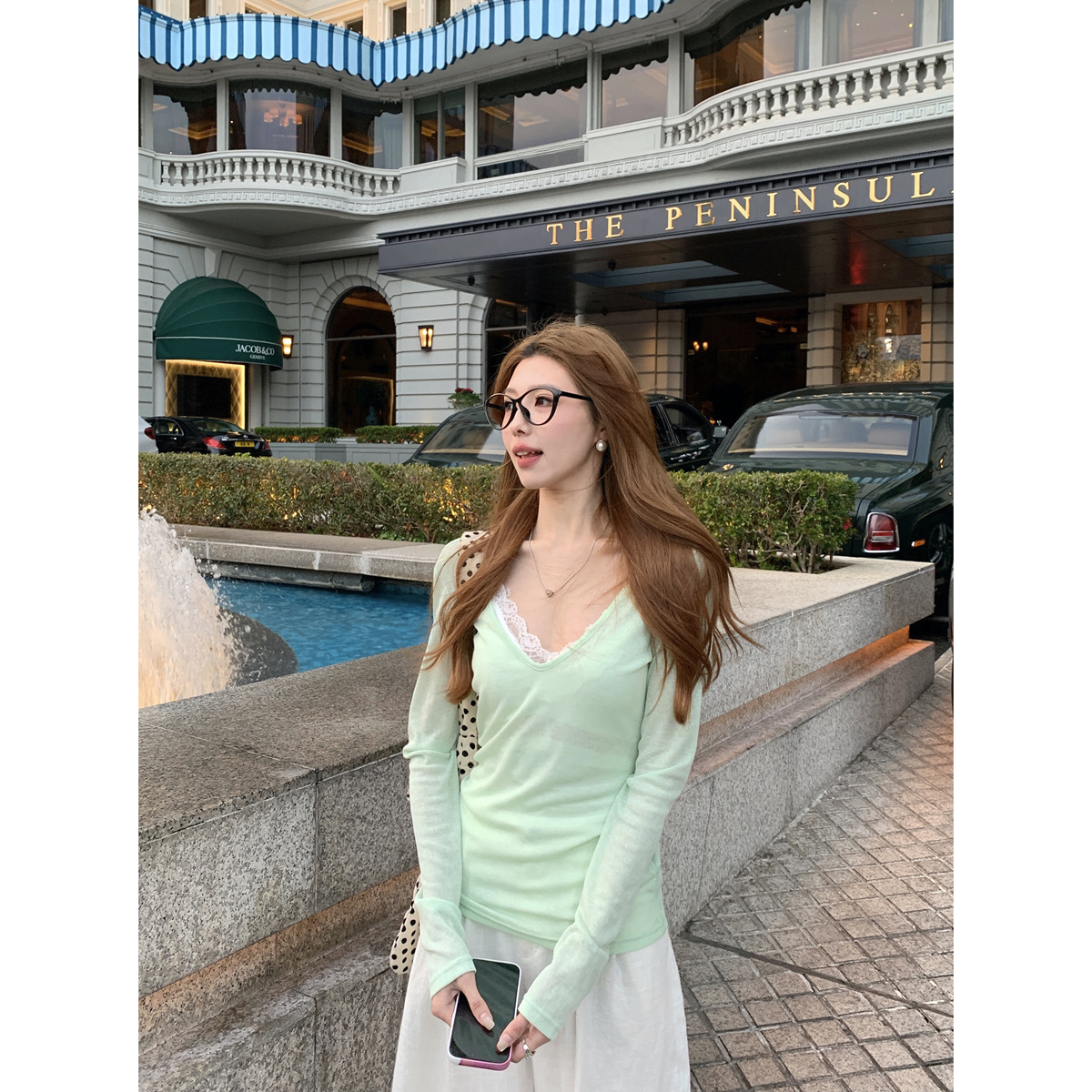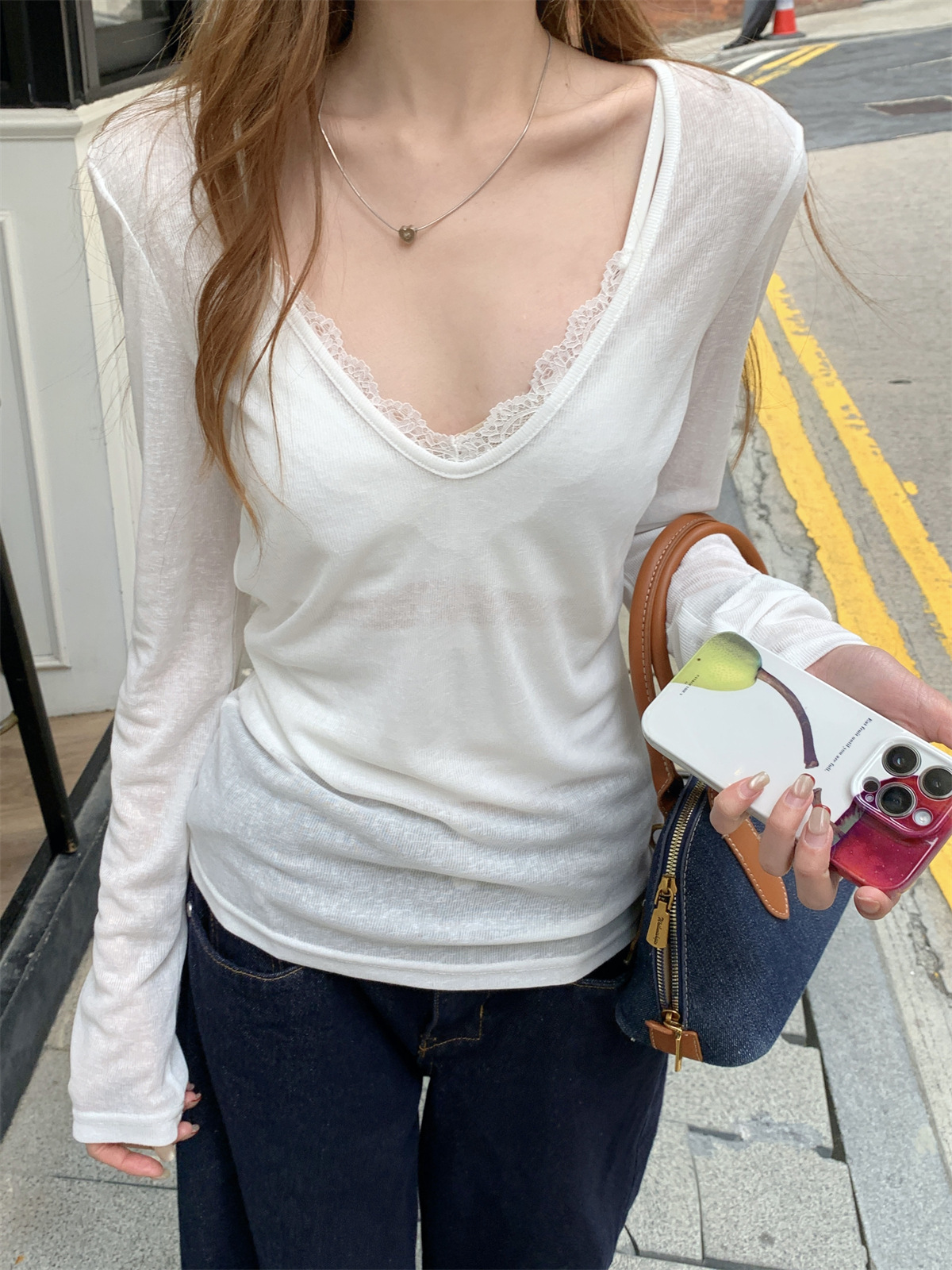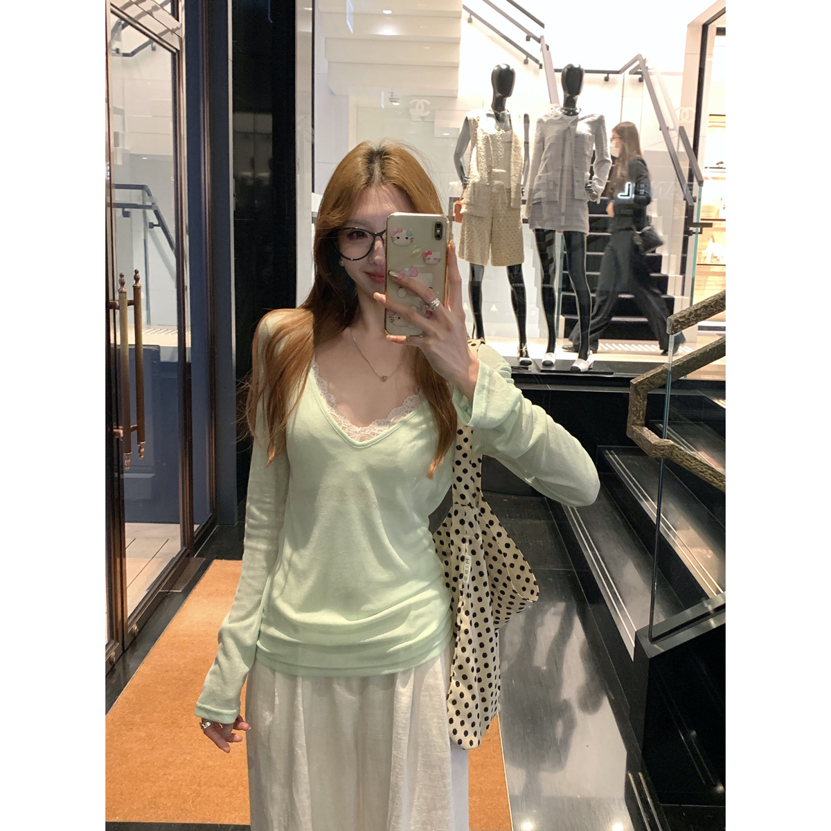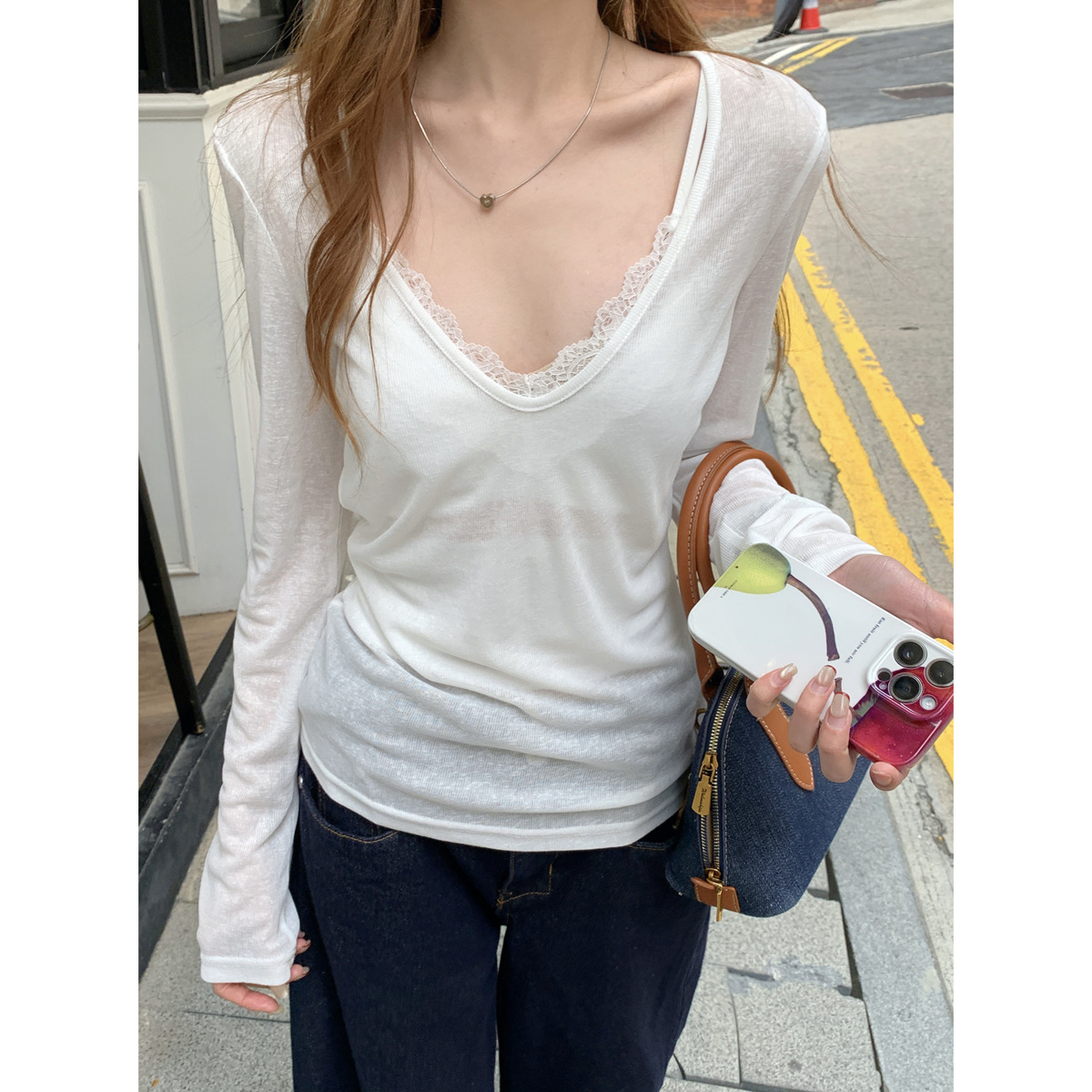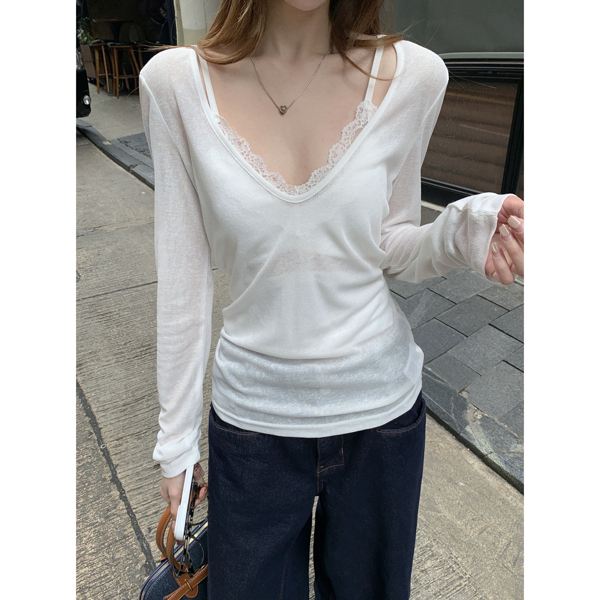 Реальный весенний и летний корейский темпераментный набор с v-образным вырезом солнцезащитный крем можно носить дикие футболки с длинными рукавами, женский тонкий топ 78067