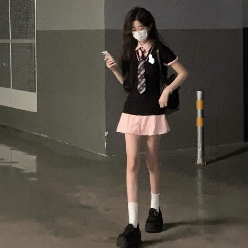 Летнее платье-поло для студенток 2025 года, модное, обтягивающее, двухслойное, с короткой юбкой и завышенной талией.