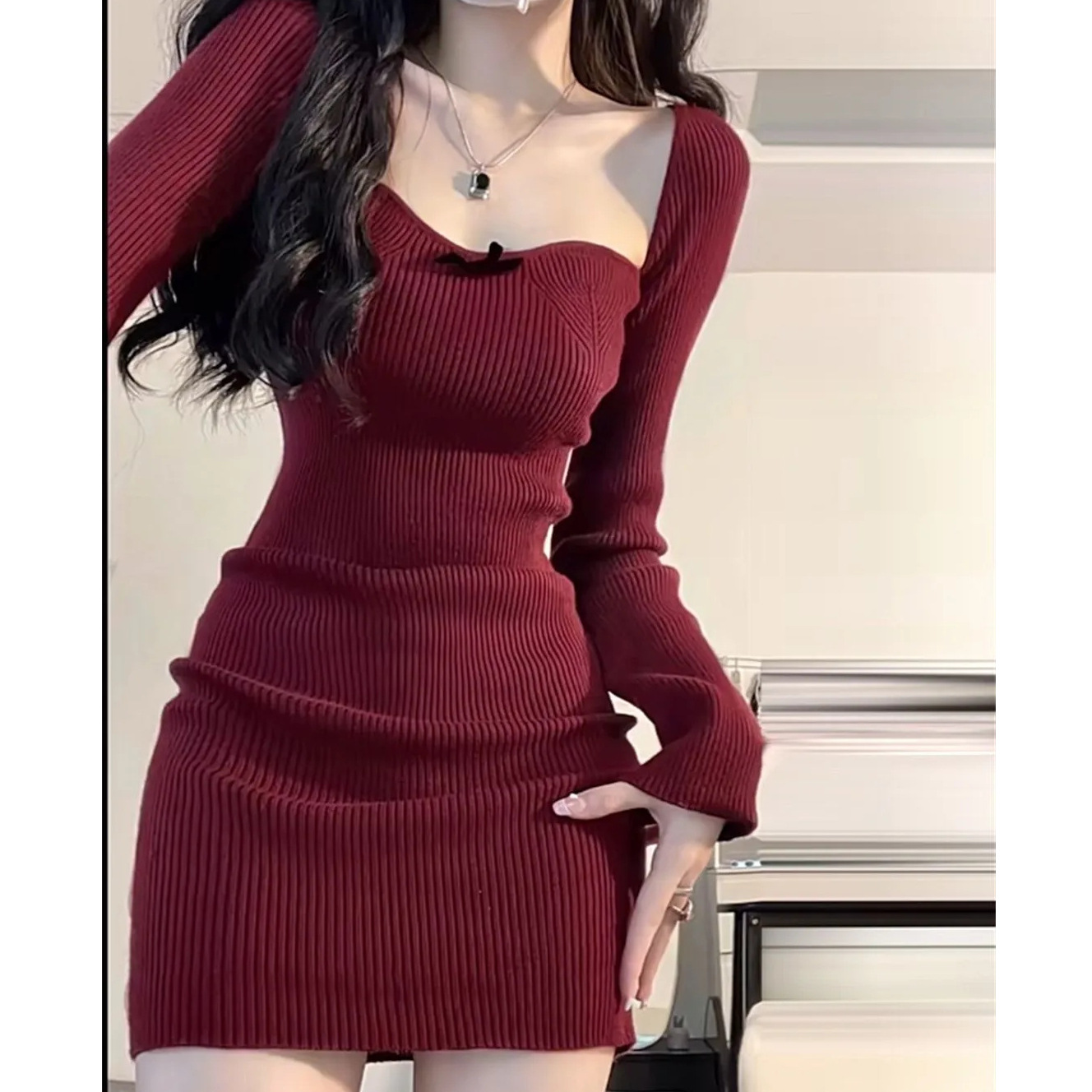 Главная страница > Вязаное платье с открытыми плечами с квадратным вырезом
