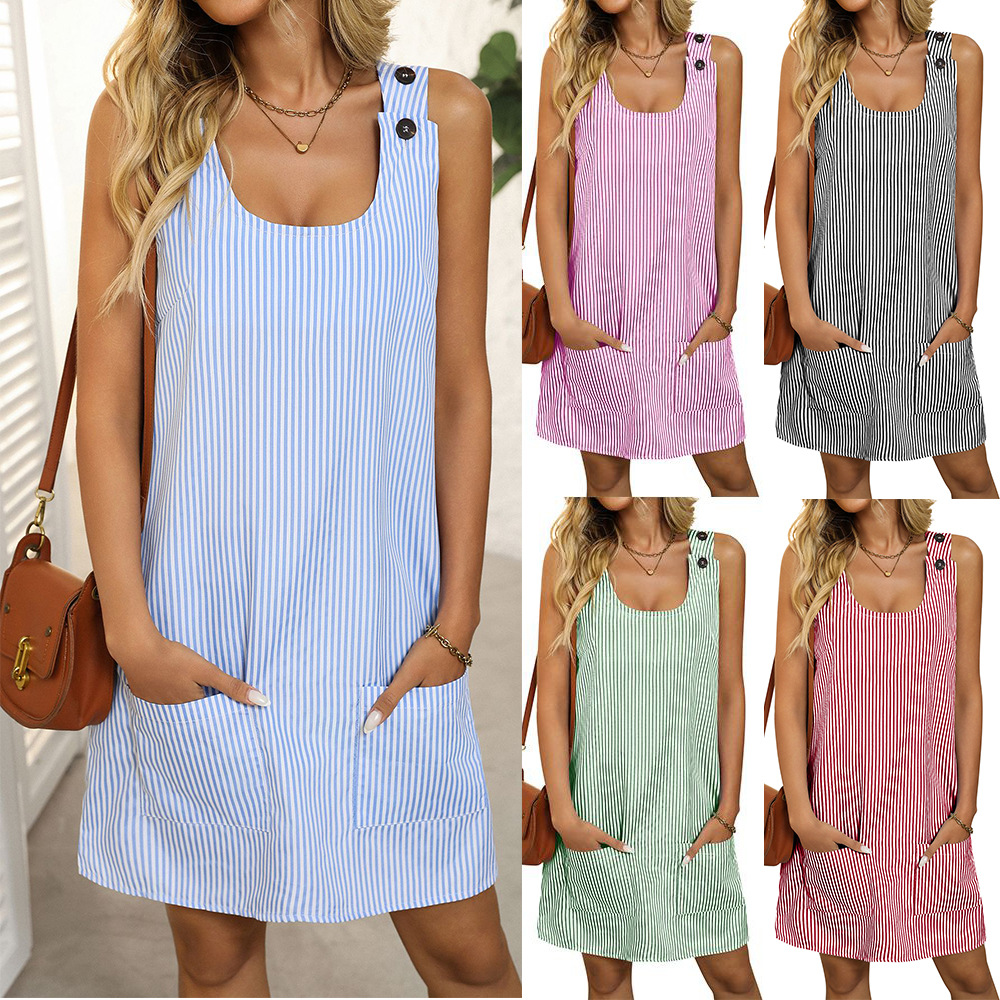 Главная страница > 2025 лето в Европе и Америке Amazon Независимая станция новый круглый вырез карманные полосатые пуговицы повседневное платье