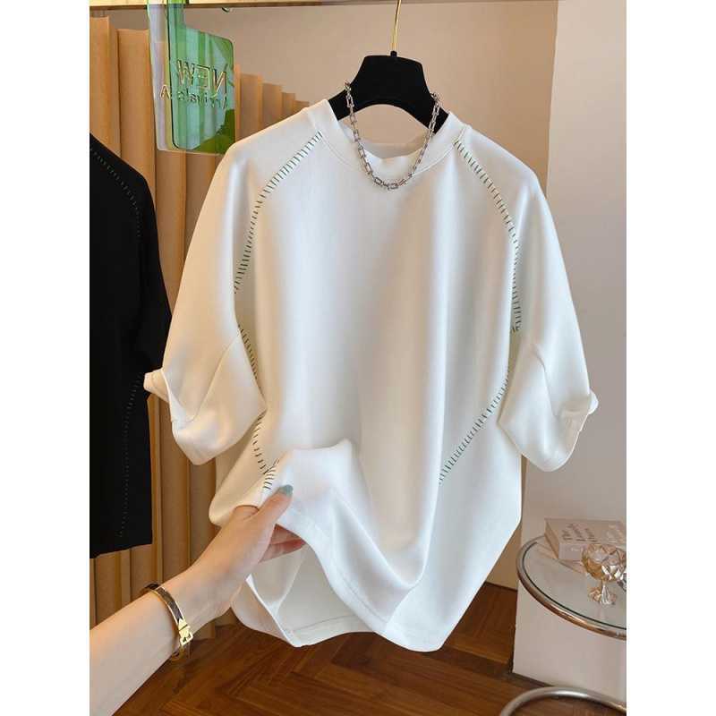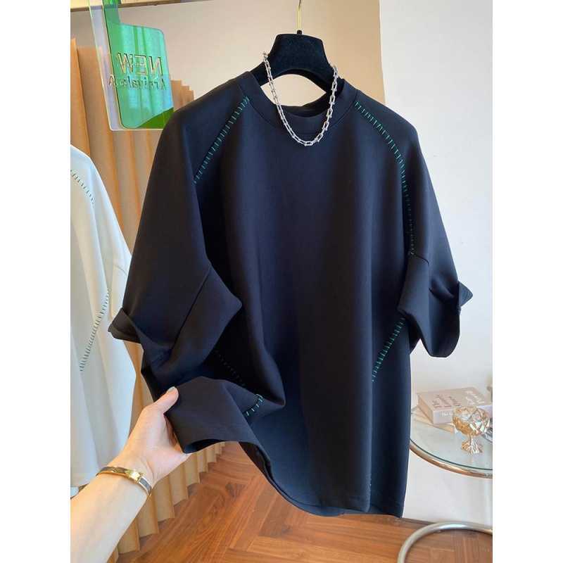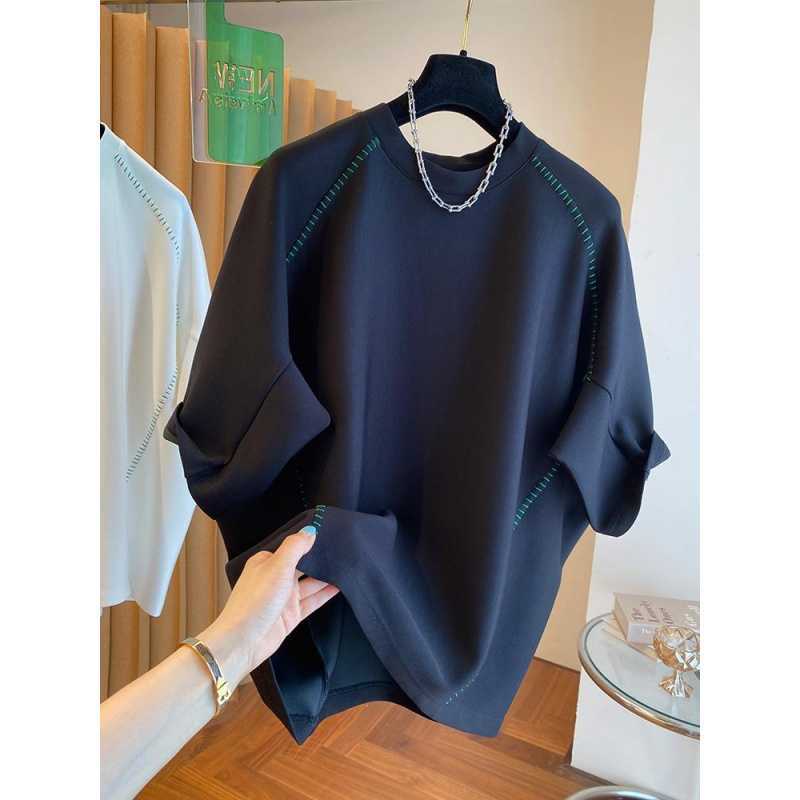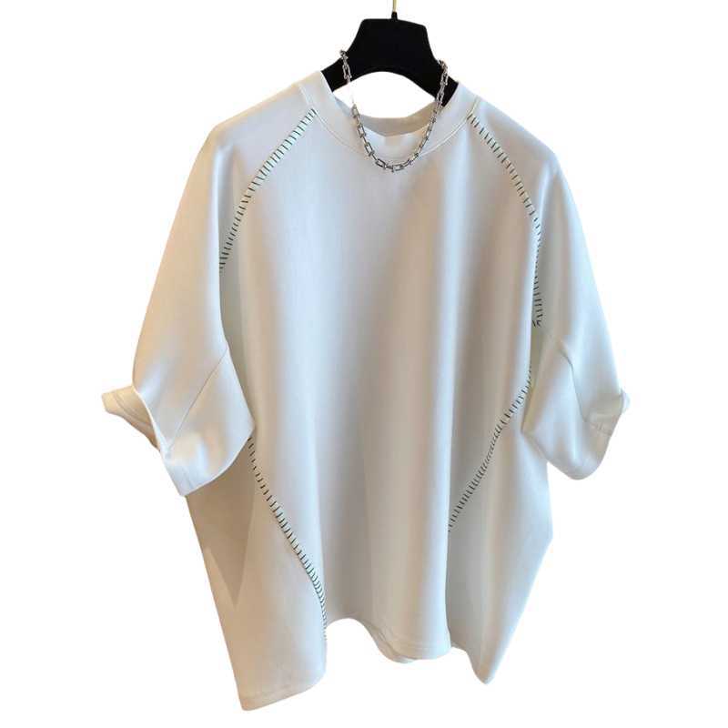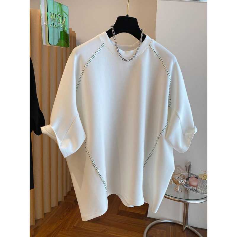 Главная страница > 2025 Европейский новый стиль, доступная роскошная свободная повседневная футболка с верхней строчкой, женская футболка с короткими рукавами, большая версия, рубашка в форме летучей мыши, летний топ