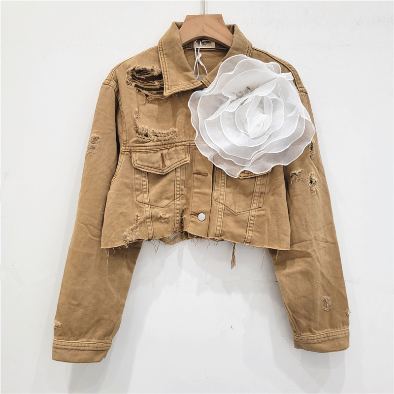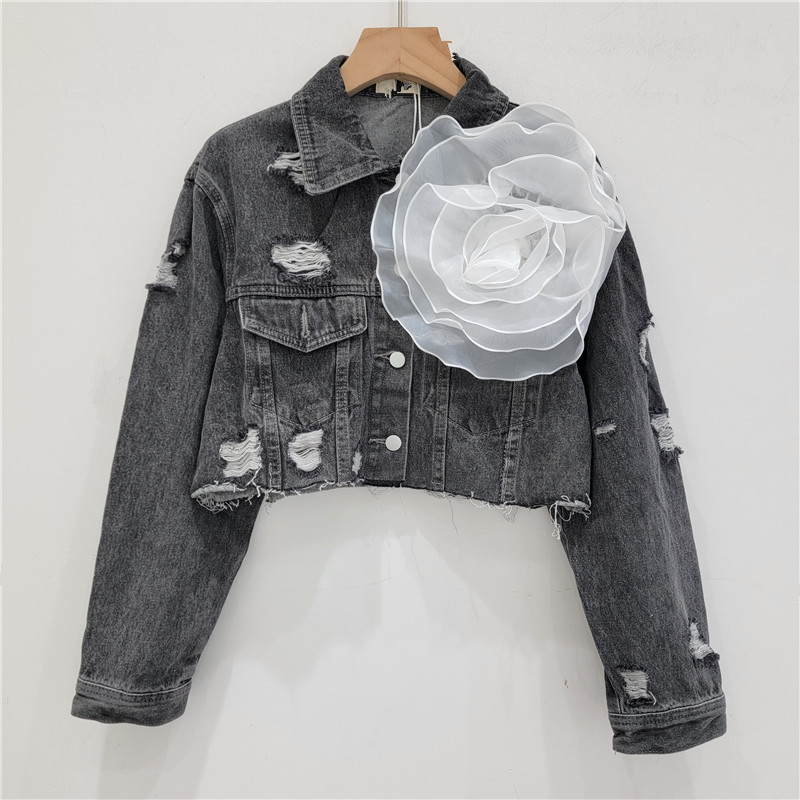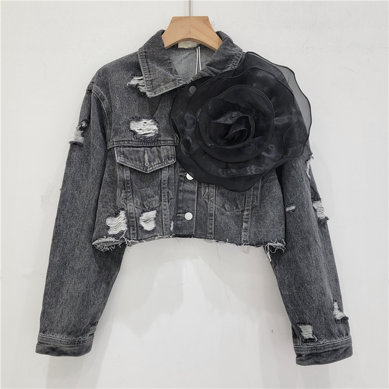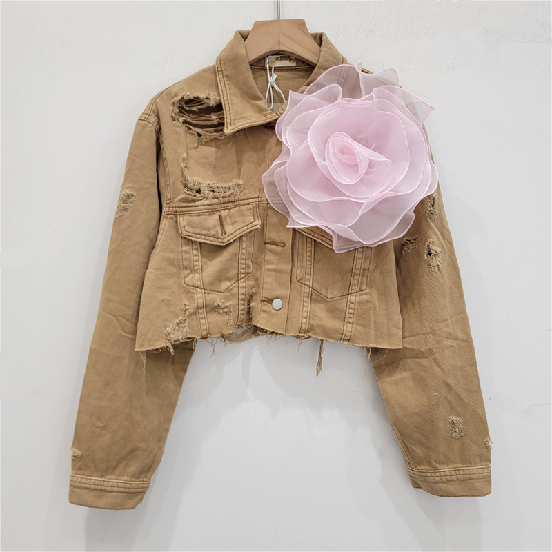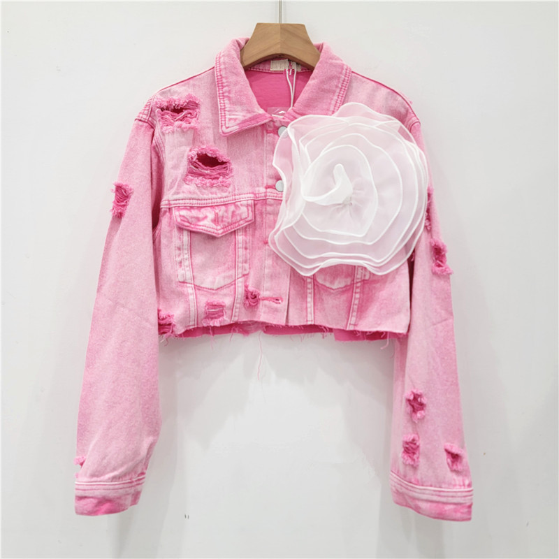 Трехмерная цветочная мода, окрашенная в розовый цвет, индивидуальная дыра, розовая иностранная розовая короткая джинсовая куртка