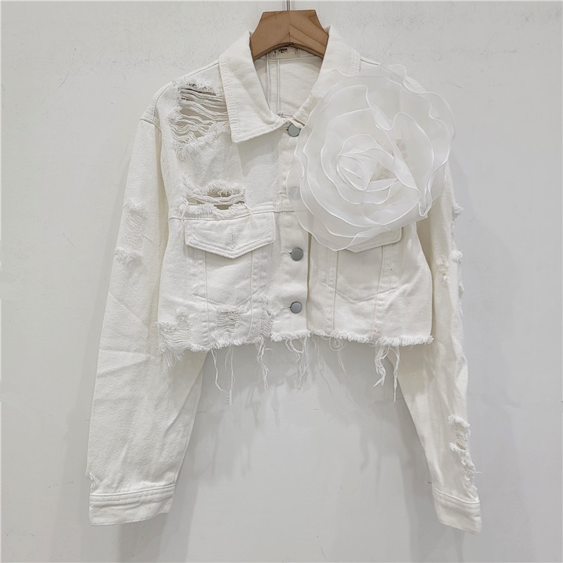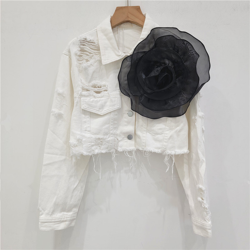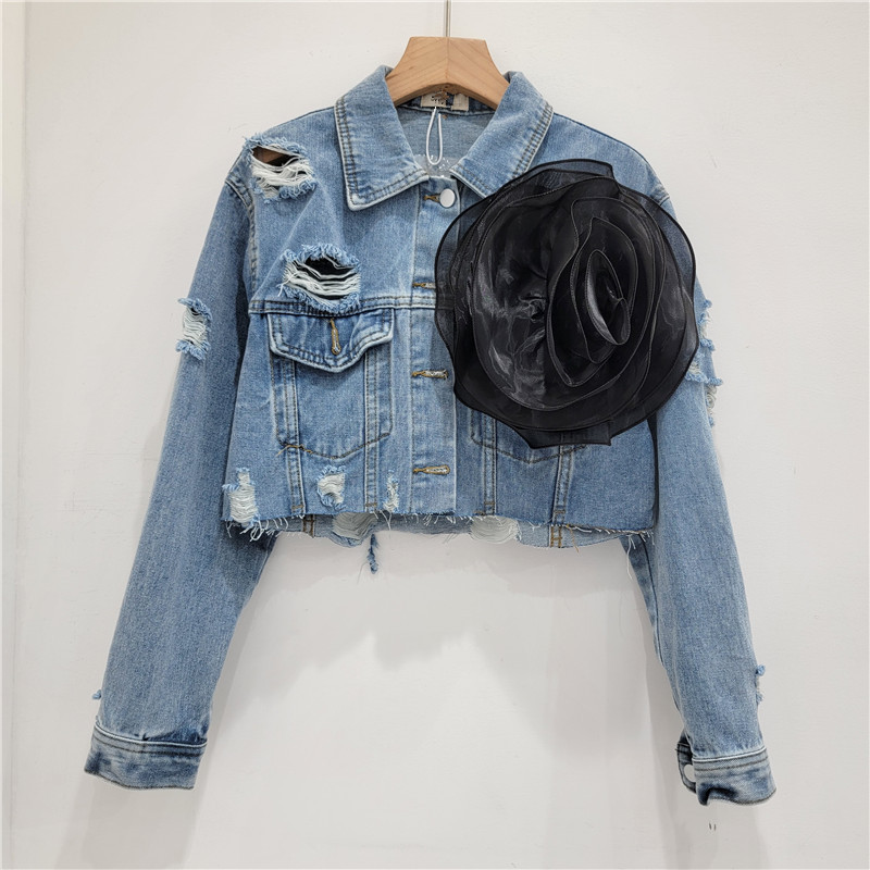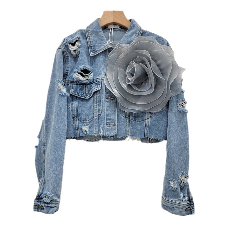 Главная страница > Трехмерная цветочная мода, окрашенная в розовый цвет, индивидуальная дыра, розовая иностранная розовая короткая джинсовая куртка