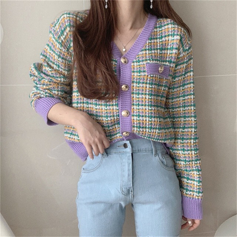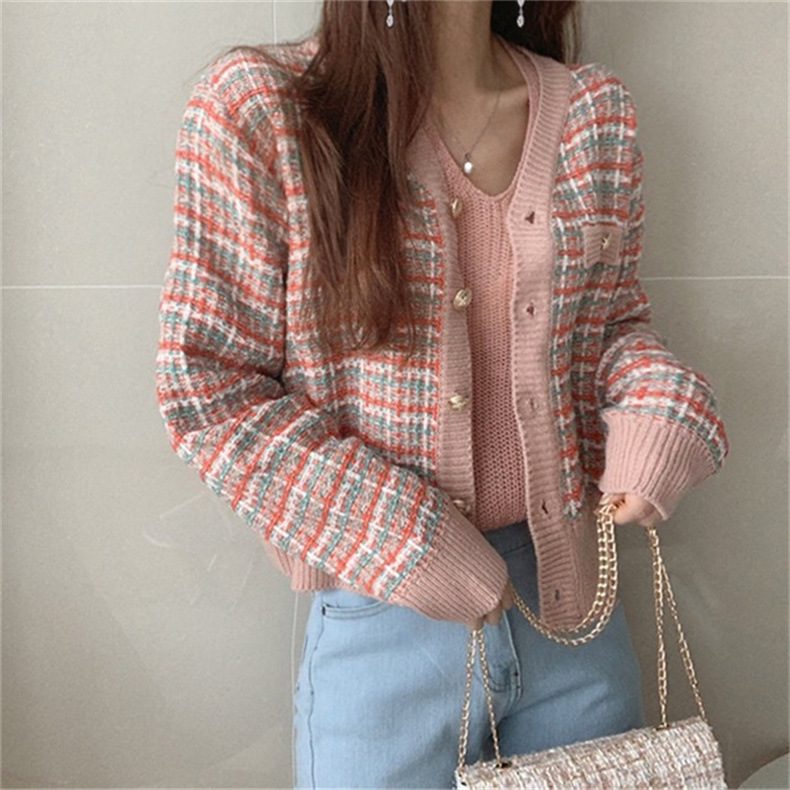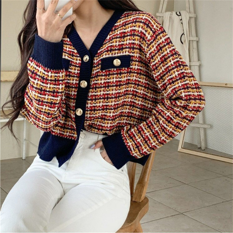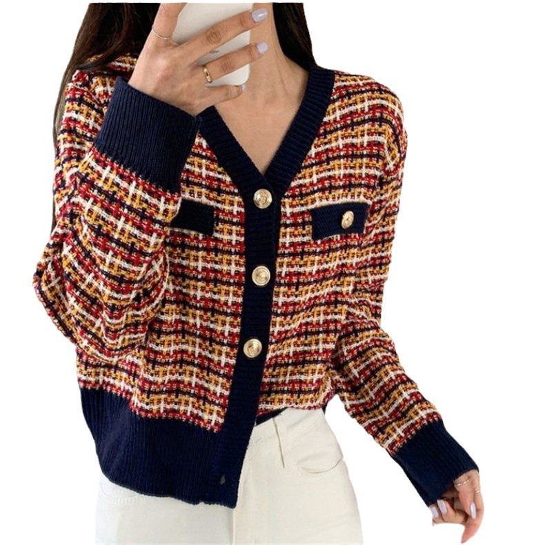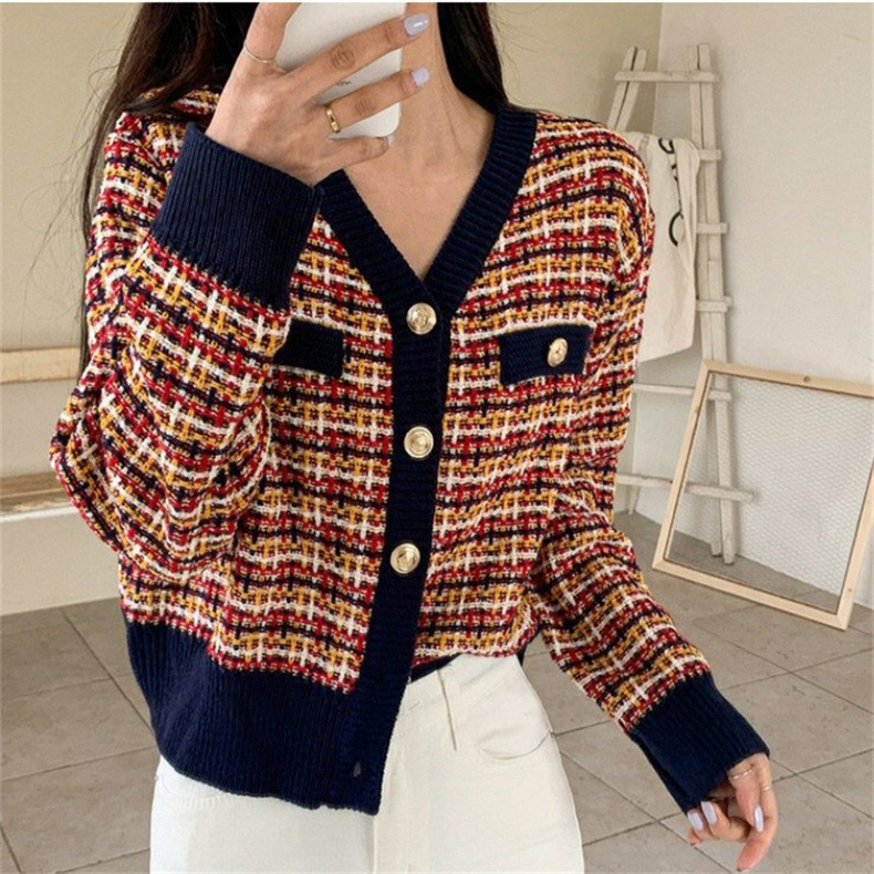 Главная страница > Корейский маленький ароматный цвет с V-образным вырезом трикотажный кардиган 2025 весна и осень новый стиль ретро короткий свитер куртка женский