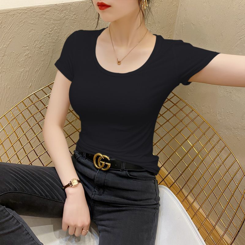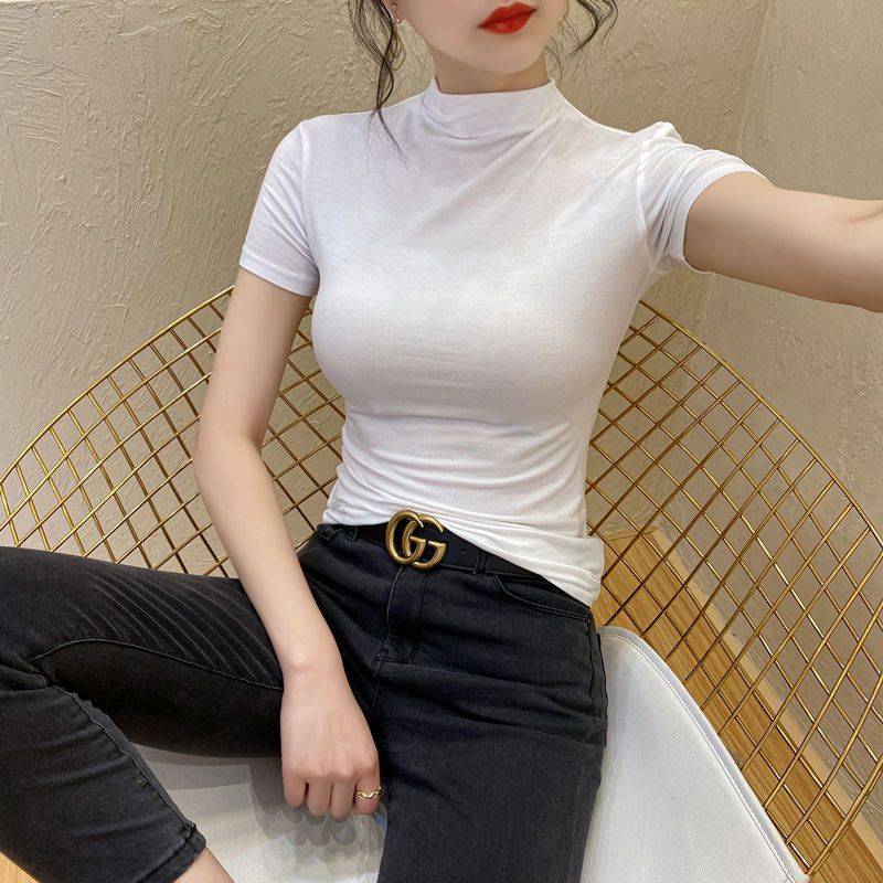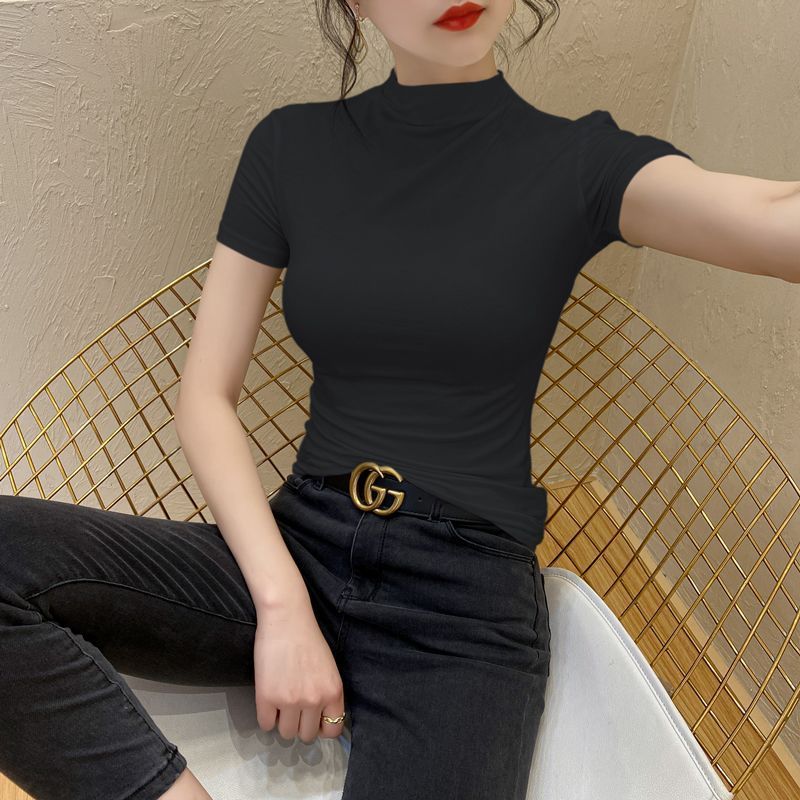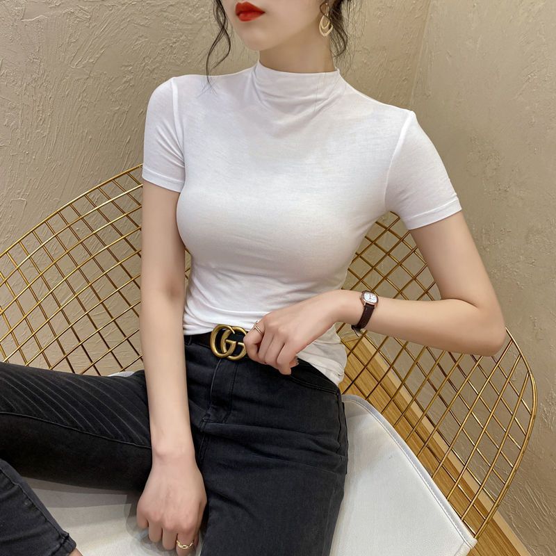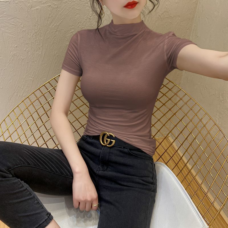 Главная страница > Женская футболка с высоким воротником, темно-серая, с короткими рукавами, весенне-летняя, из модала, хлопка, облегающая рубашка с внутренней и внешней нижней частью, женский новый стиль