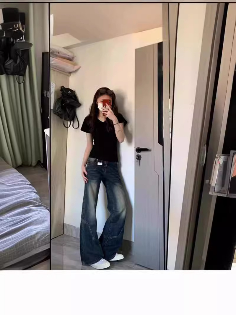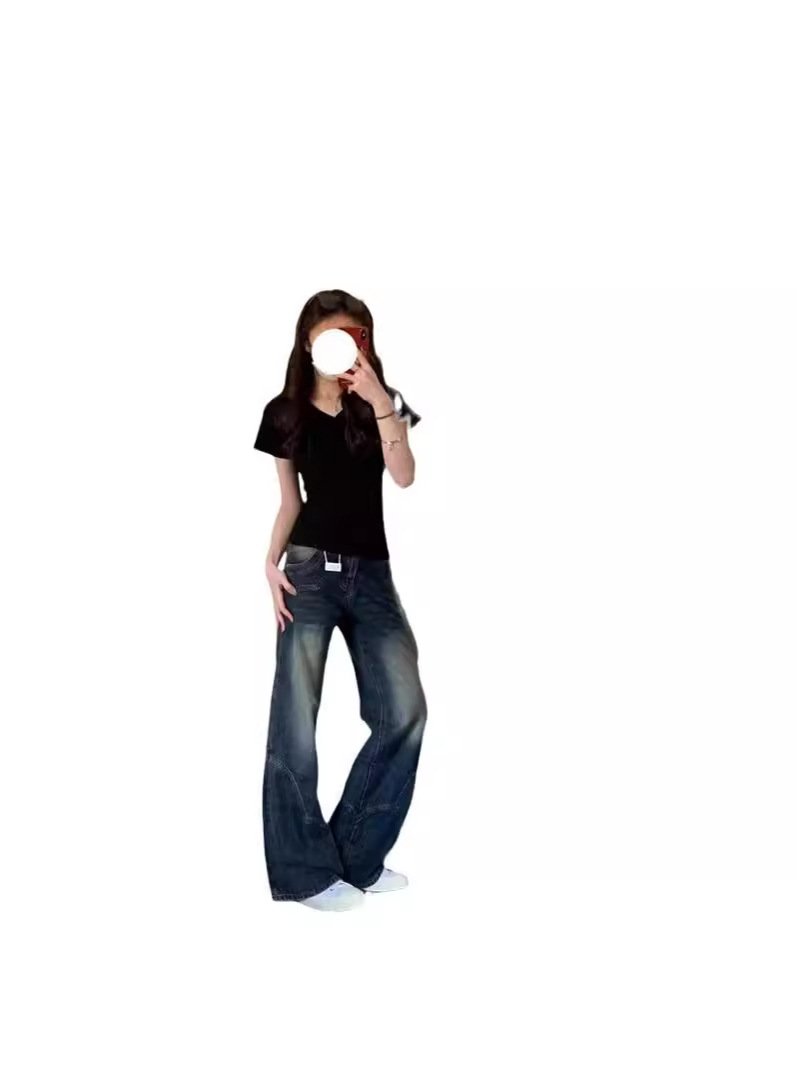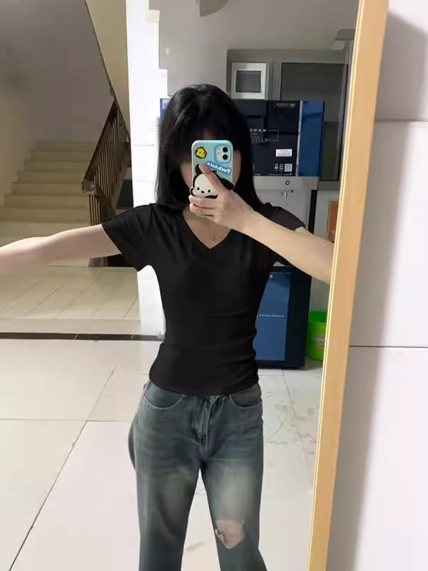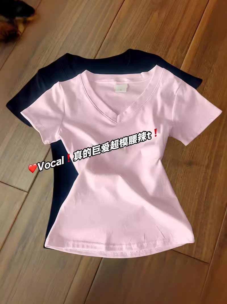Главная страница > Розовая футболка с короткими рукавами летняя плечевая v-образная улитка летом 2024 новая горячая девушка талия американский сплошной топ тонкий