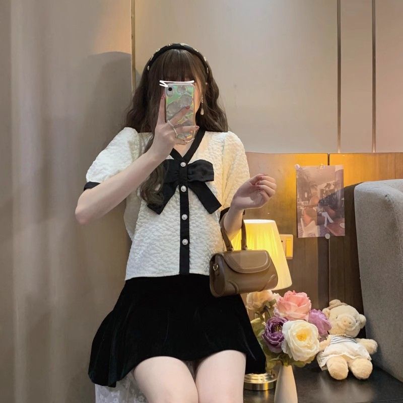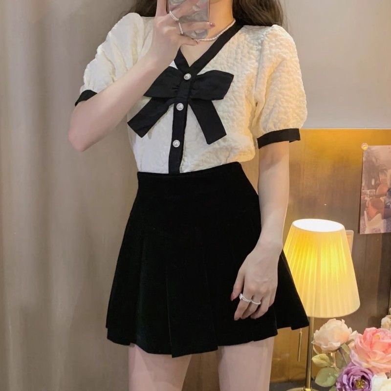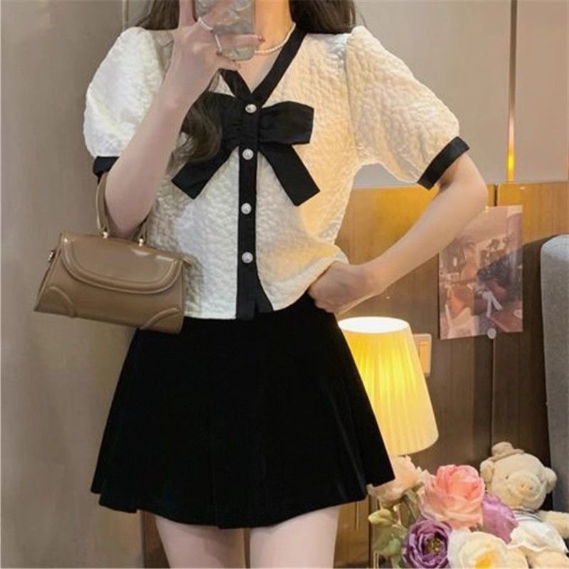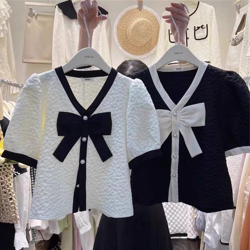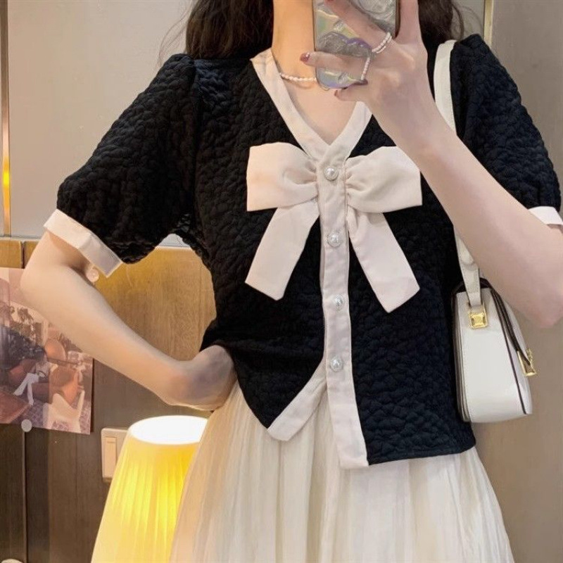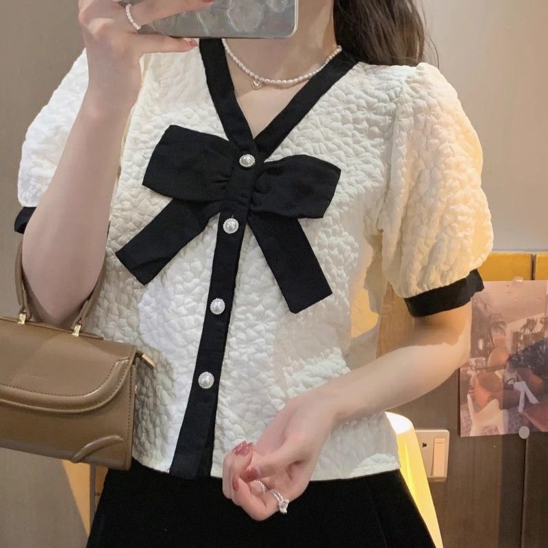 Главная страница > Французский стиль, милый бант, новый дизайн, шикарная рубашка с v-образным вырезом и пышными рукавами, женская футболка с короткими рукавами, топ