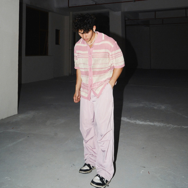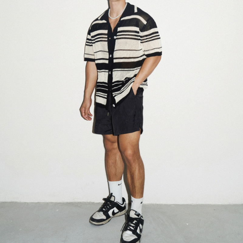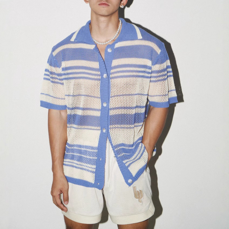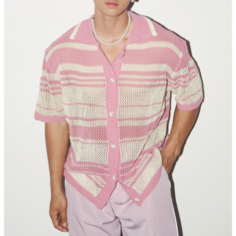 Главная страница > 2025 Американский повседневный свободный короткий вязаный кардиган для мужчин, летний модный брендовый лацкан с вырезом, нишевая полосатая рубашка