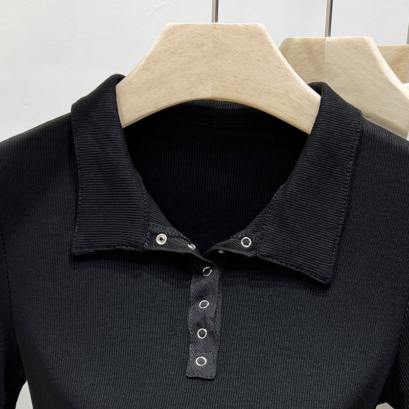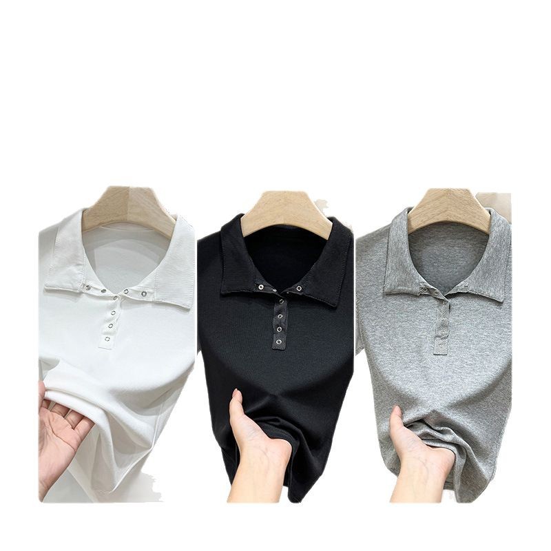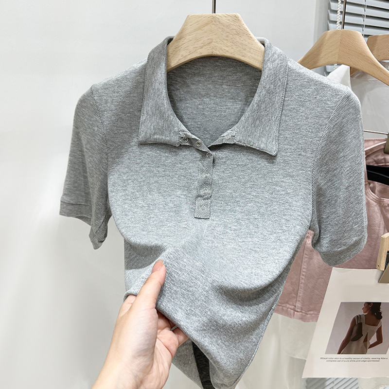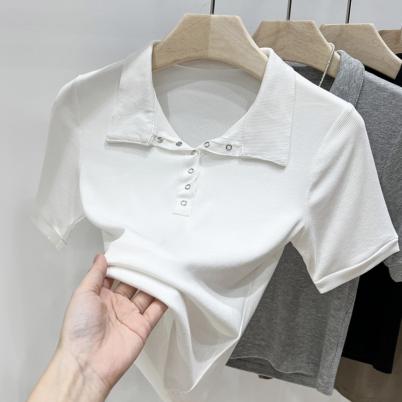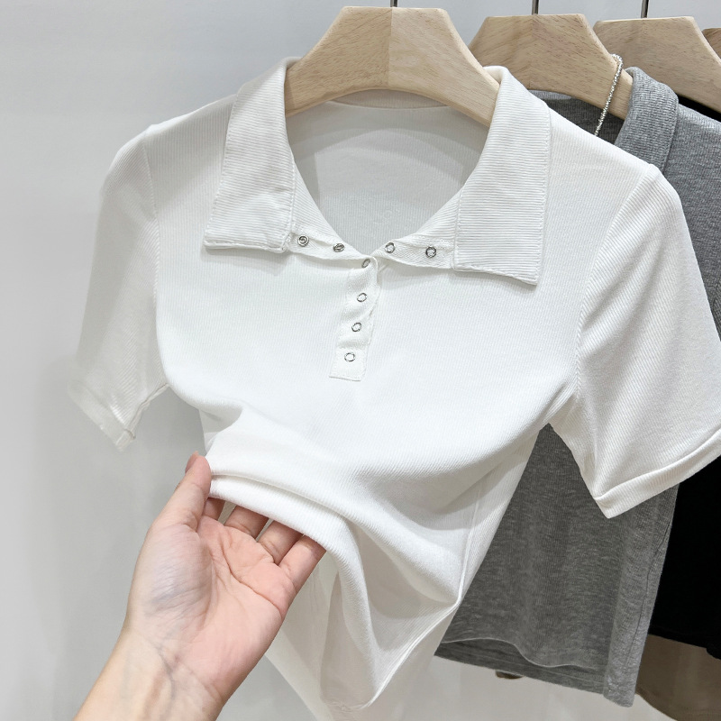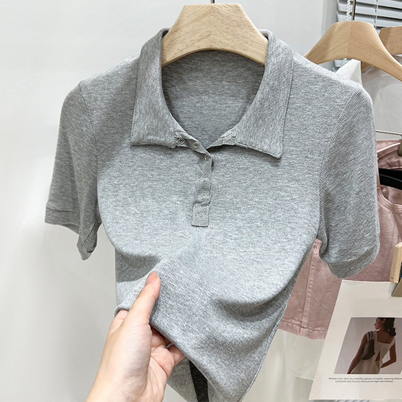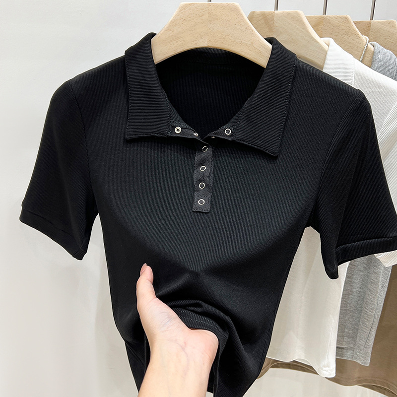 Главная страница > Футболка с воротником polo женская короткая рукава 2025 новая женская мода сплошной цвет хлопчатобумажная рубашка темперамент короткая талия топ