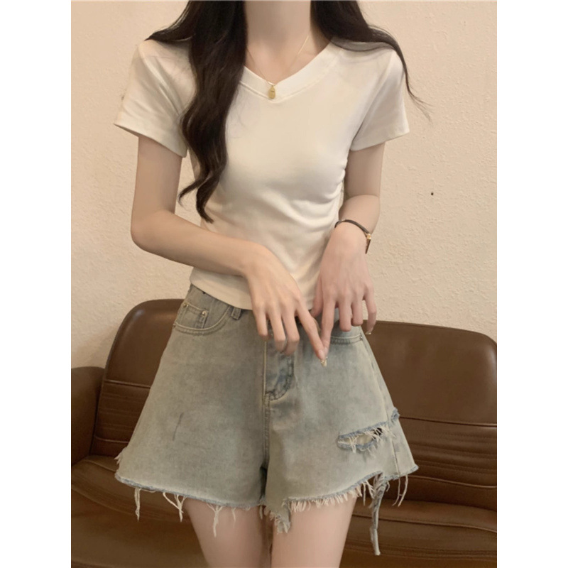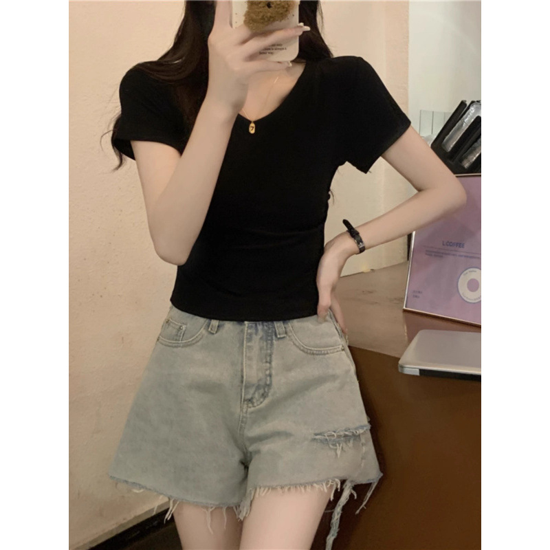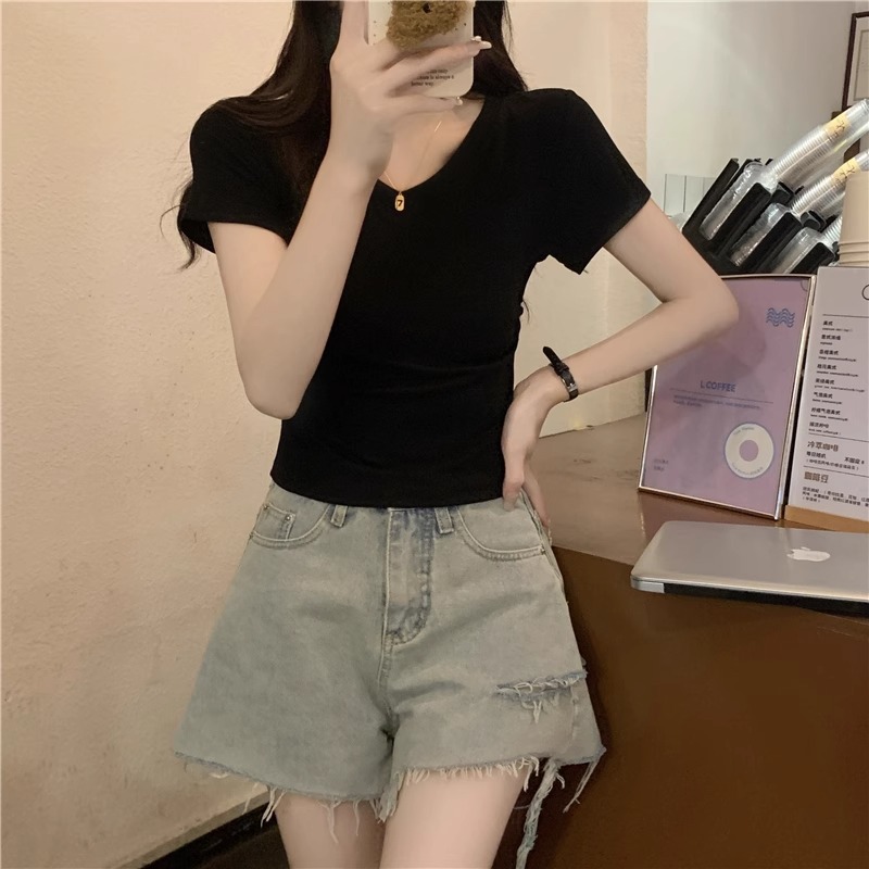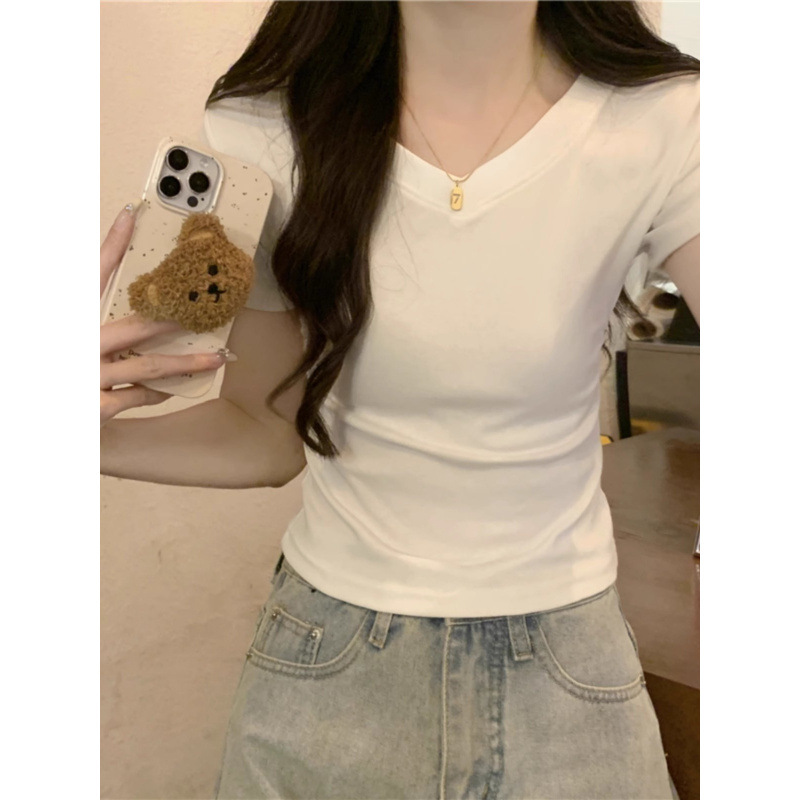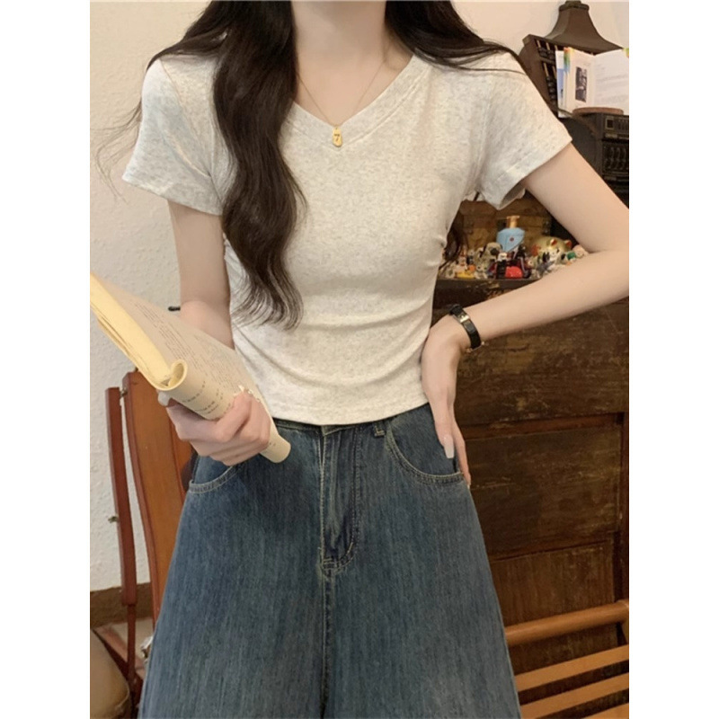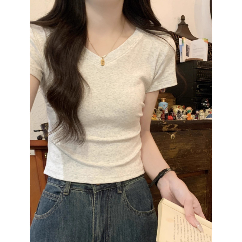 Главная страница > [Горячая распродажа в магазине] Серая футболка из чистого хлопка с v-образным вырезом на правое плечо, женская летняя облегающая футболка с короткими рукавами, асимметричный дизайн, ниша