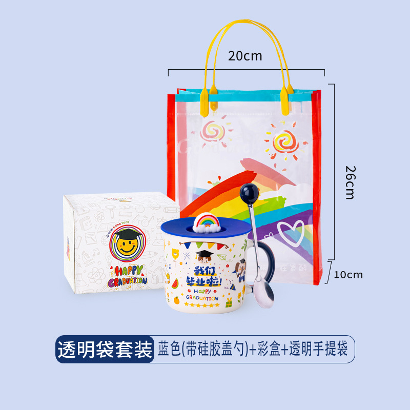 61 Happy (чашка из искусственной эмали синяя с силиконовой крышкой-ложкой) + цветная коробка + прозрачная сумочка