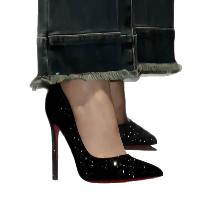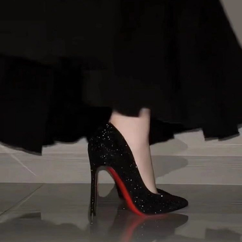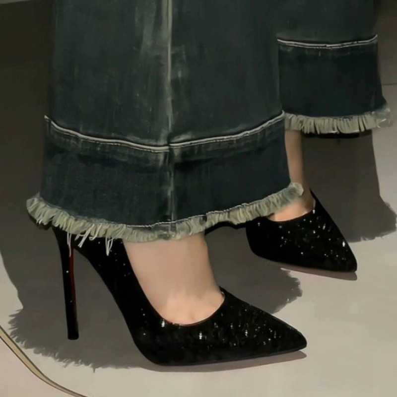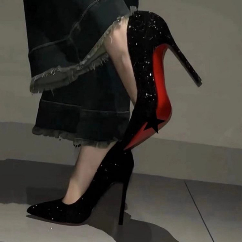 Главная страница > Туфли на высоком каблуке, красная подошва, полностью инкрустированные стразами, черные туфли-лодочки с заострённым носком, шпильки, стразы, блестки, высокие каблуки, женская обувь весна-осень 2025 года