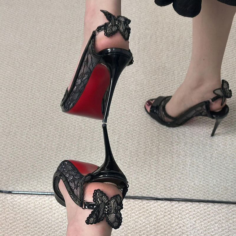 Главная страница > 2025 лето новый рыбий рот кружевной черный туфли на высоком каблуке женский каблук сексуальная сестра бабочка с сандалиями