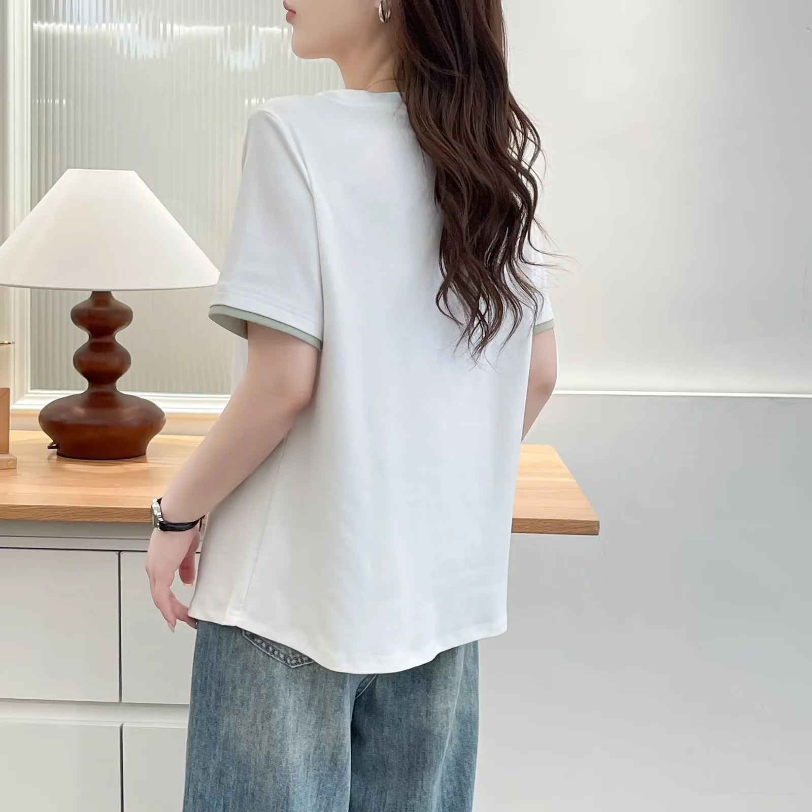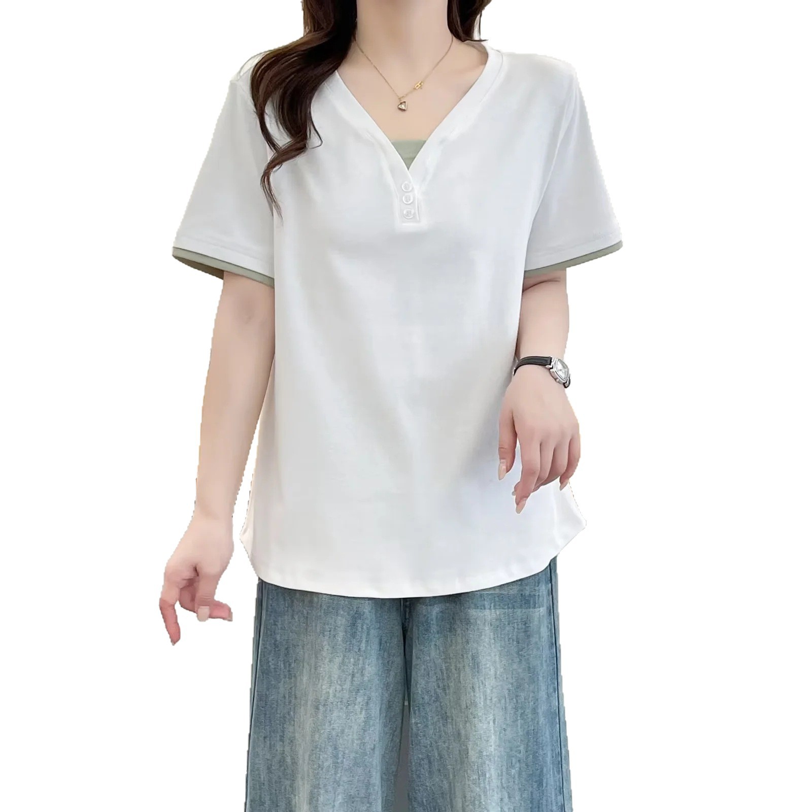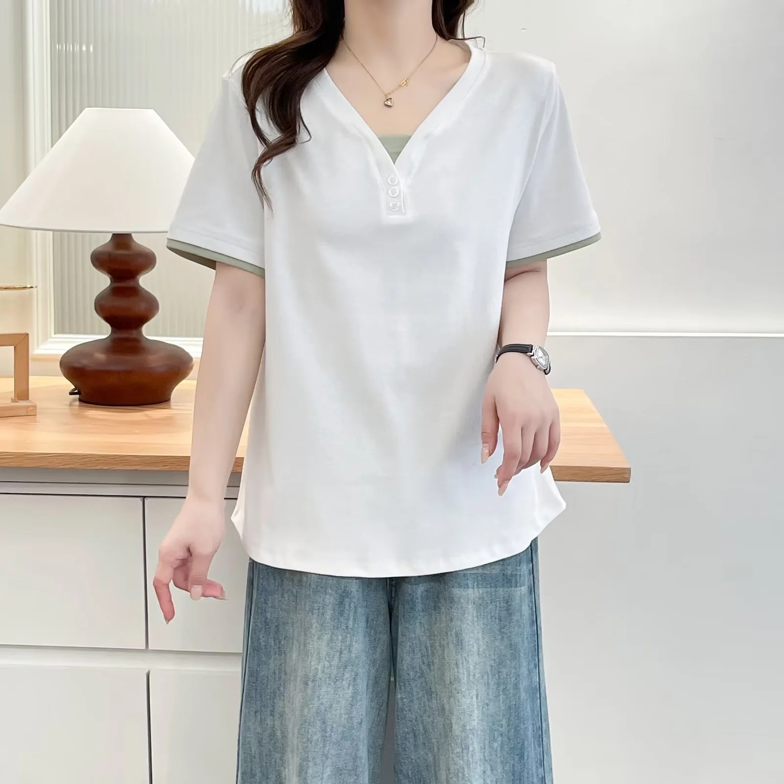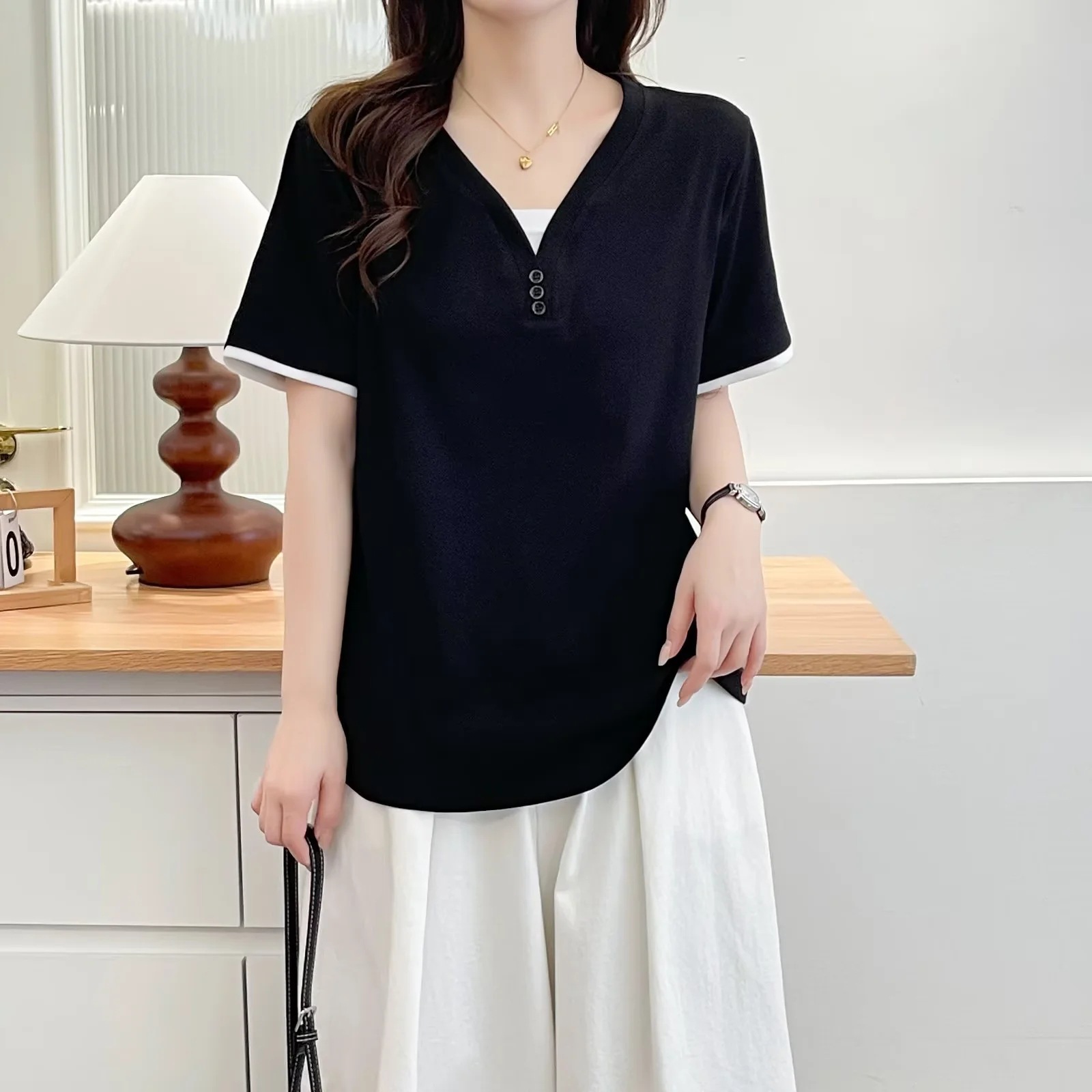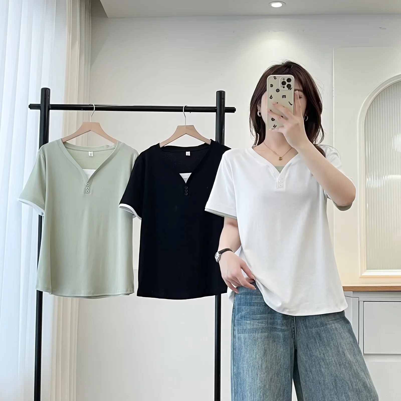 2025 Весна Новинка Женская мода больших размеров с v-образным вырезом, однотонная футболка с обычными плечами, имитация двух частей, с короткими рукавами H682543.